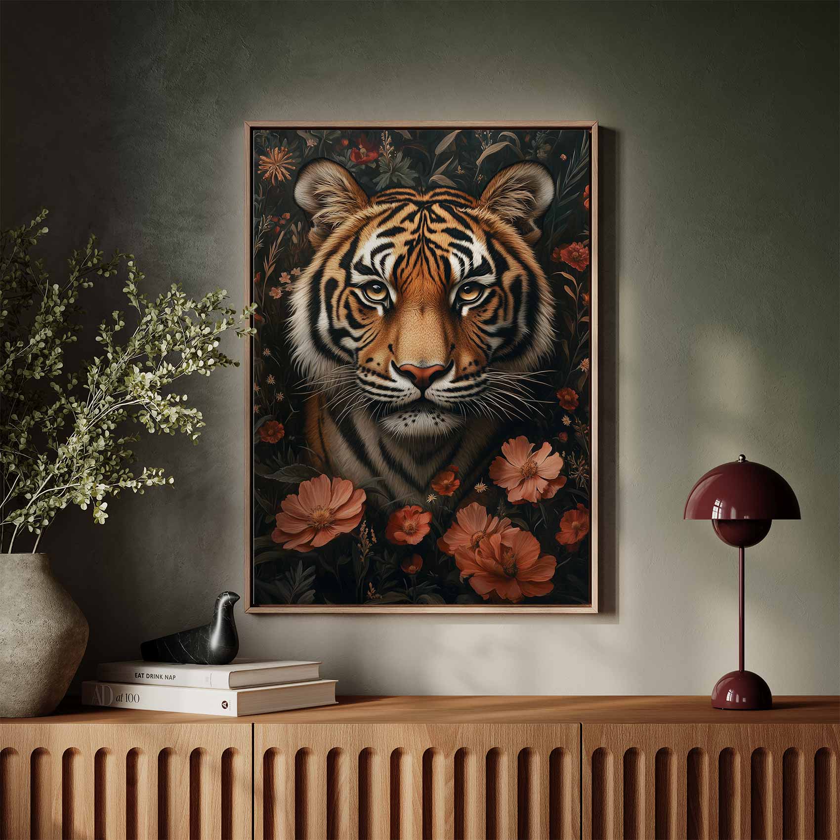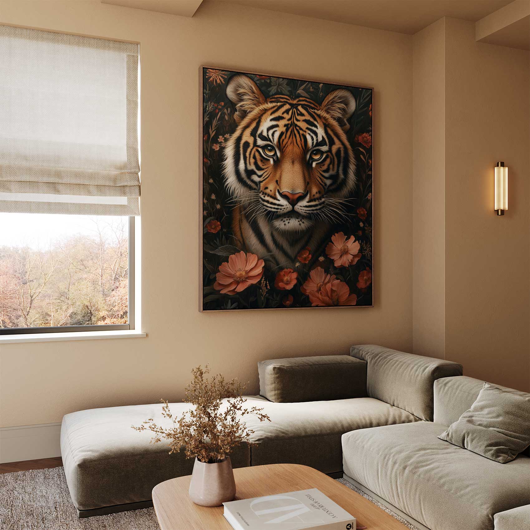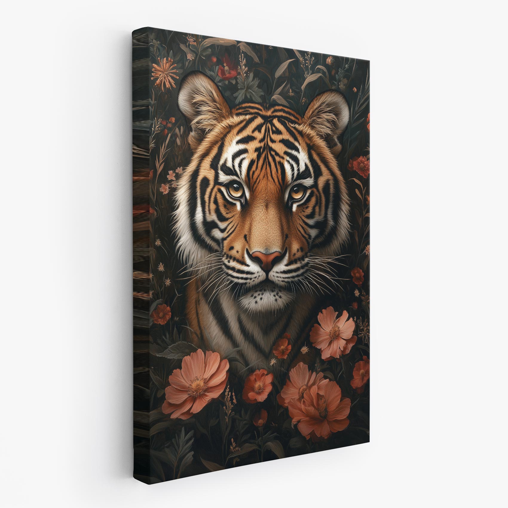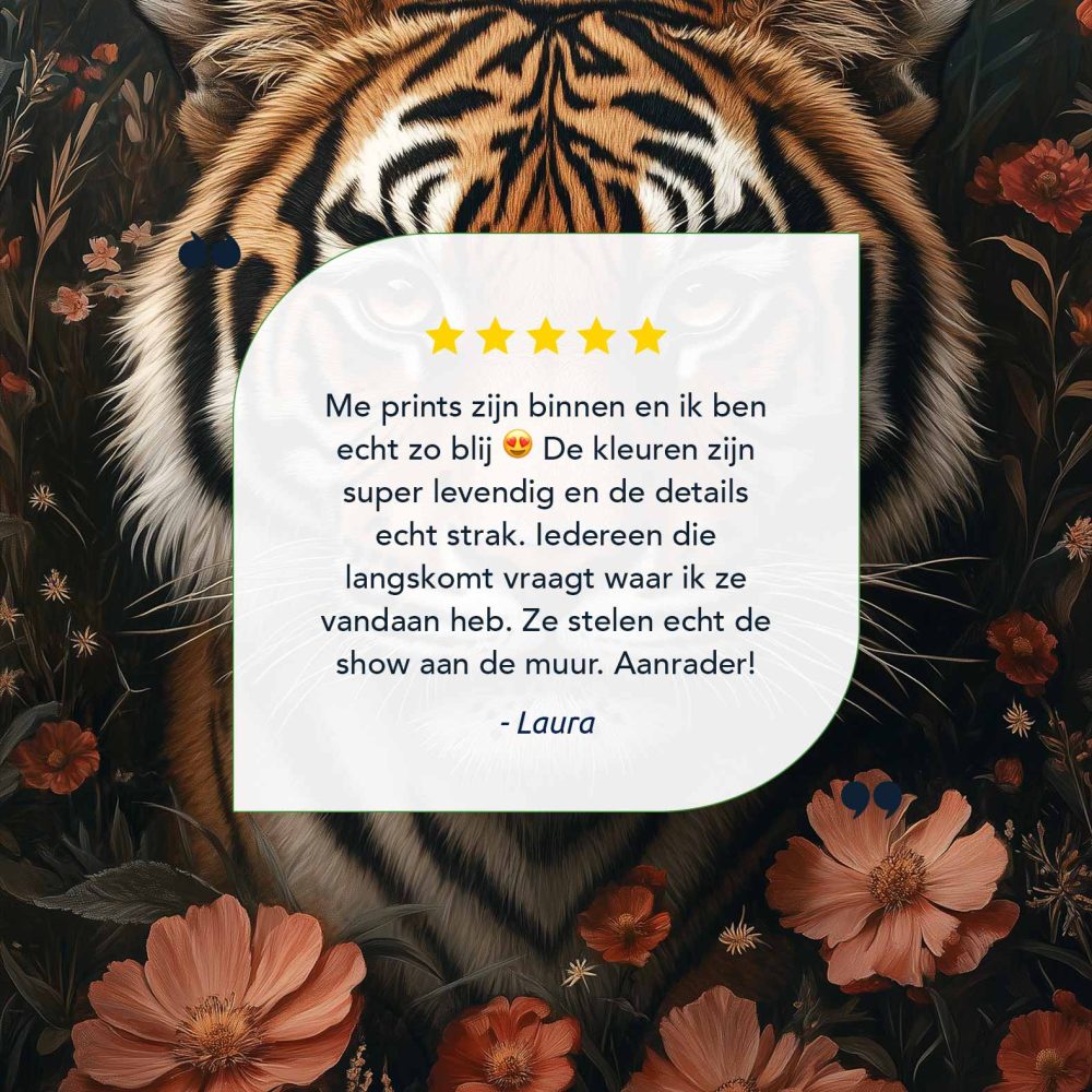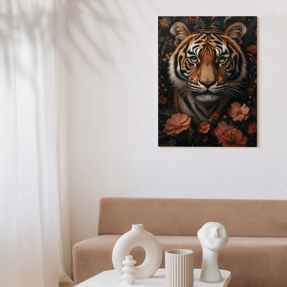 Terug naar collectie / Schilderijen / Bloemen Schilderij / Tijger in kleurrijke bloementuin
