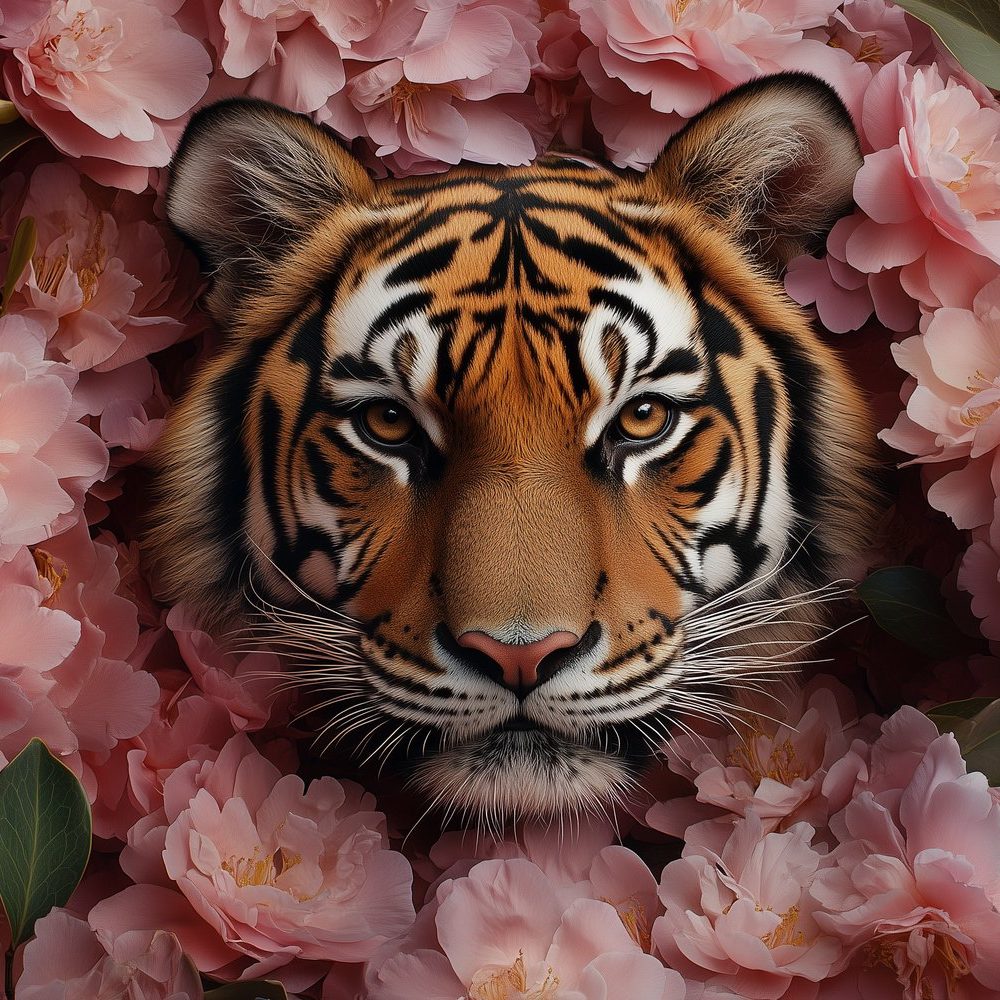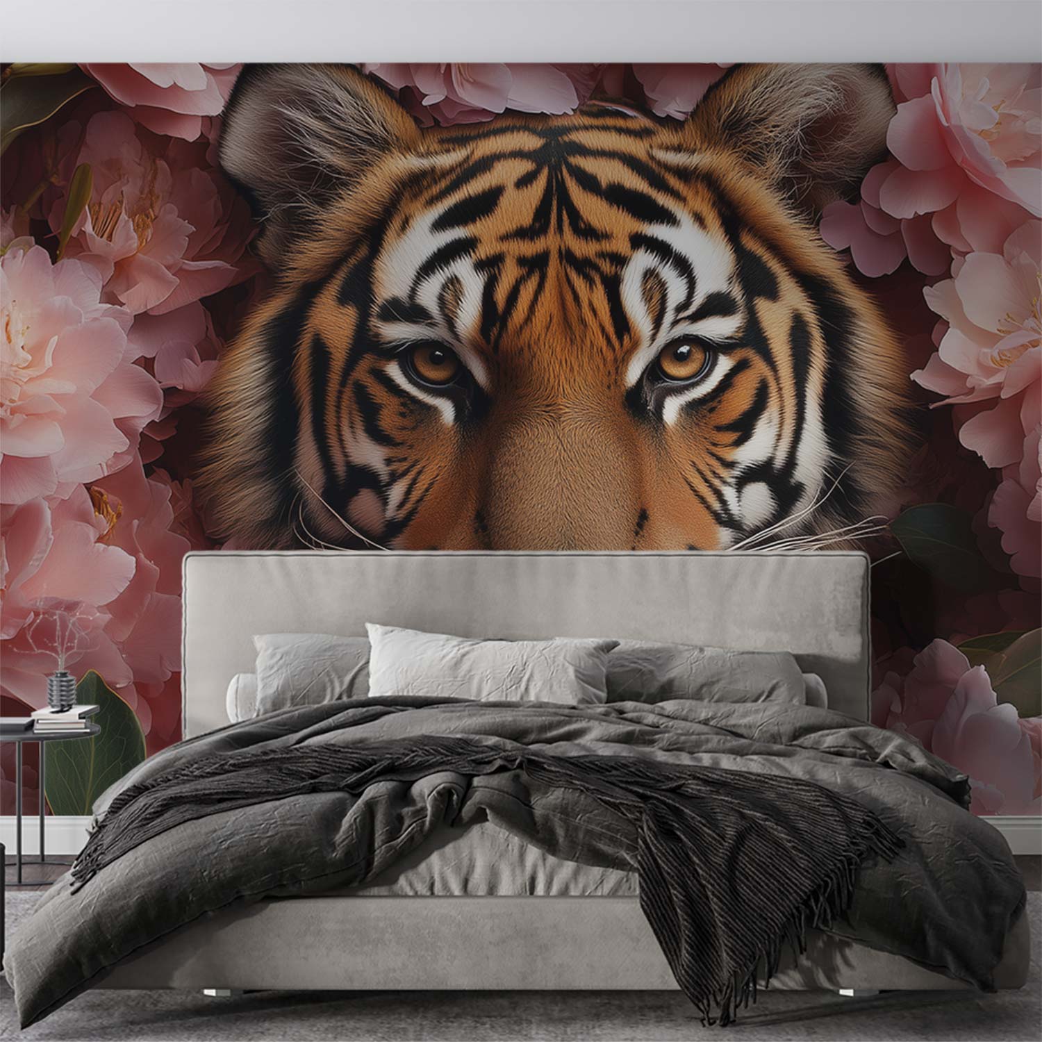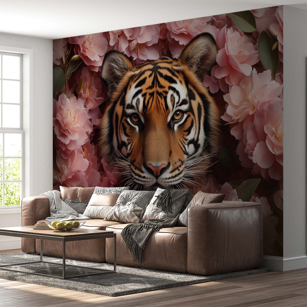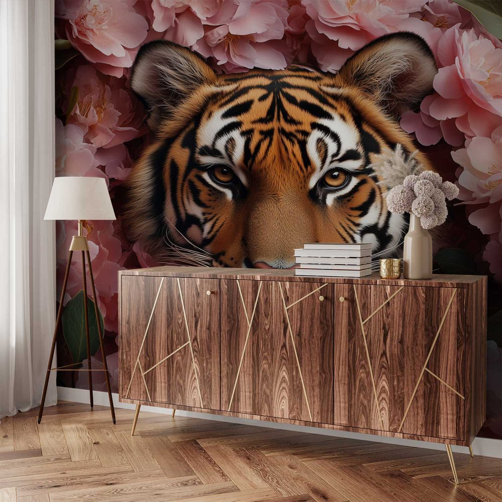 Terug naar collectie / Behang / Tijger in roze bloemen behang