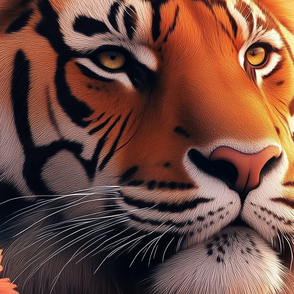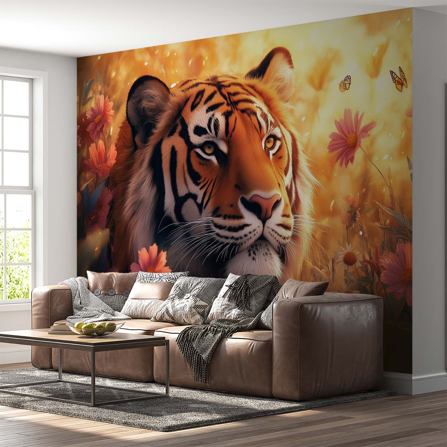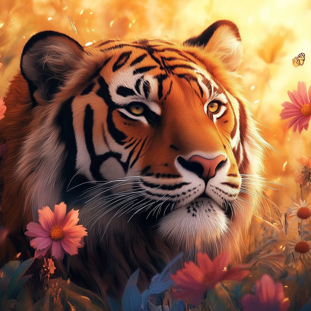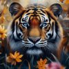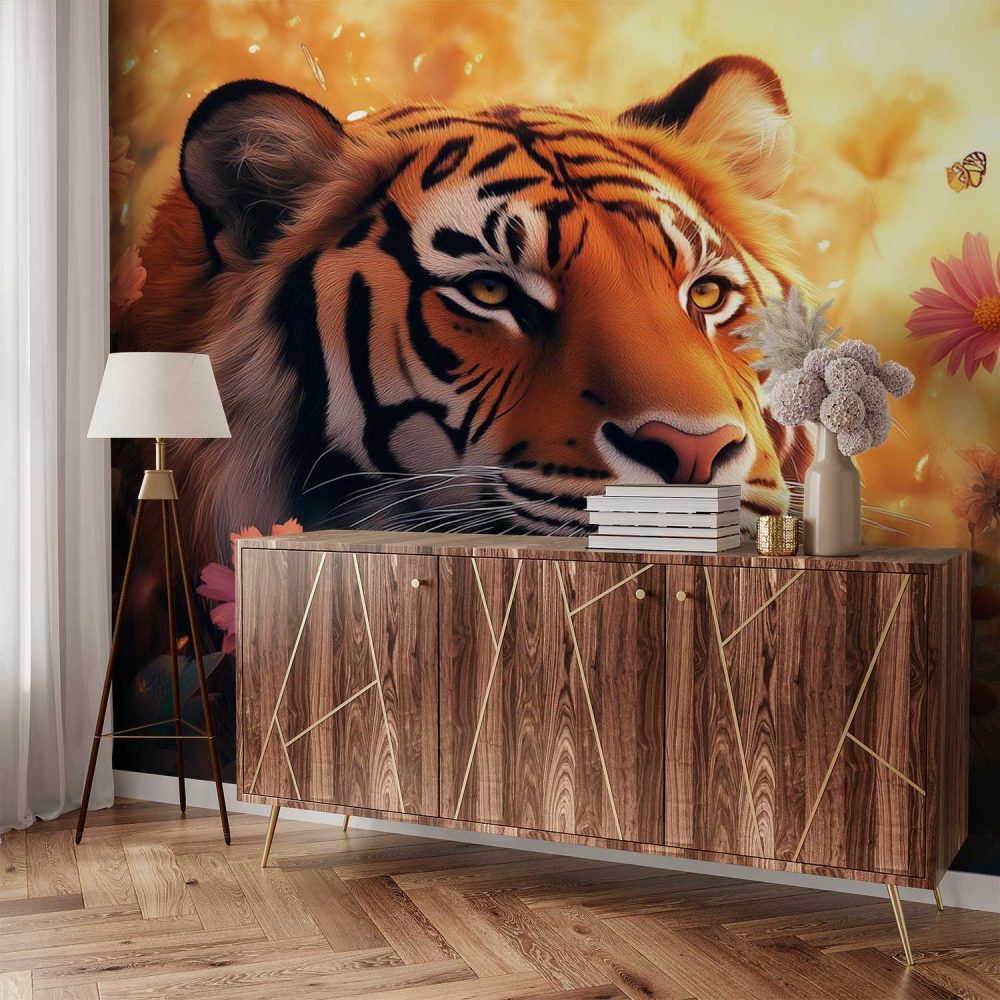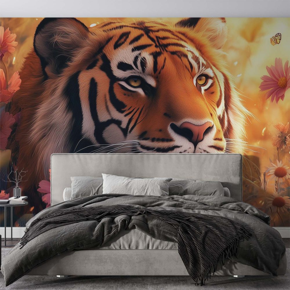 Terug naar collectie / Behang / Tijger tussen bloeiende bloemen behang