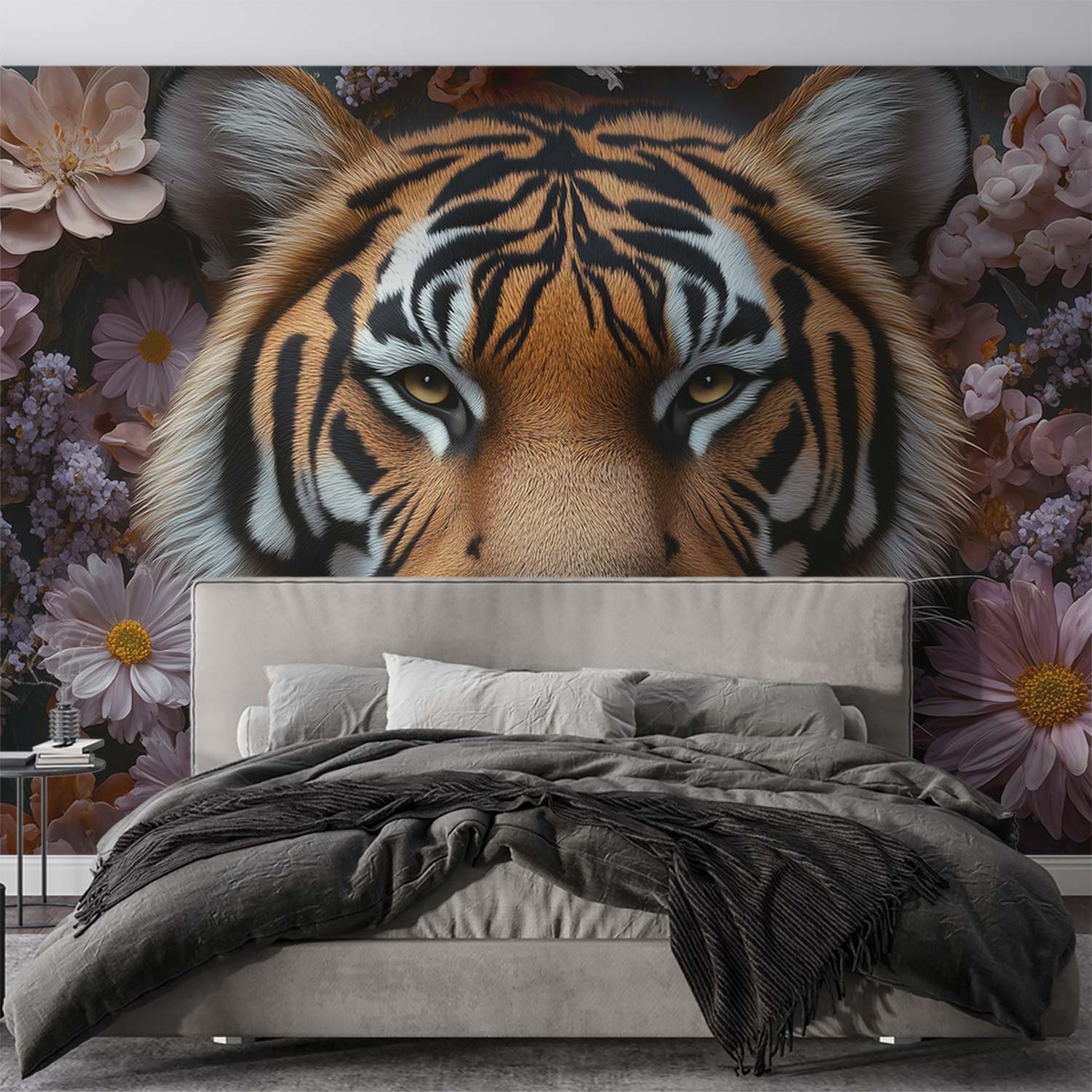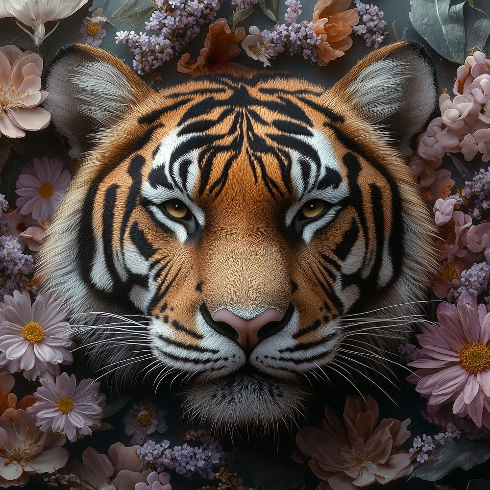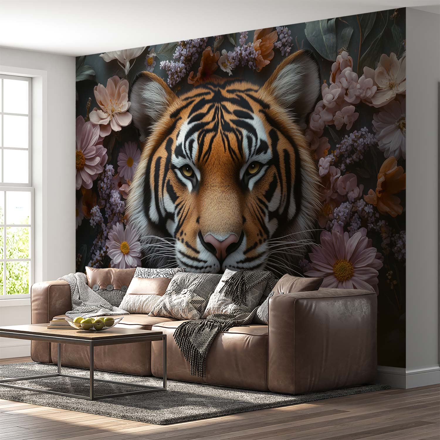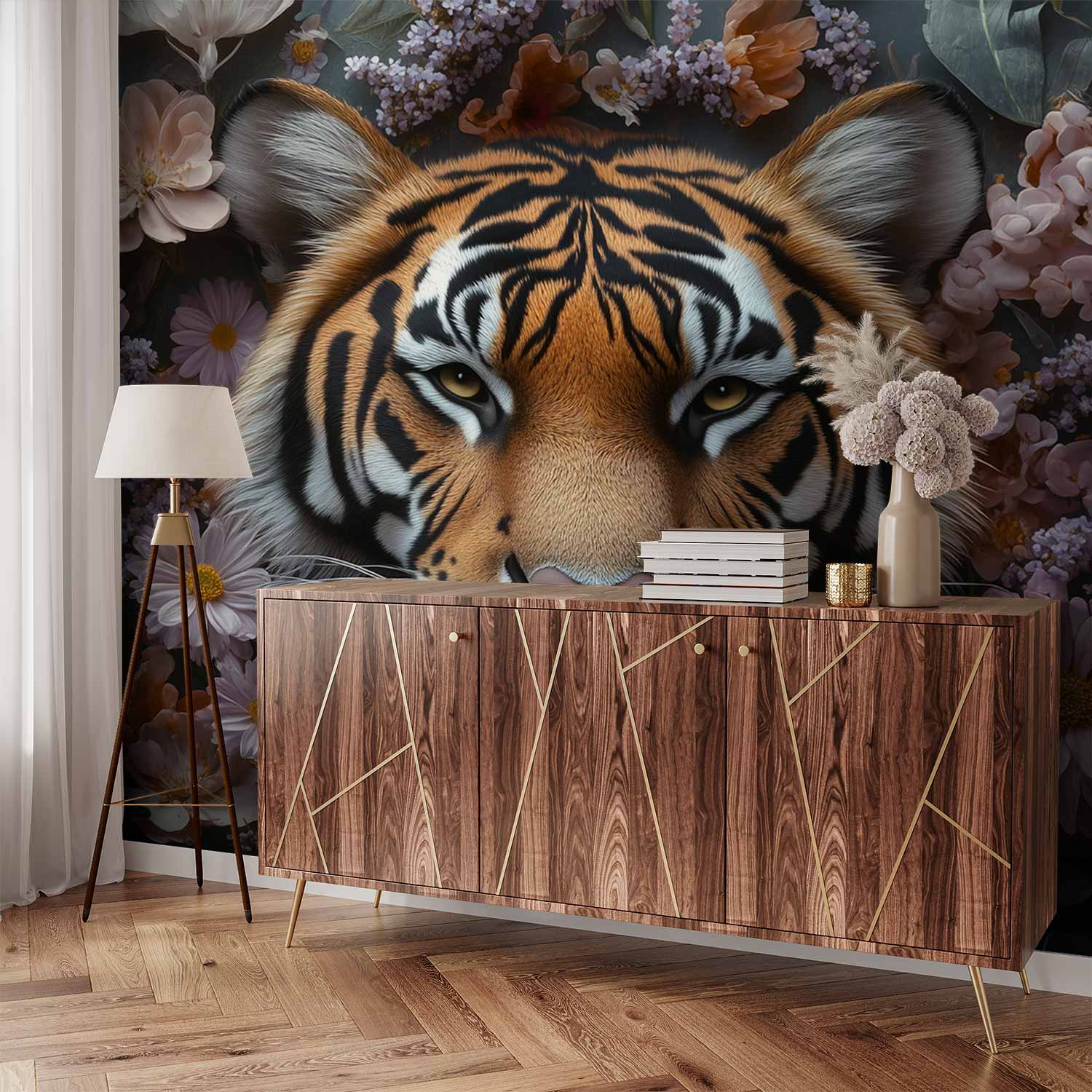Terug naar collectie / Behang / Tijger tussen bloemenpracht behang
