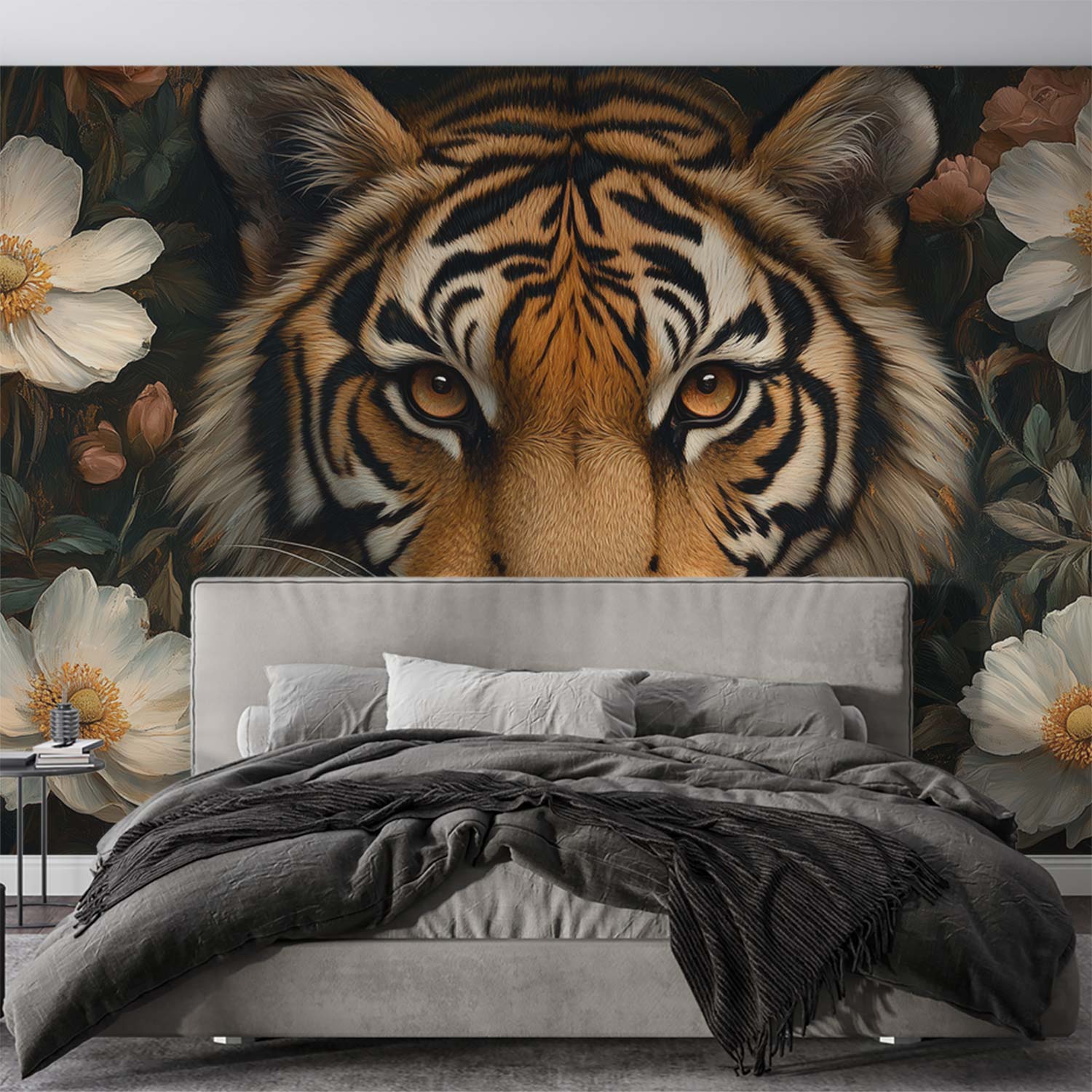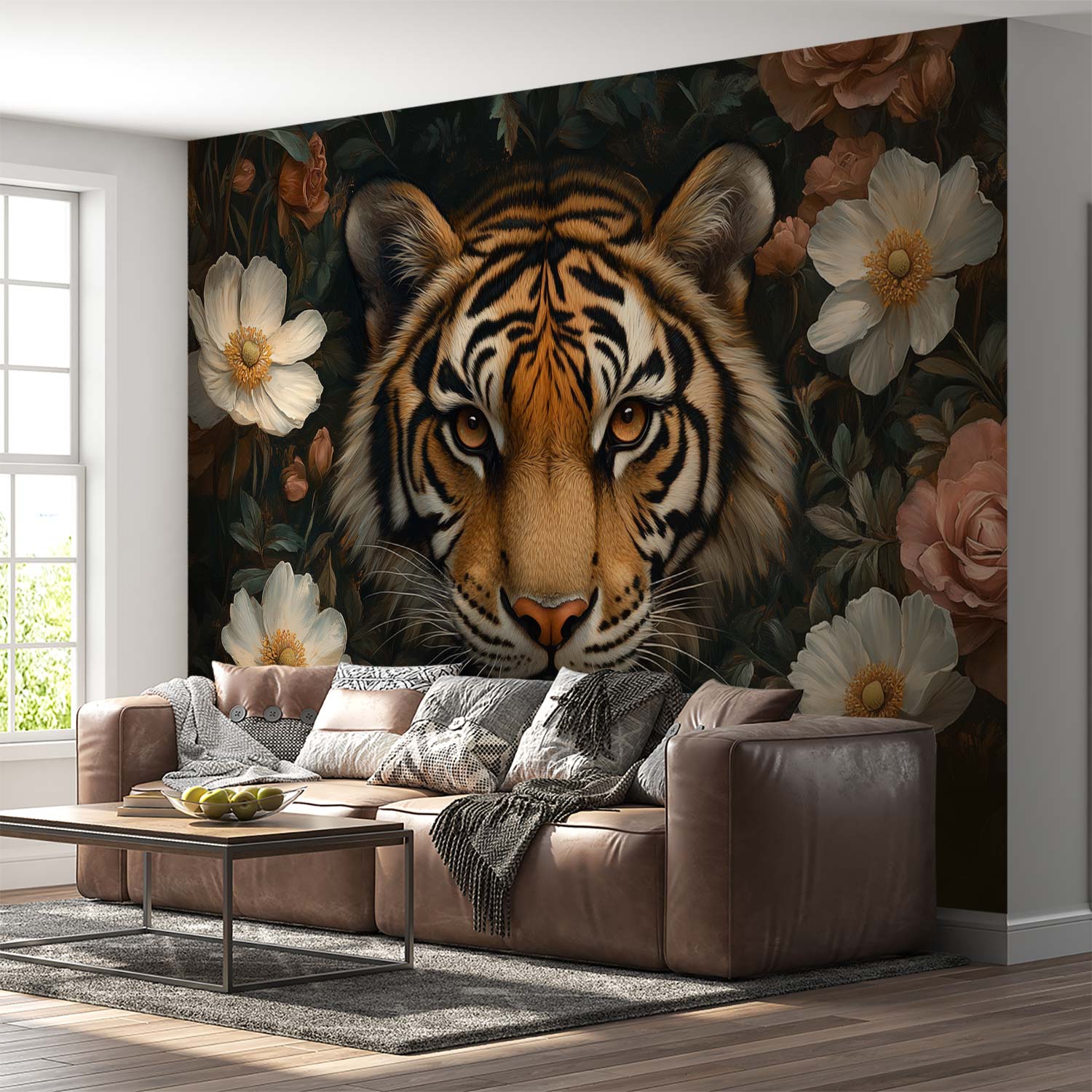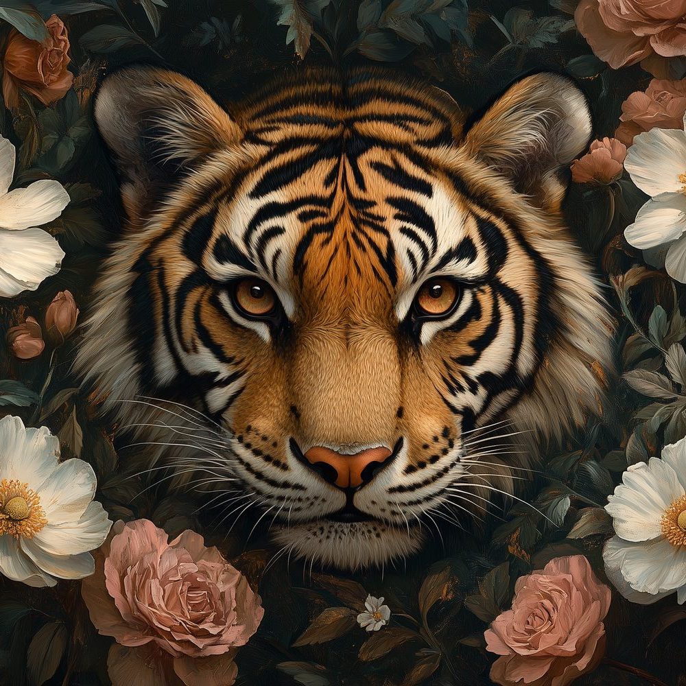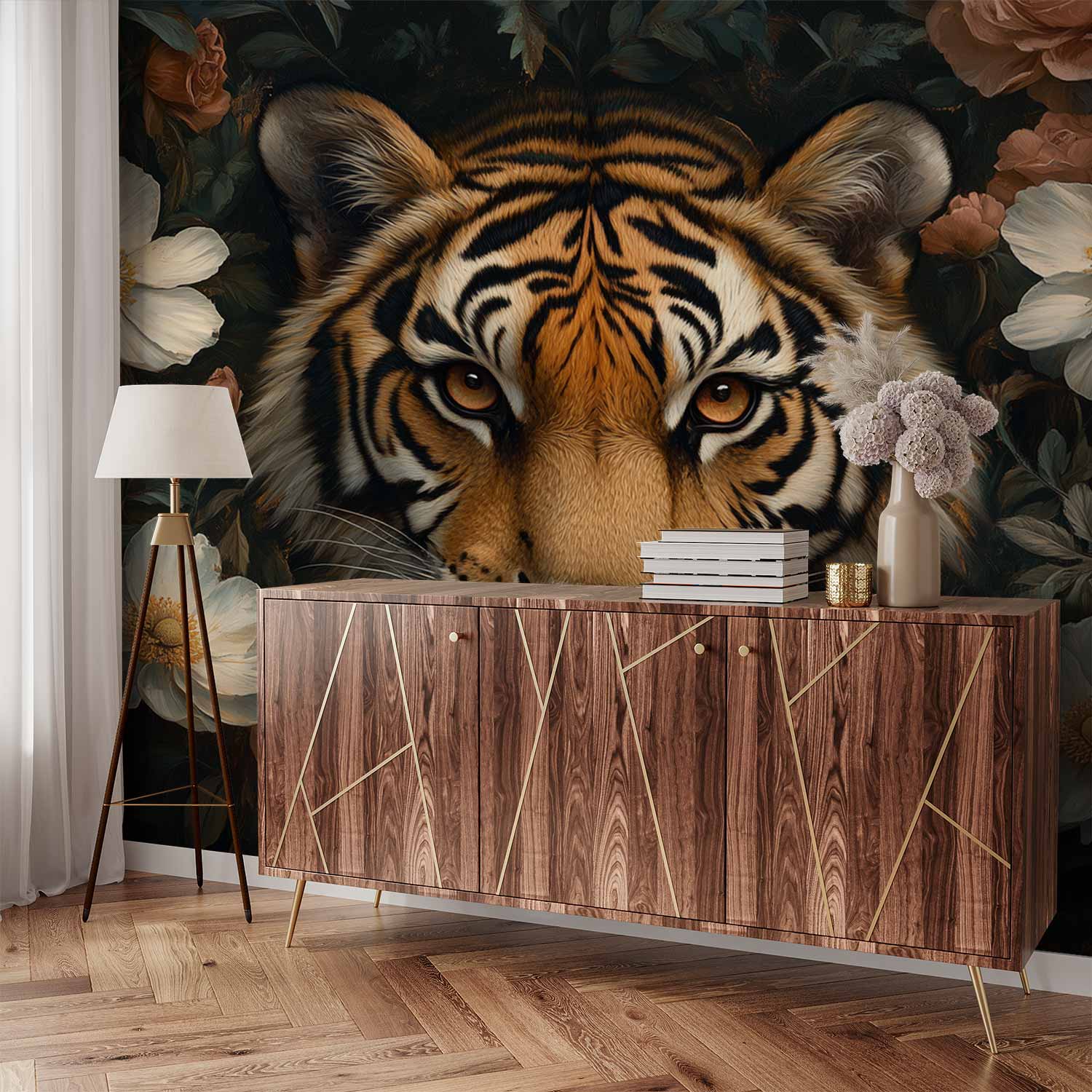 Terug naar collectie / Behang / Tijger tussen bloemenpracht behang