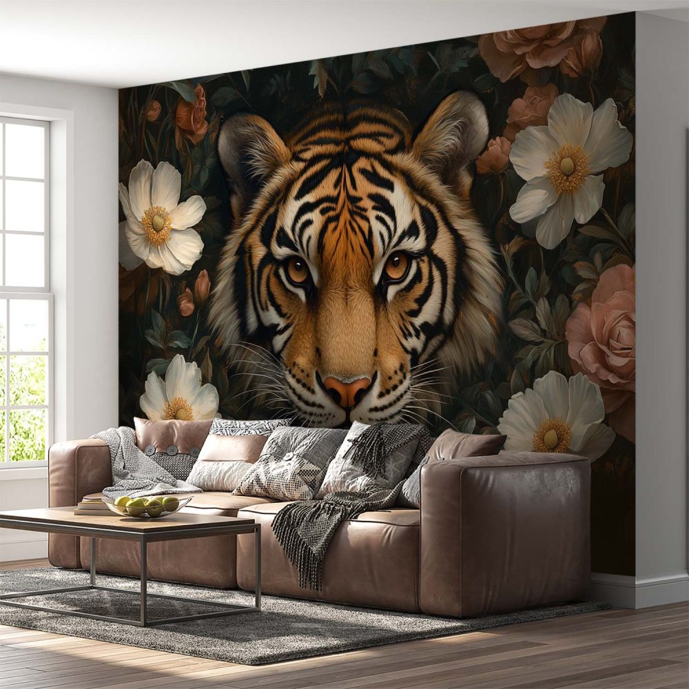Tijger tussen bloemenpracht behang