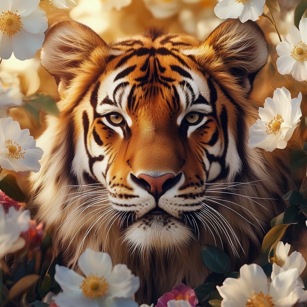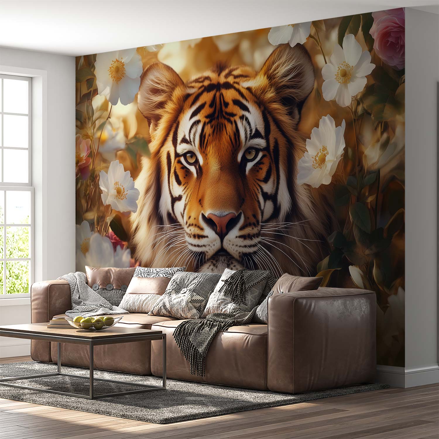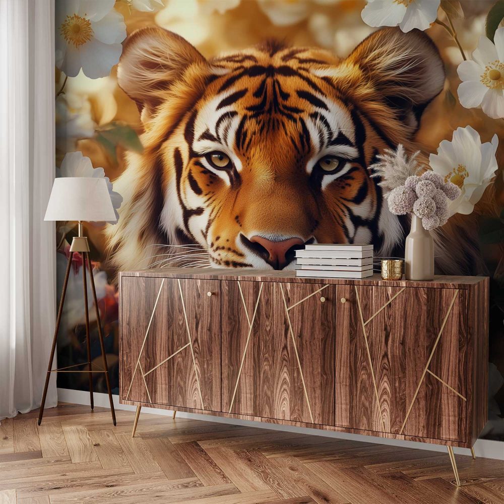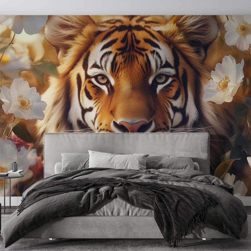Terug naar collectie / Behang / Tijger tussen bloemenpracht behang