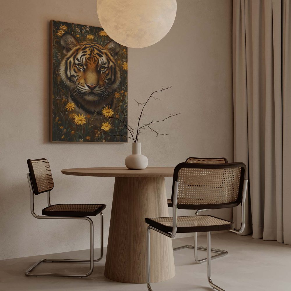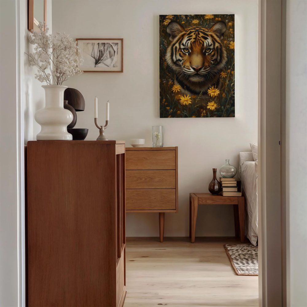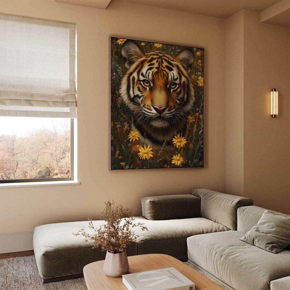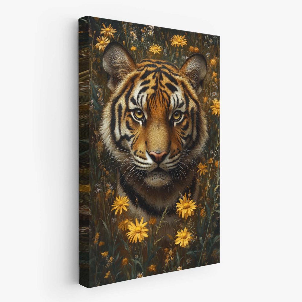 Terug naar collectie / Schilderijen / Bloemen Schilderij / Tijger tussen gele bloemen