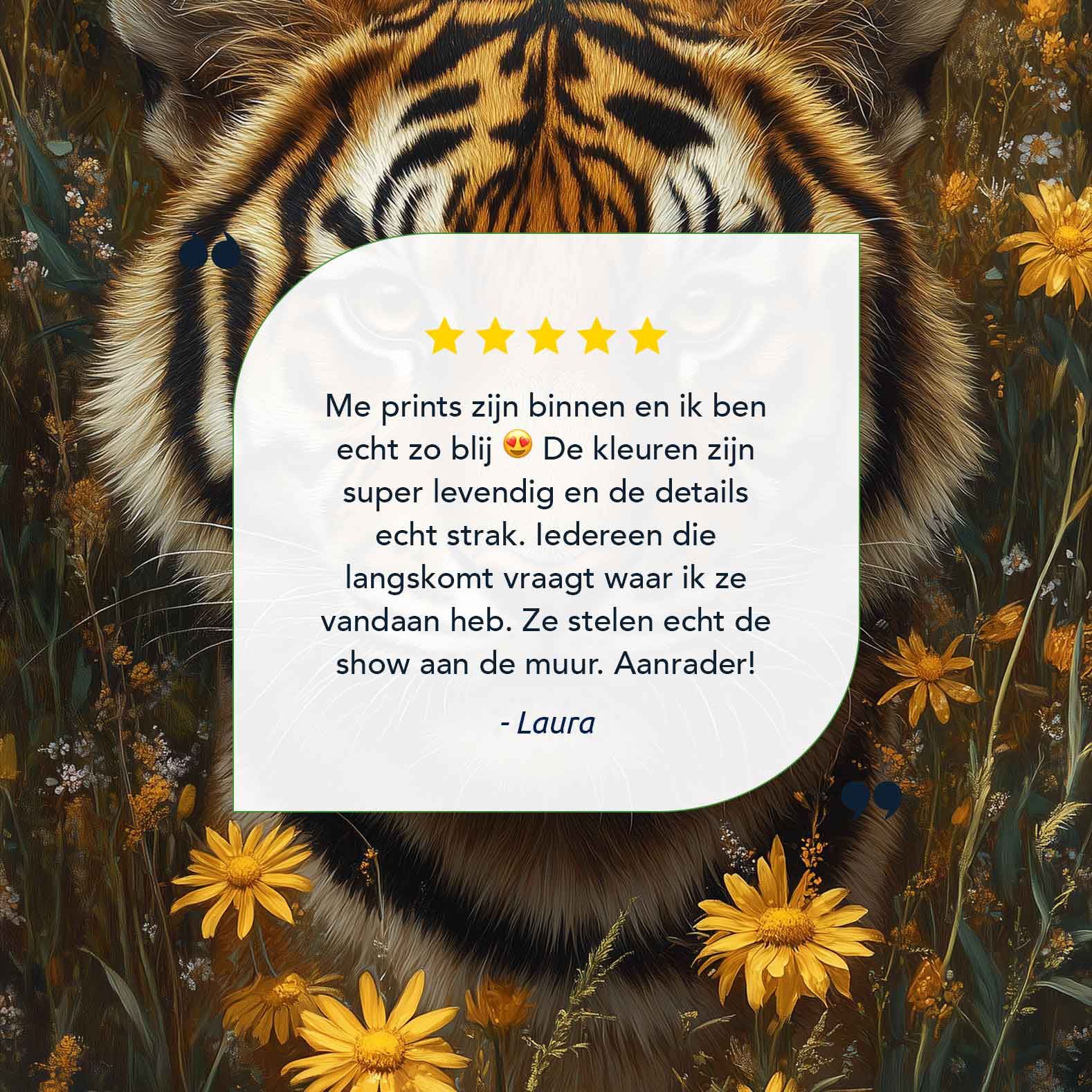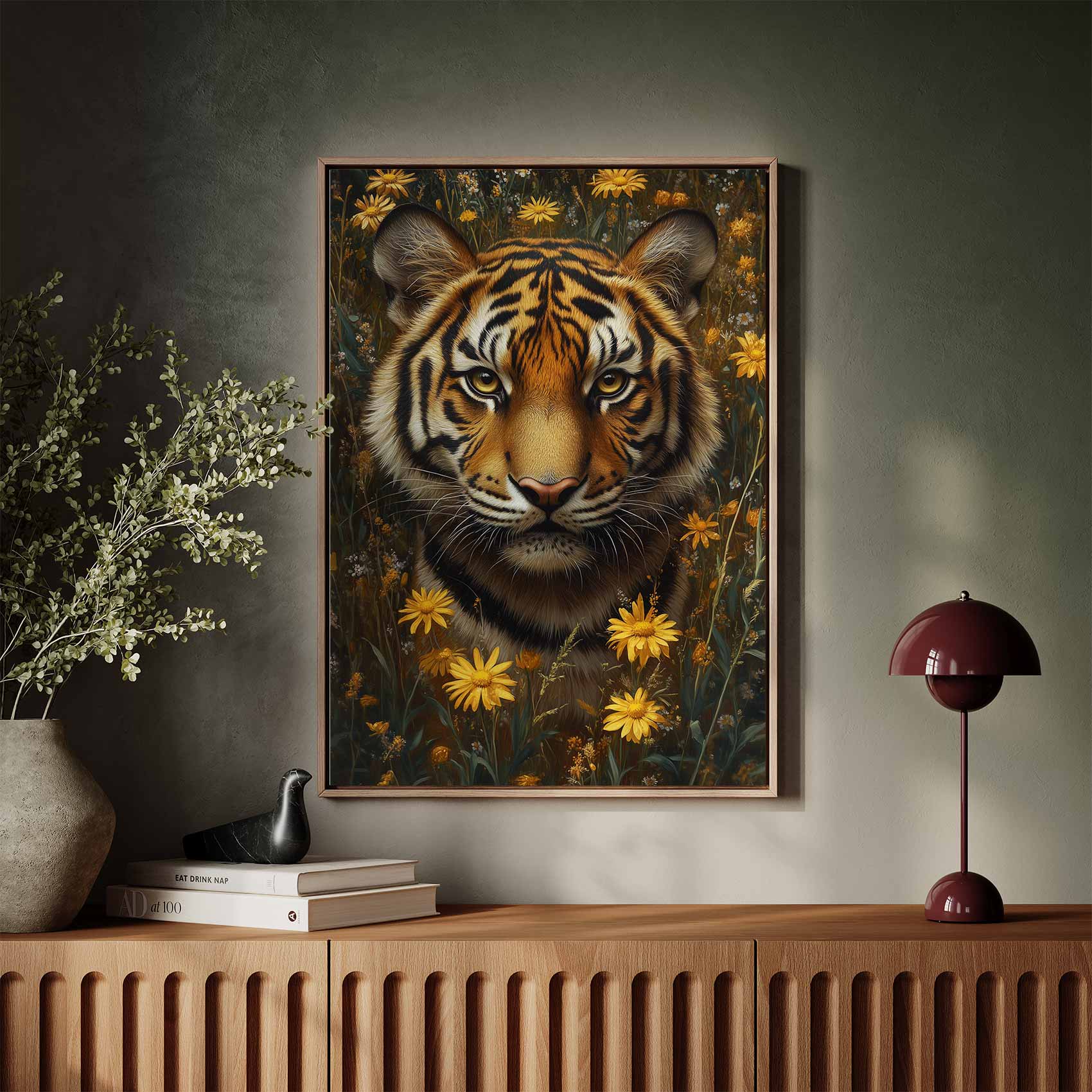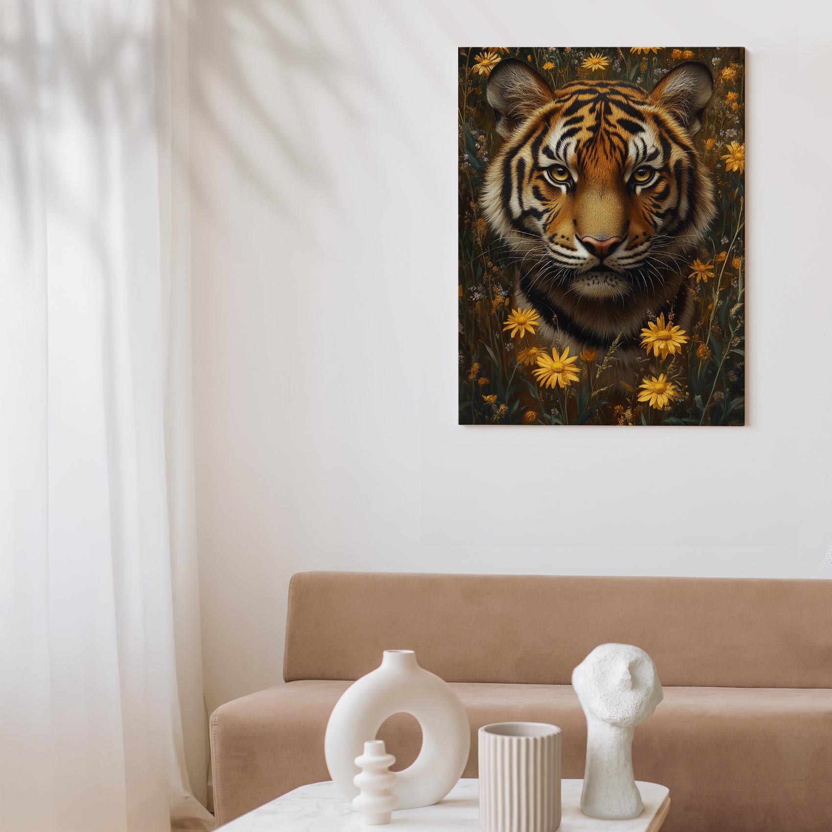 Terug naar collectie / Schilderijen / Bloemen Schilderij / Tijger tussen gele bloemen