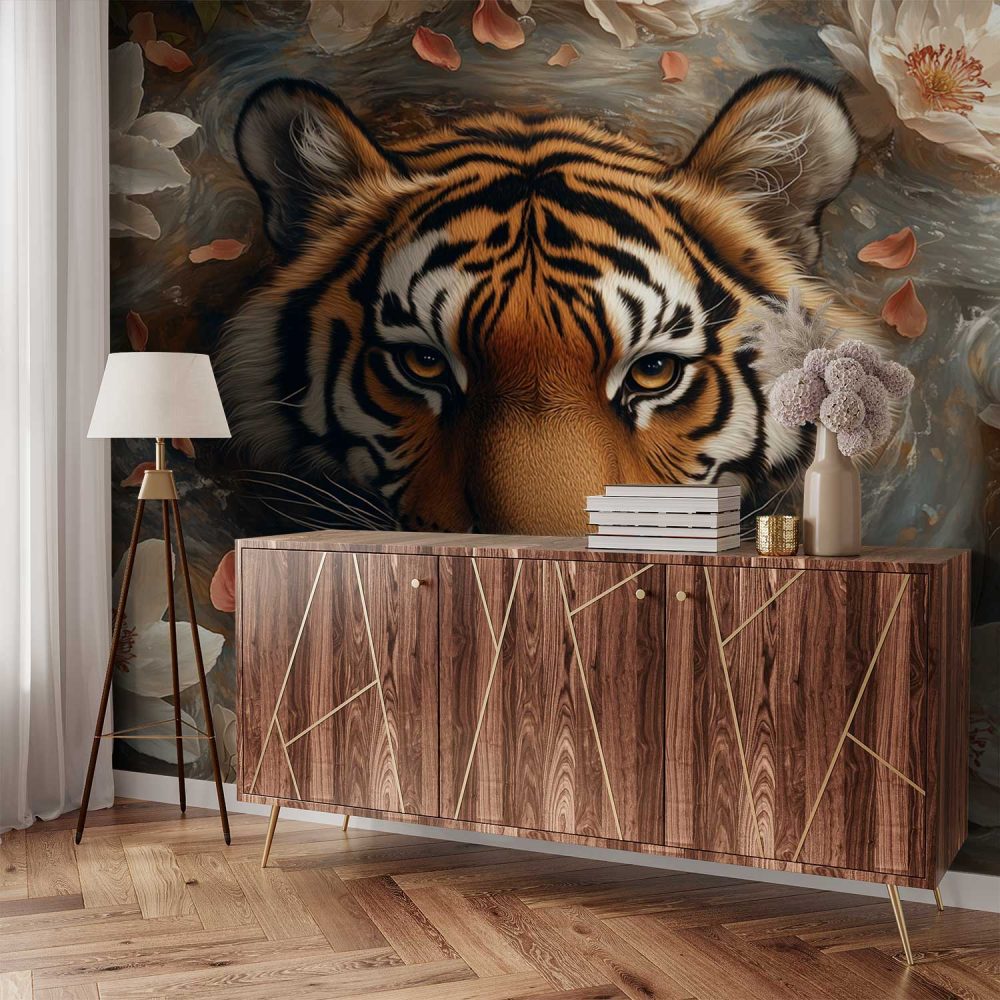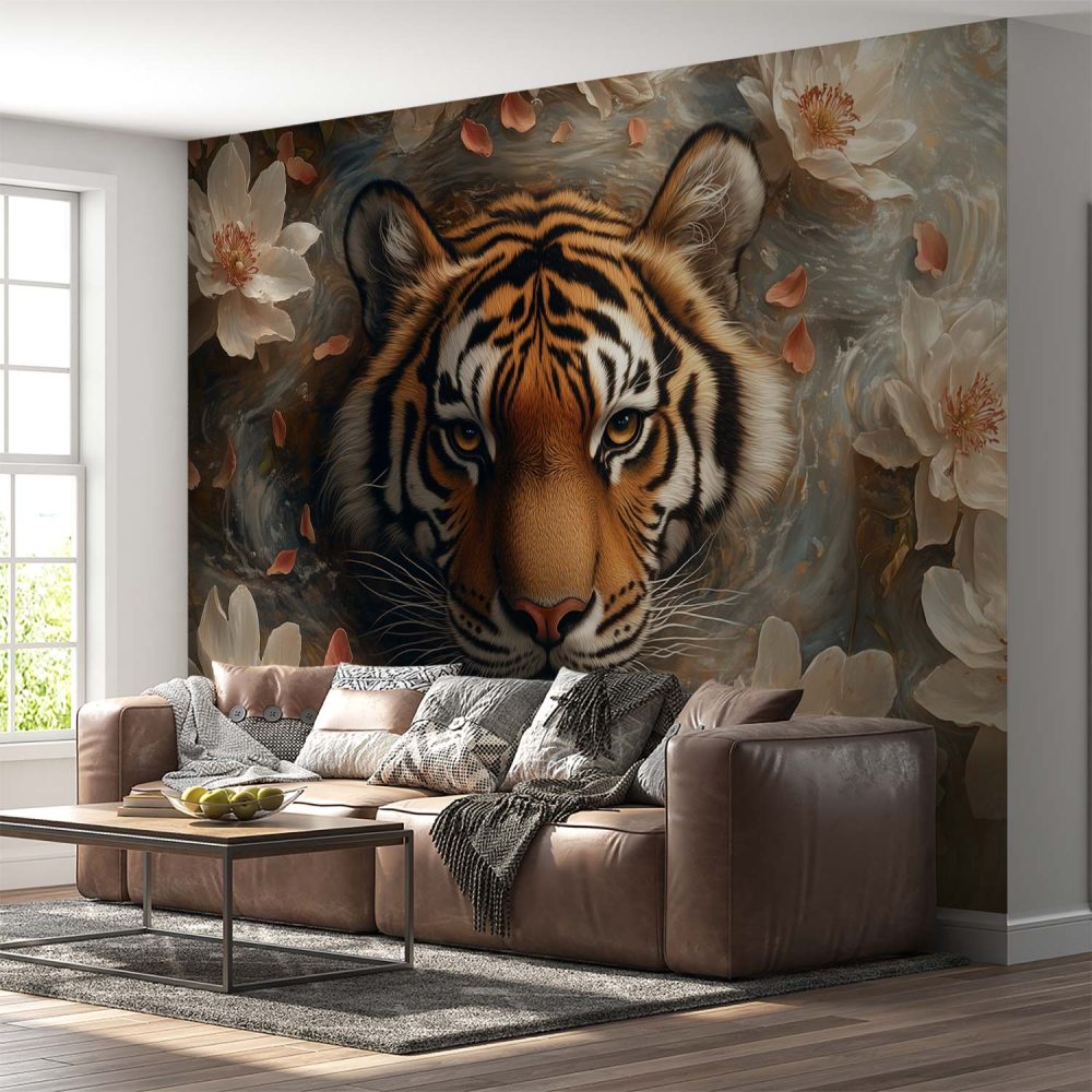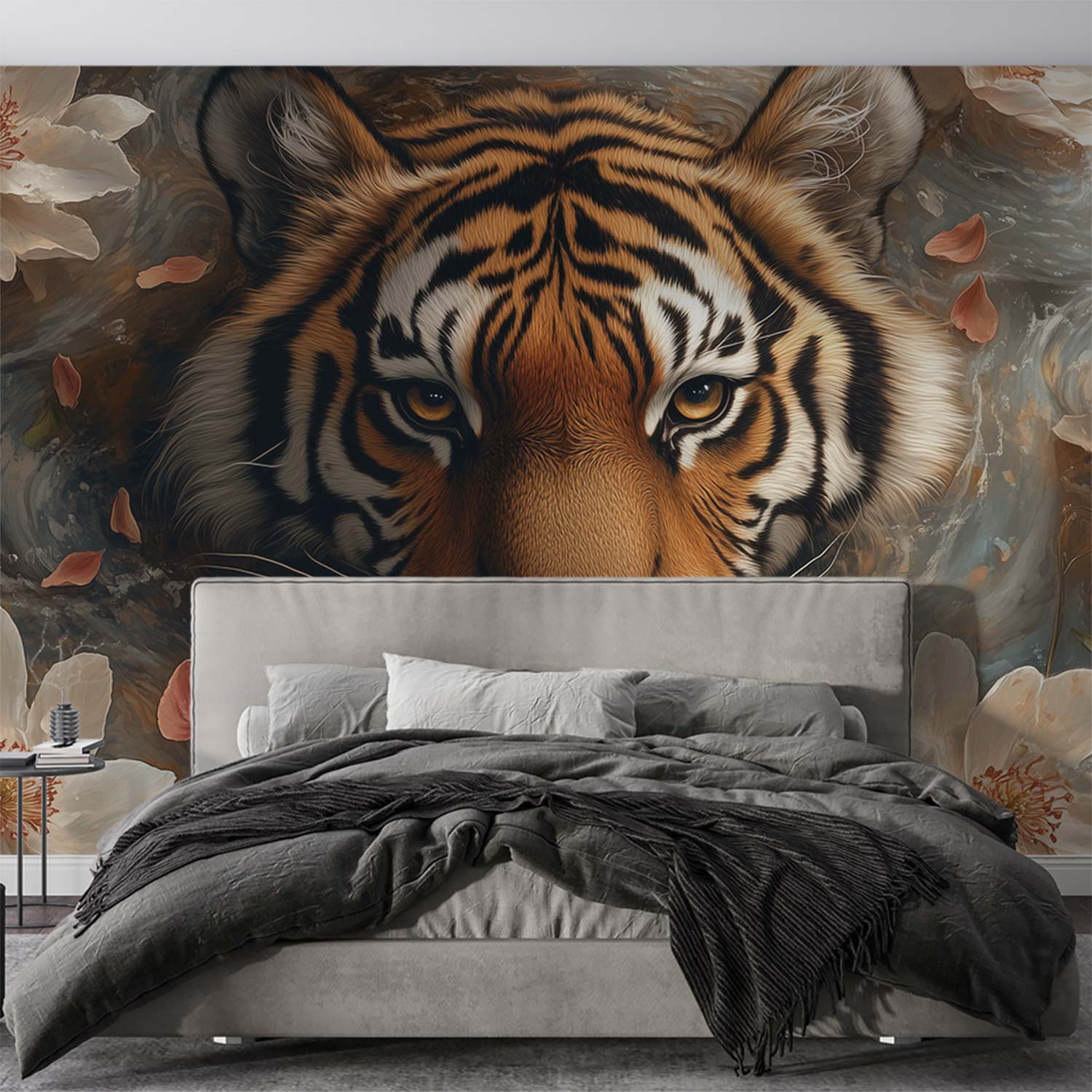 Terug naar collectie / Behang / Tijger tussen kleurrijke bloemen behang