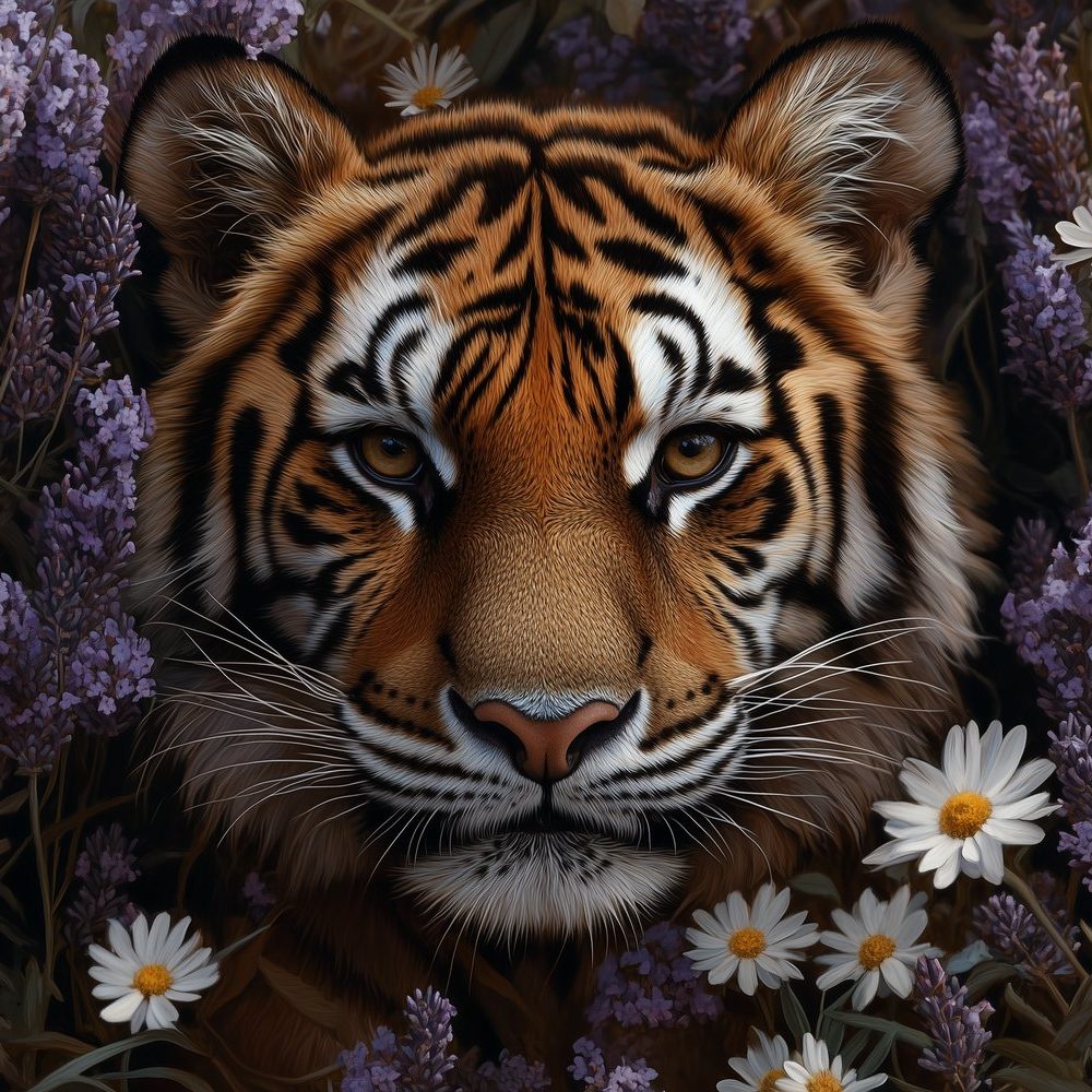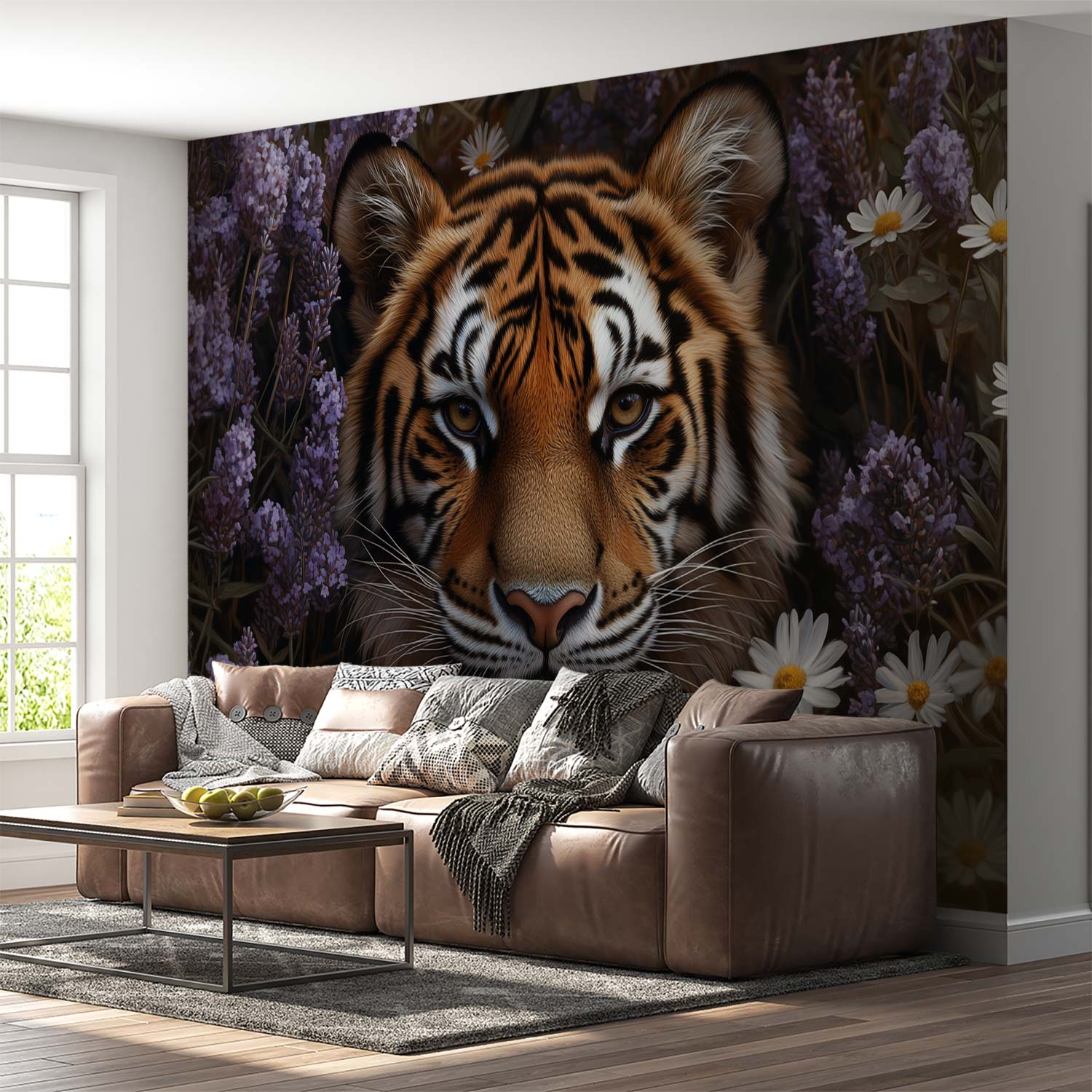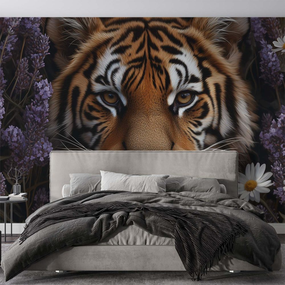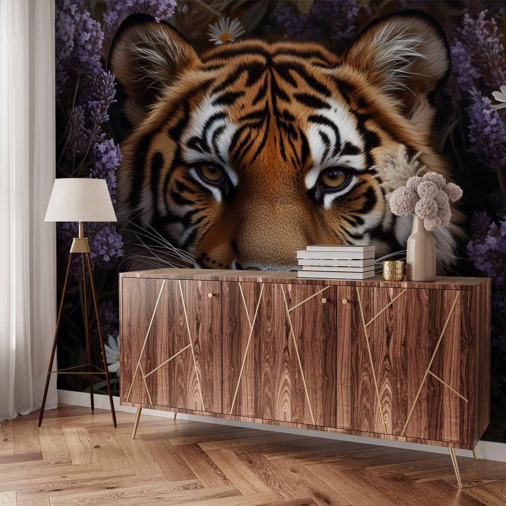 Terug naar collectie / Behang / Tijger tussen paarse bloemen behang
