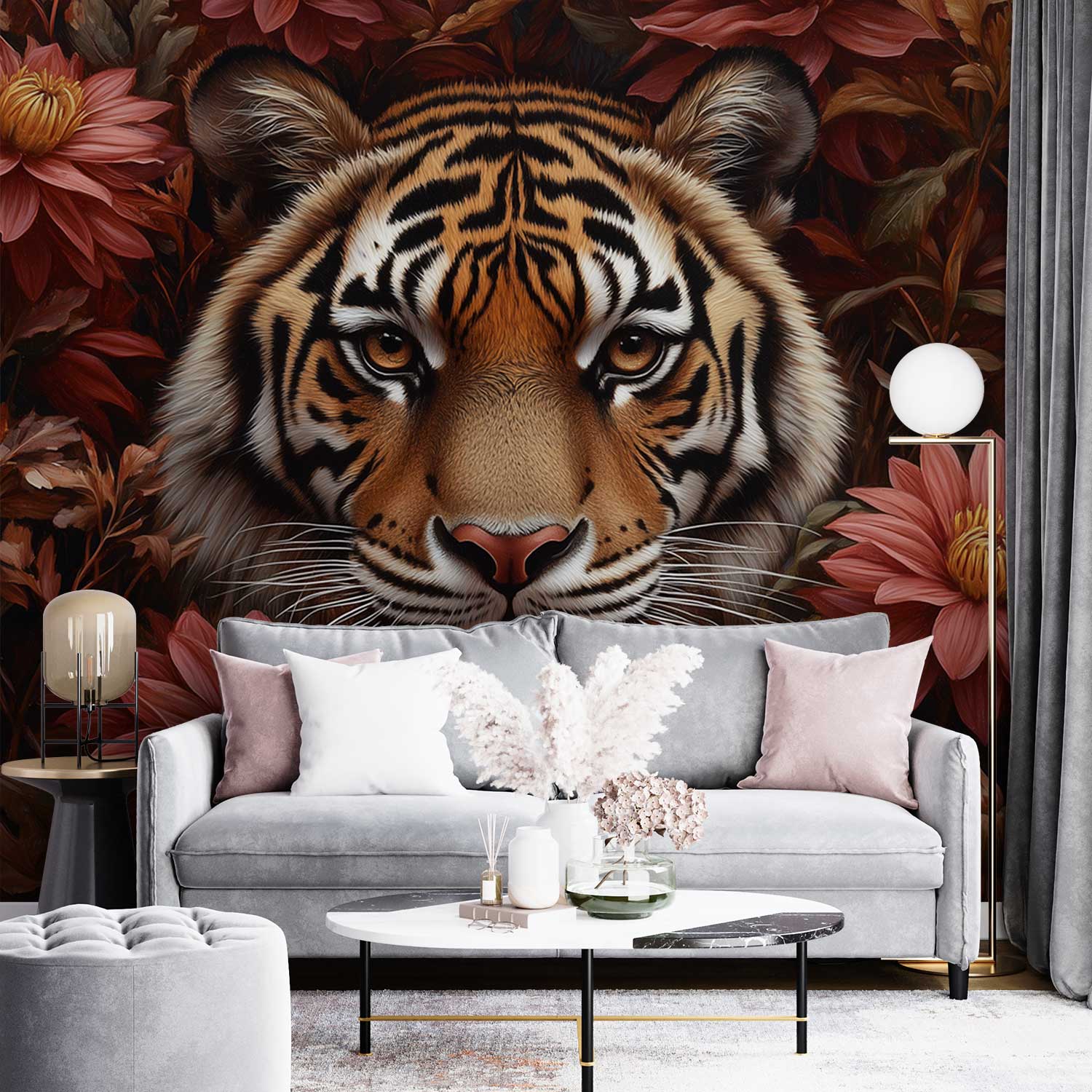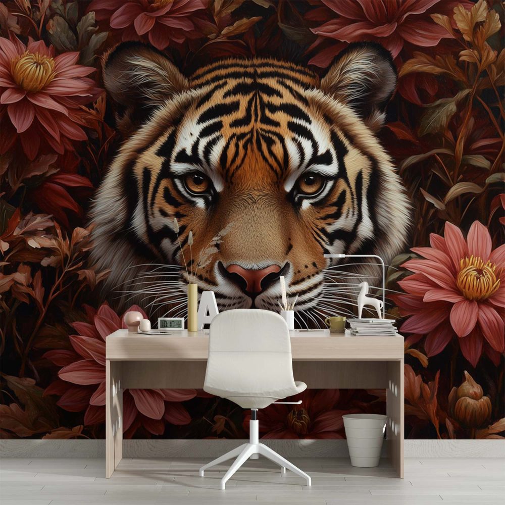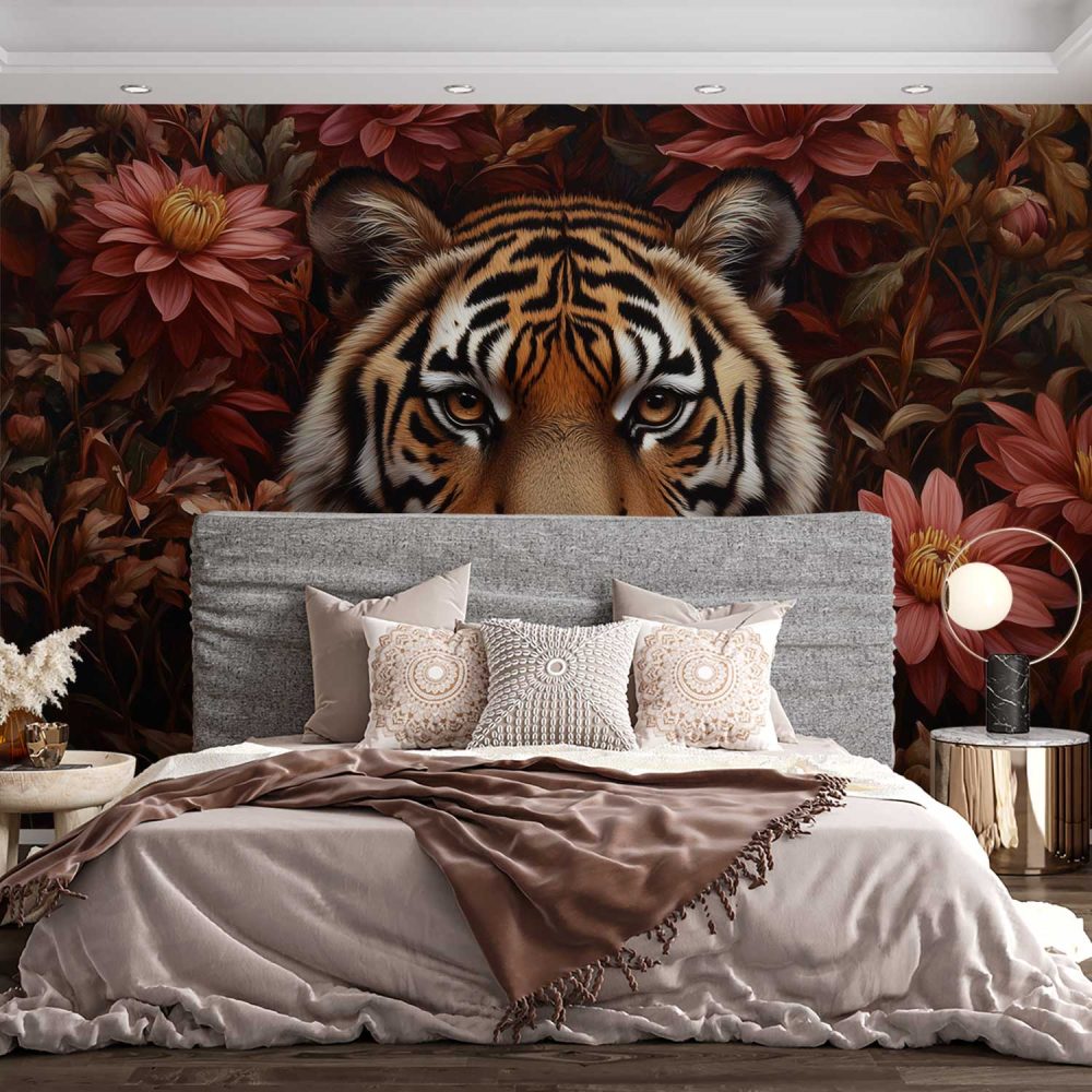Terug naar collectie / Behang / Tijger tussen rode bloemen behang