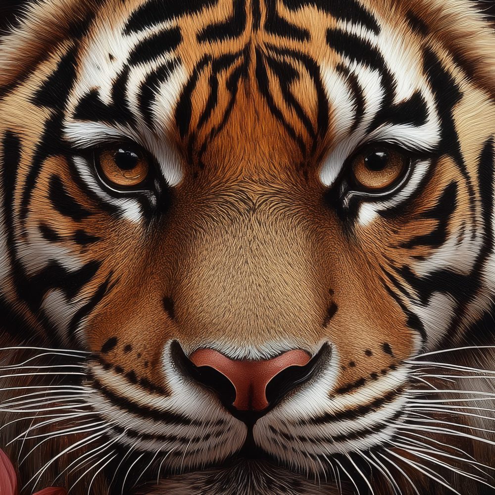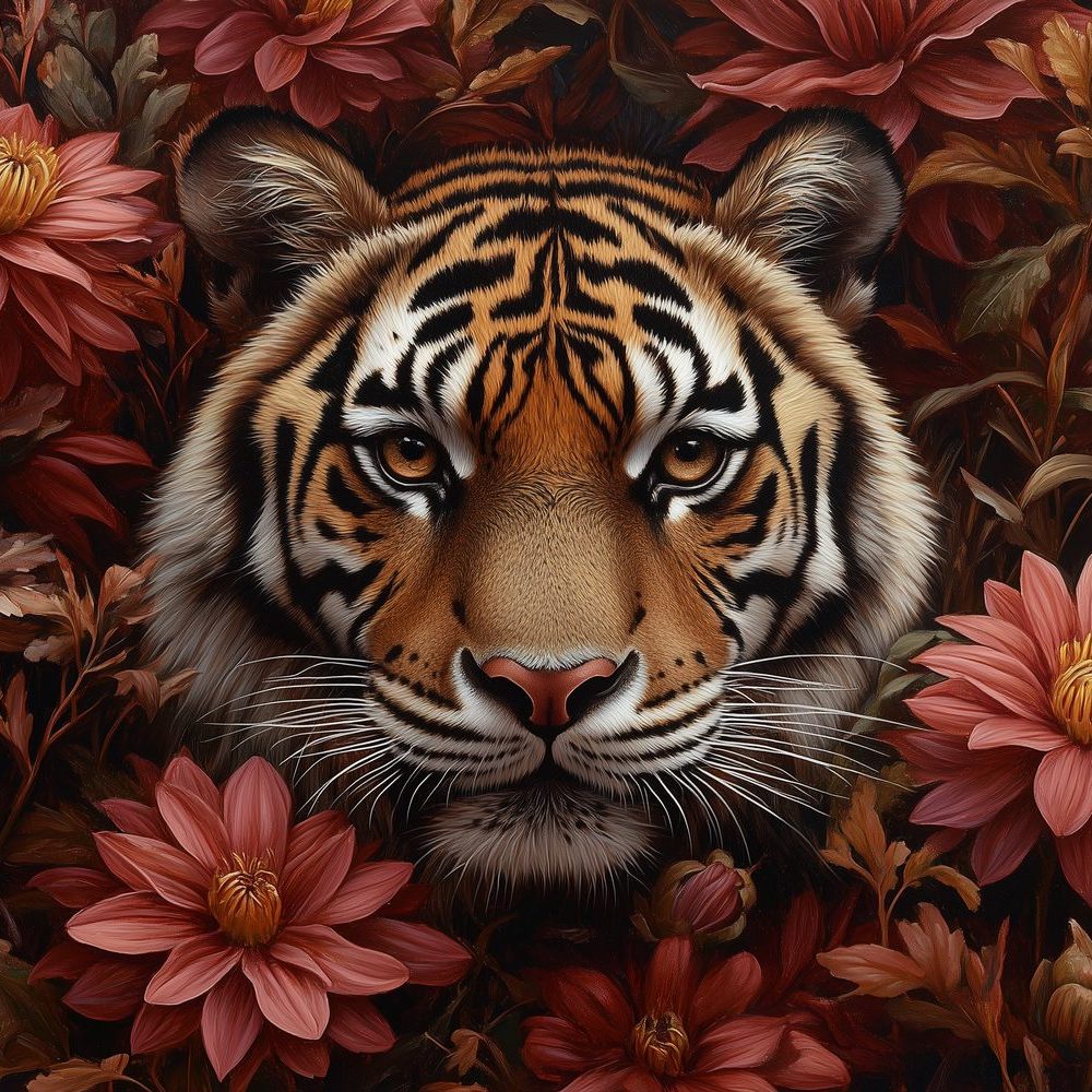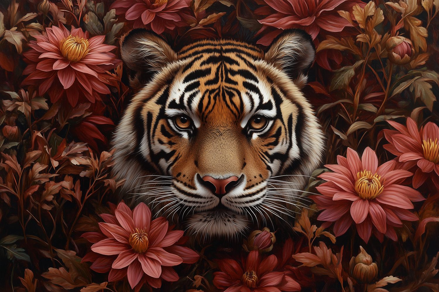 Terug naar collectie / Behang / Tijger tussen rode bloemen behang