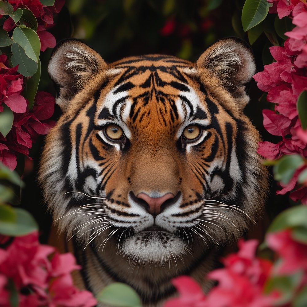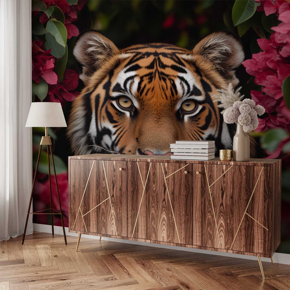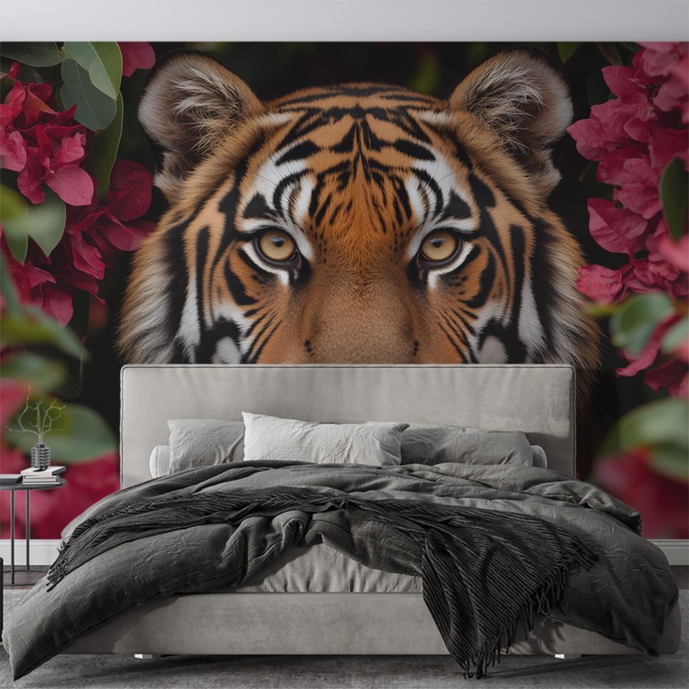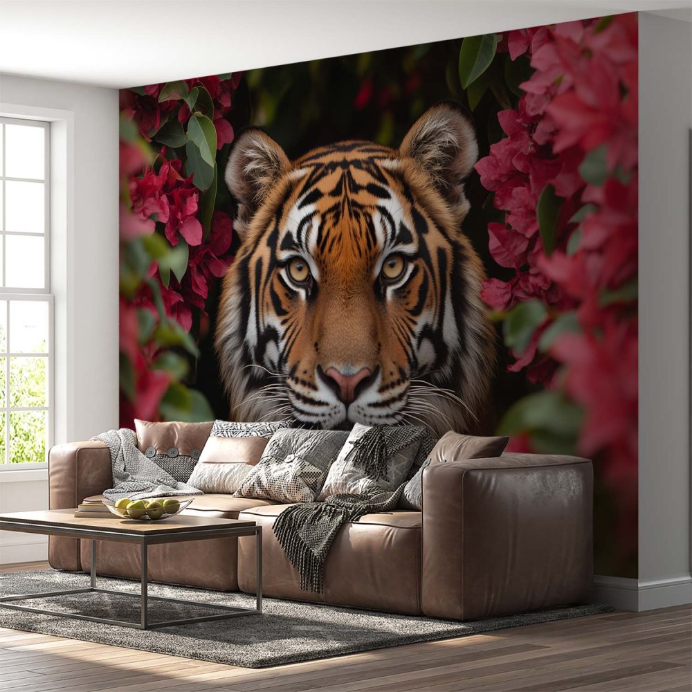 Terug naar collectie / Behang / Tijger tussen rode bloemen behang