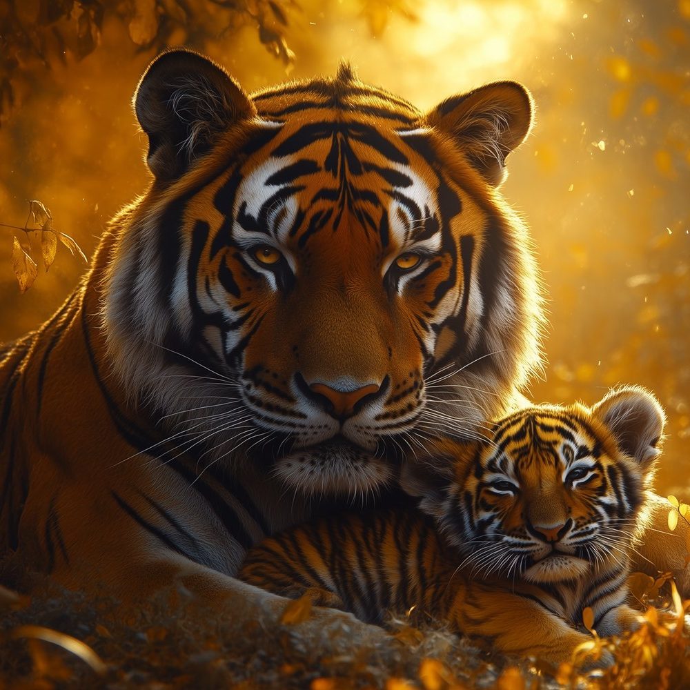 Terug naar collectie / Behang / Tijgerwelp en moeder in bos behang