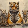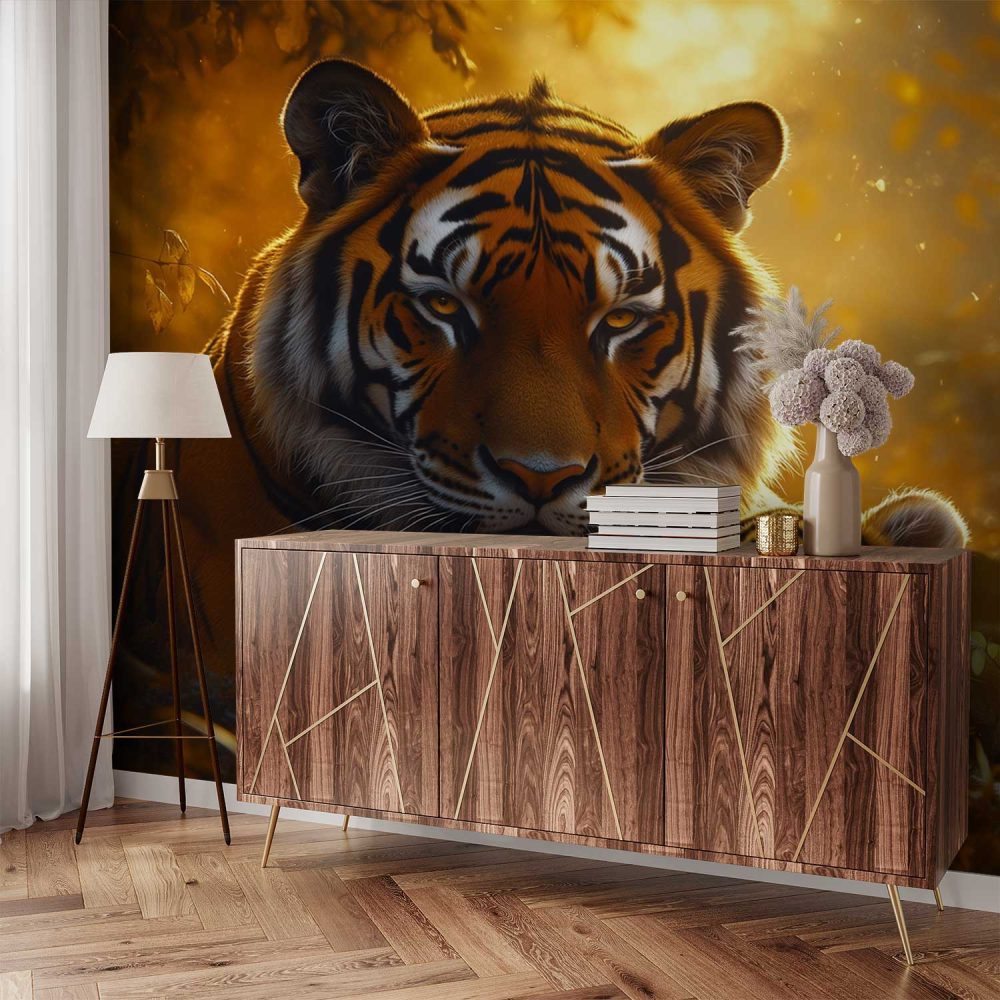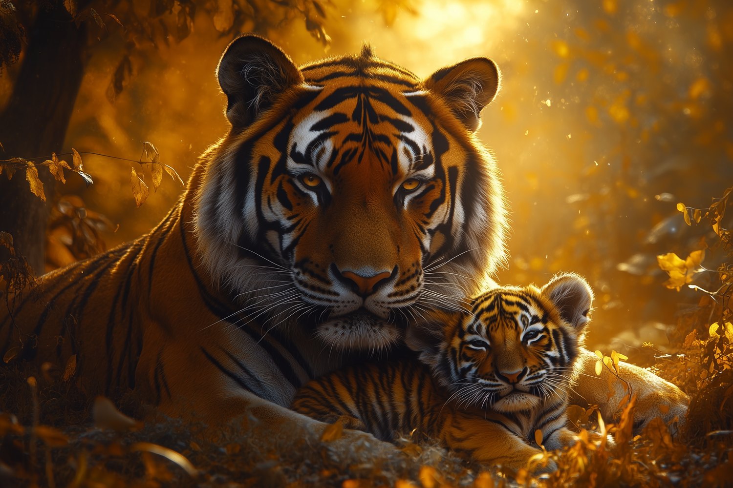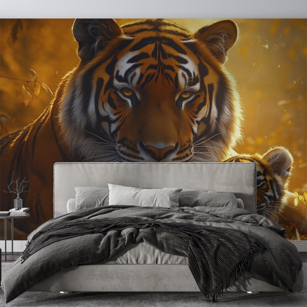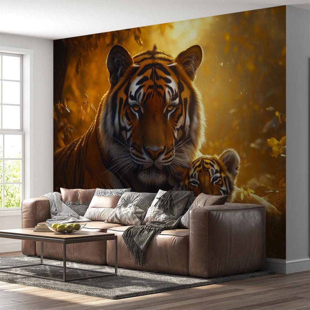 Tijgerwelp en moeder in bos behang