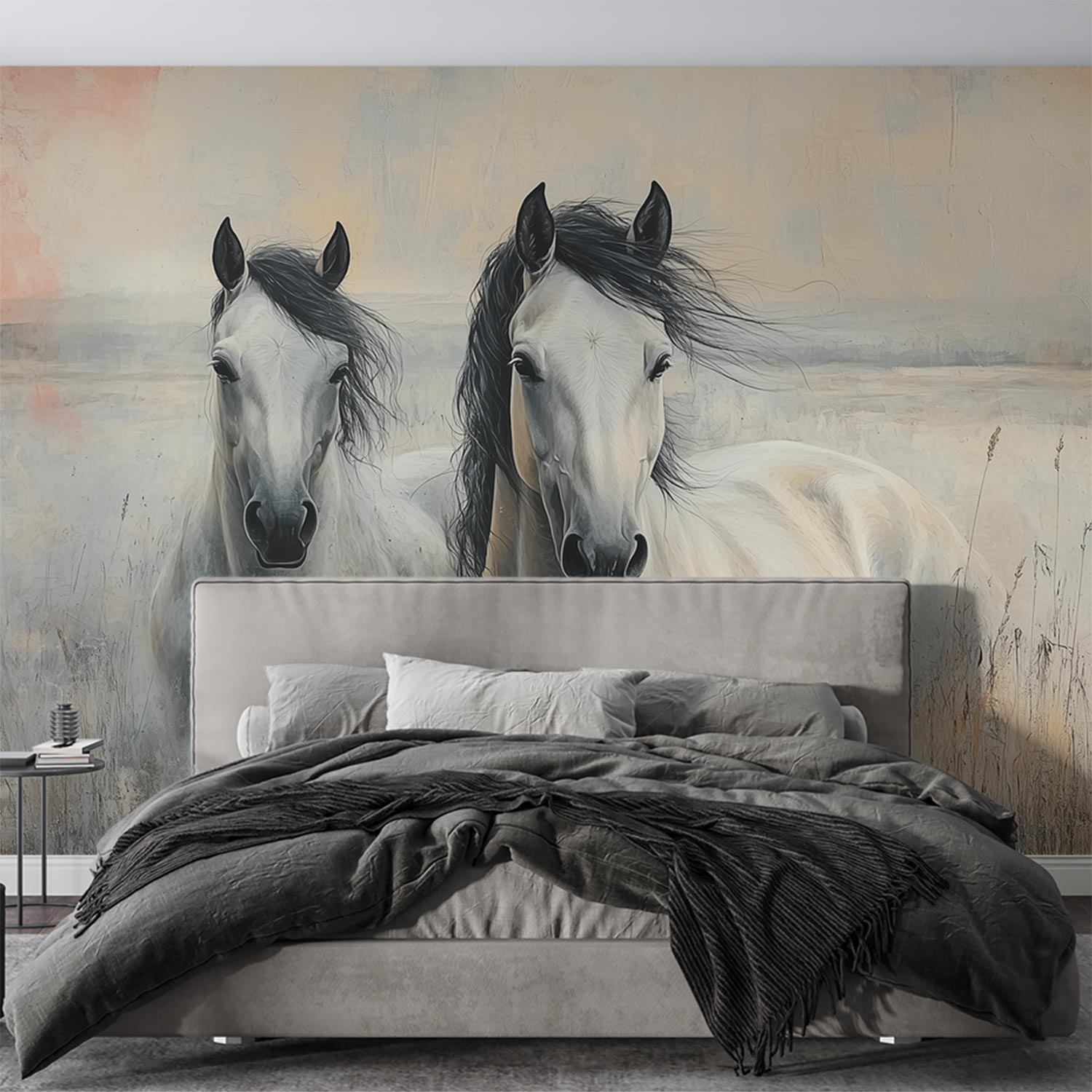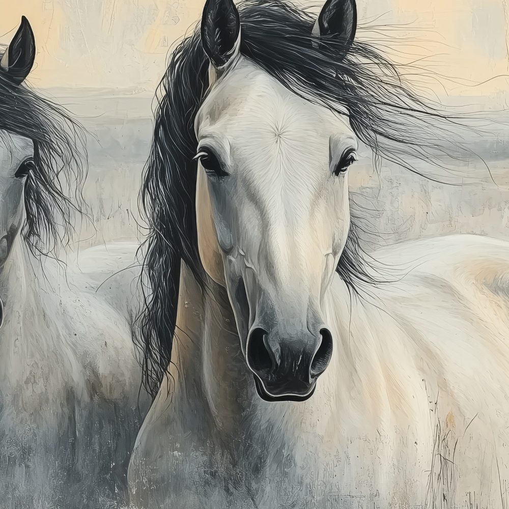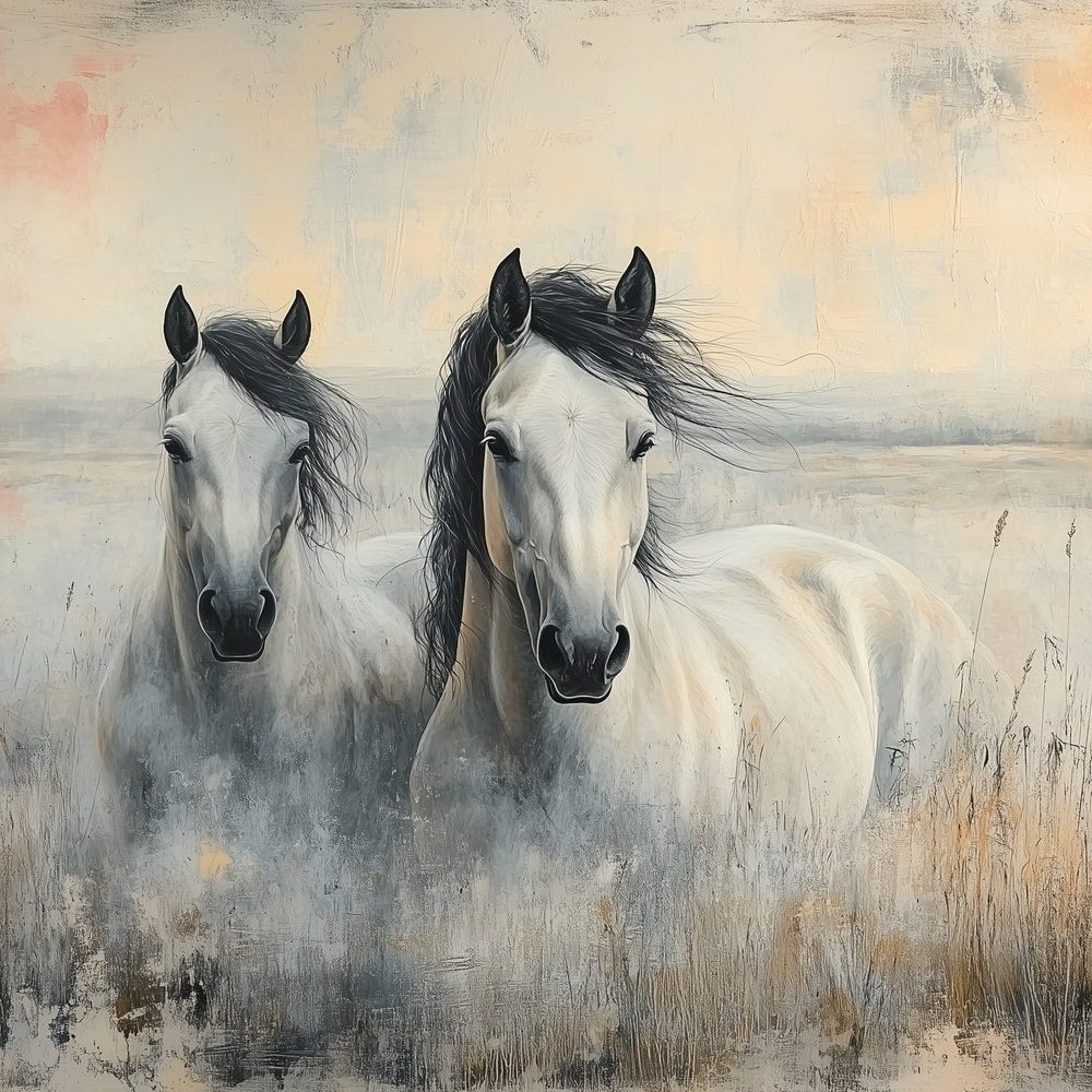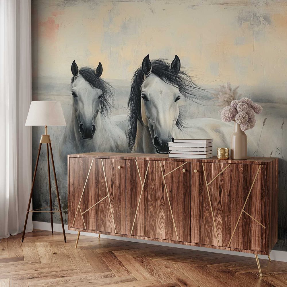 Twee witte paarden in gras behang