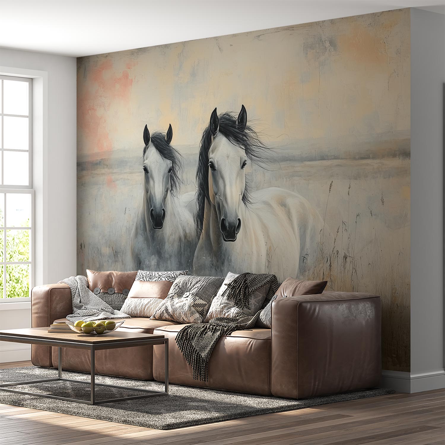 Terug naar collectie / Behang / Twee witte paarden in gras behang