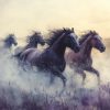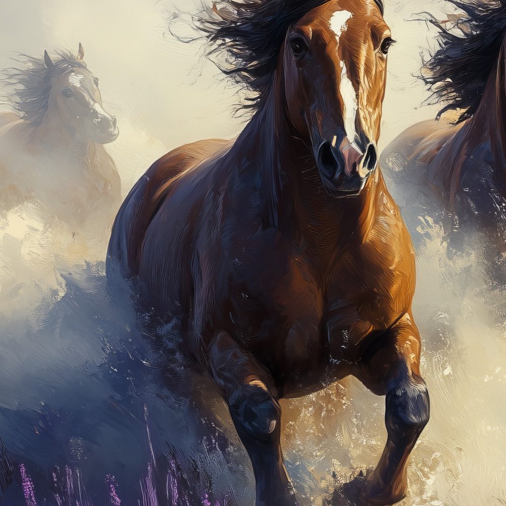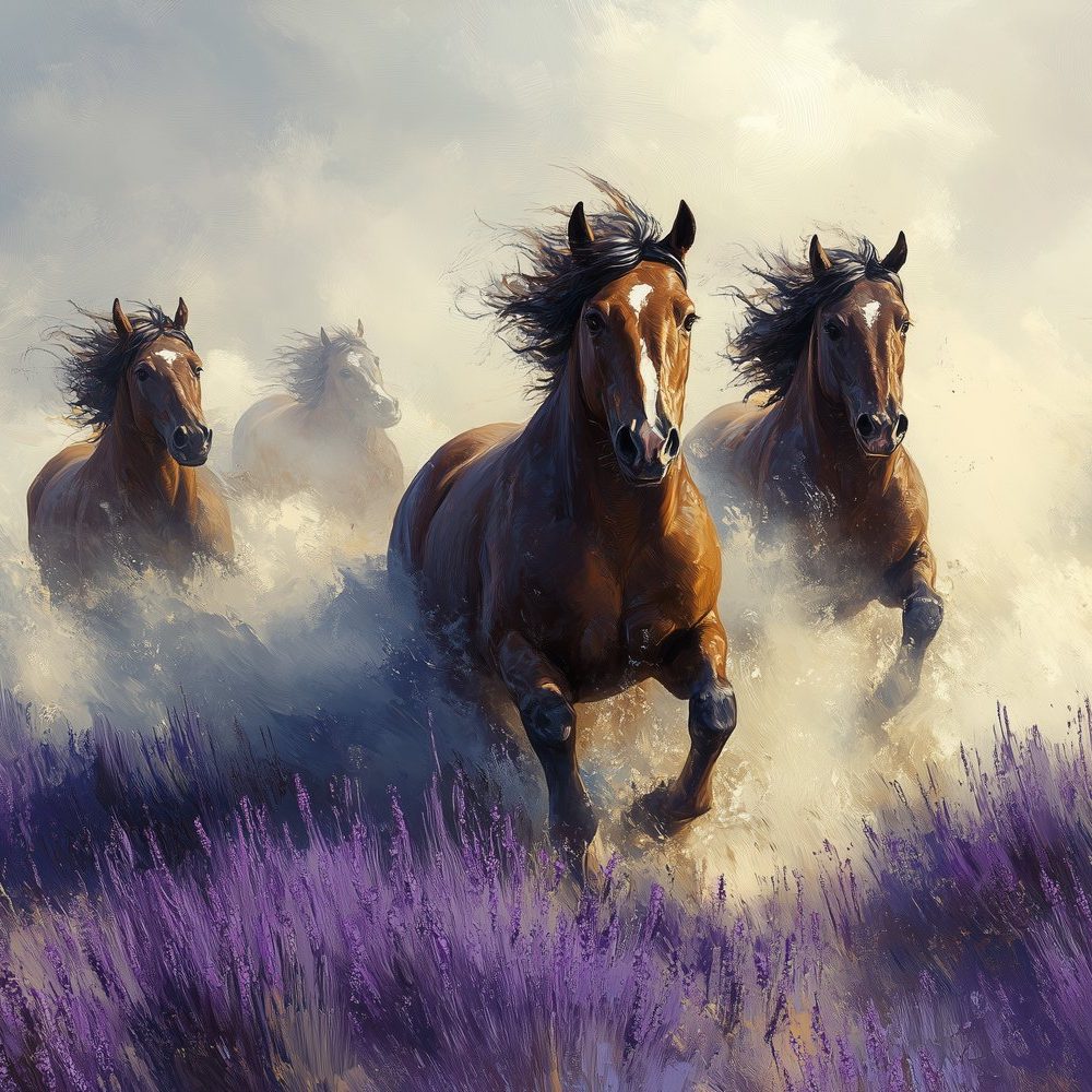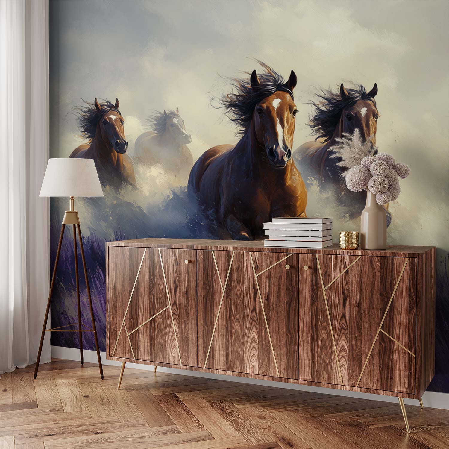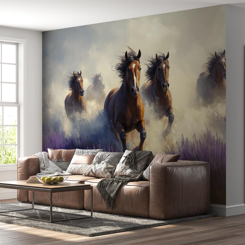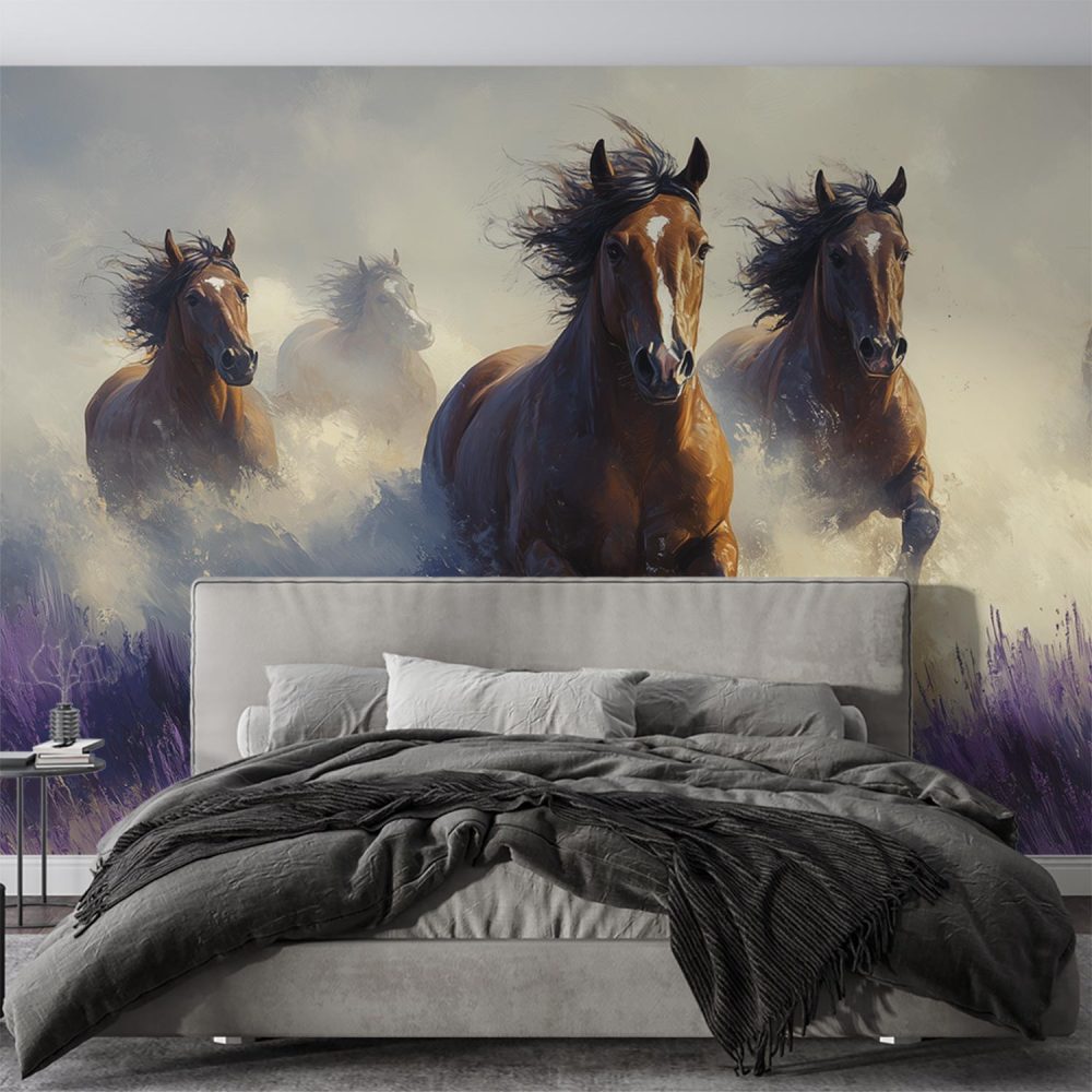Terug naar collectie / Behang / Vier paarden in paarse bloemen behang