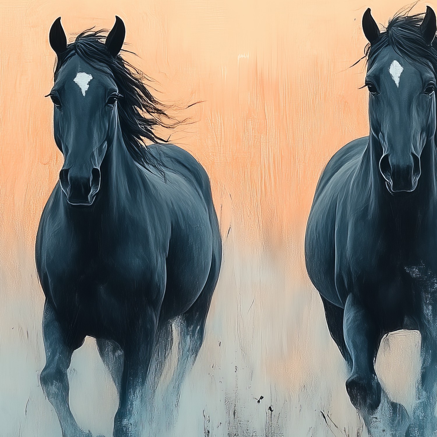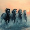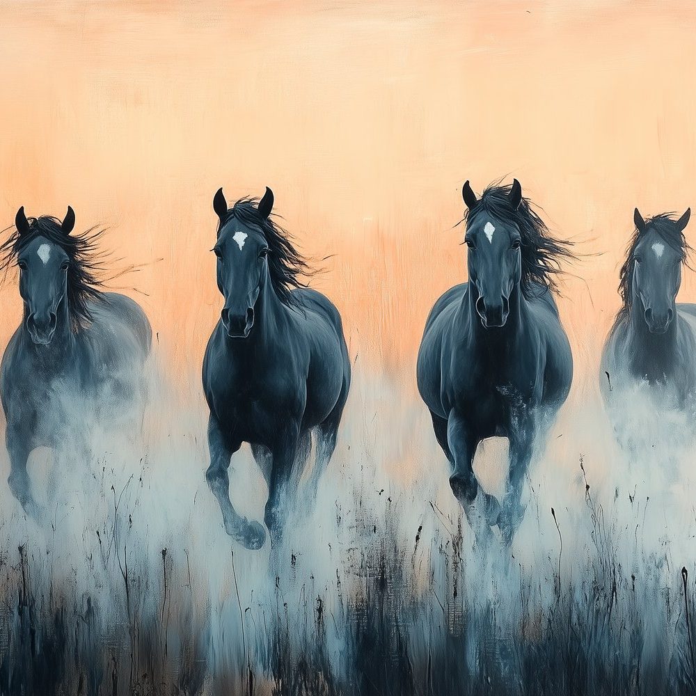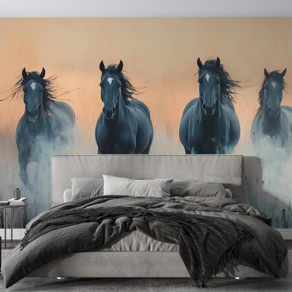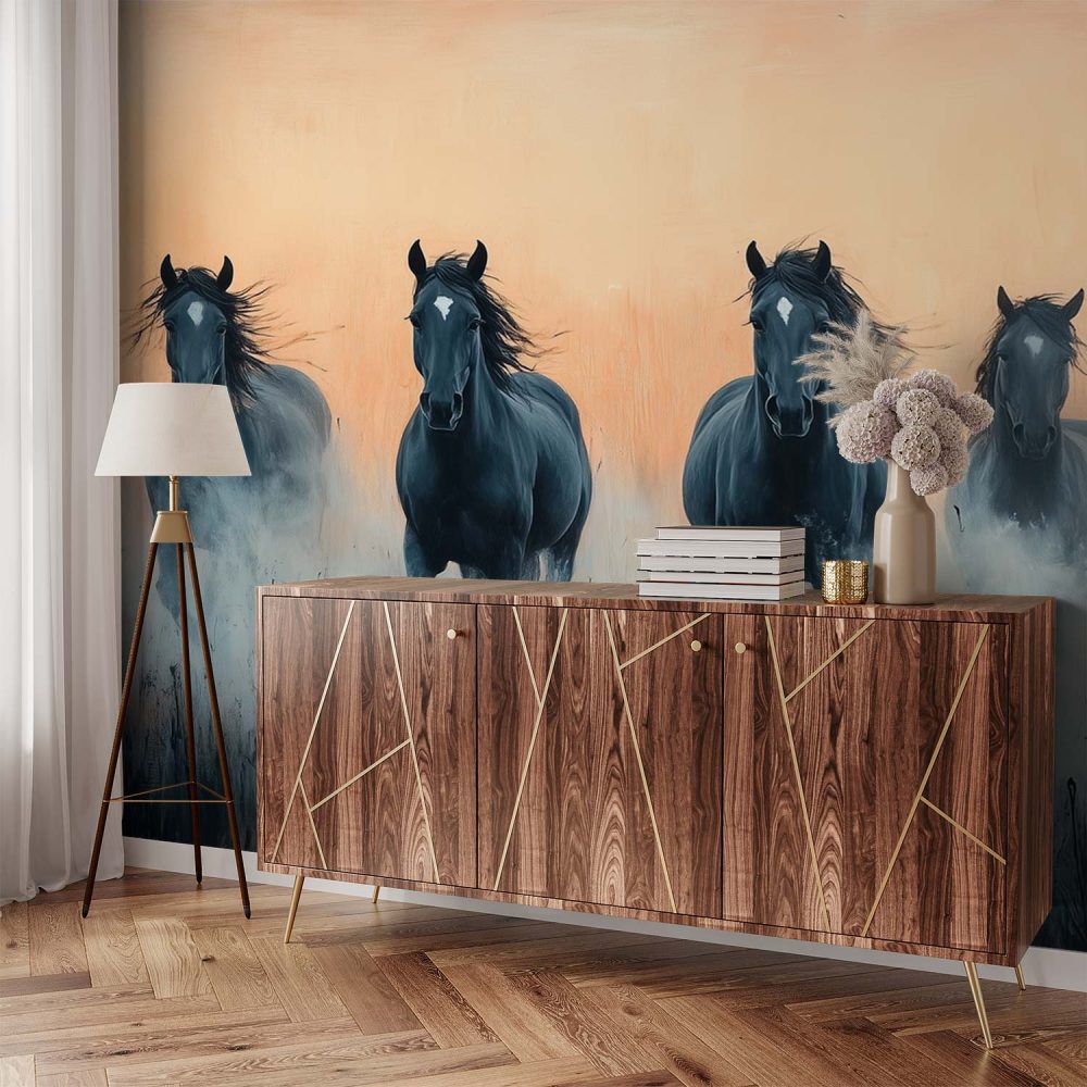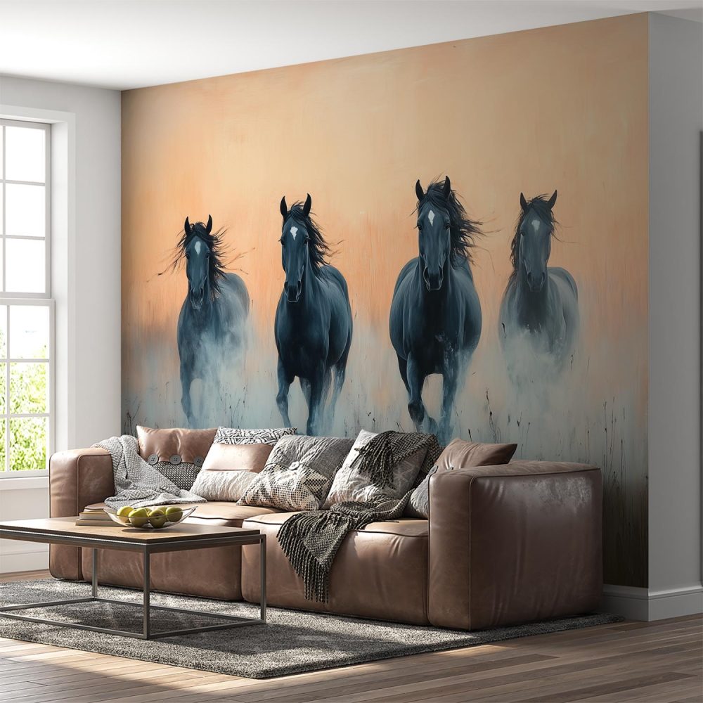 Vier zwarte paarden in galop behang