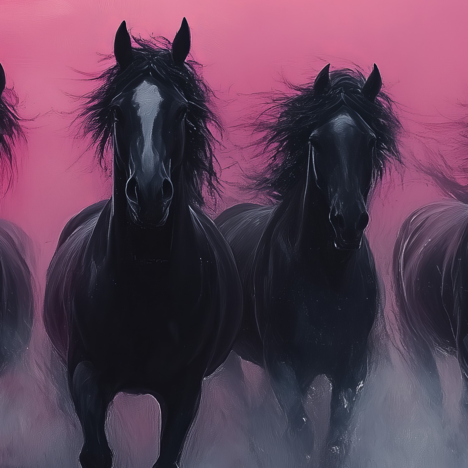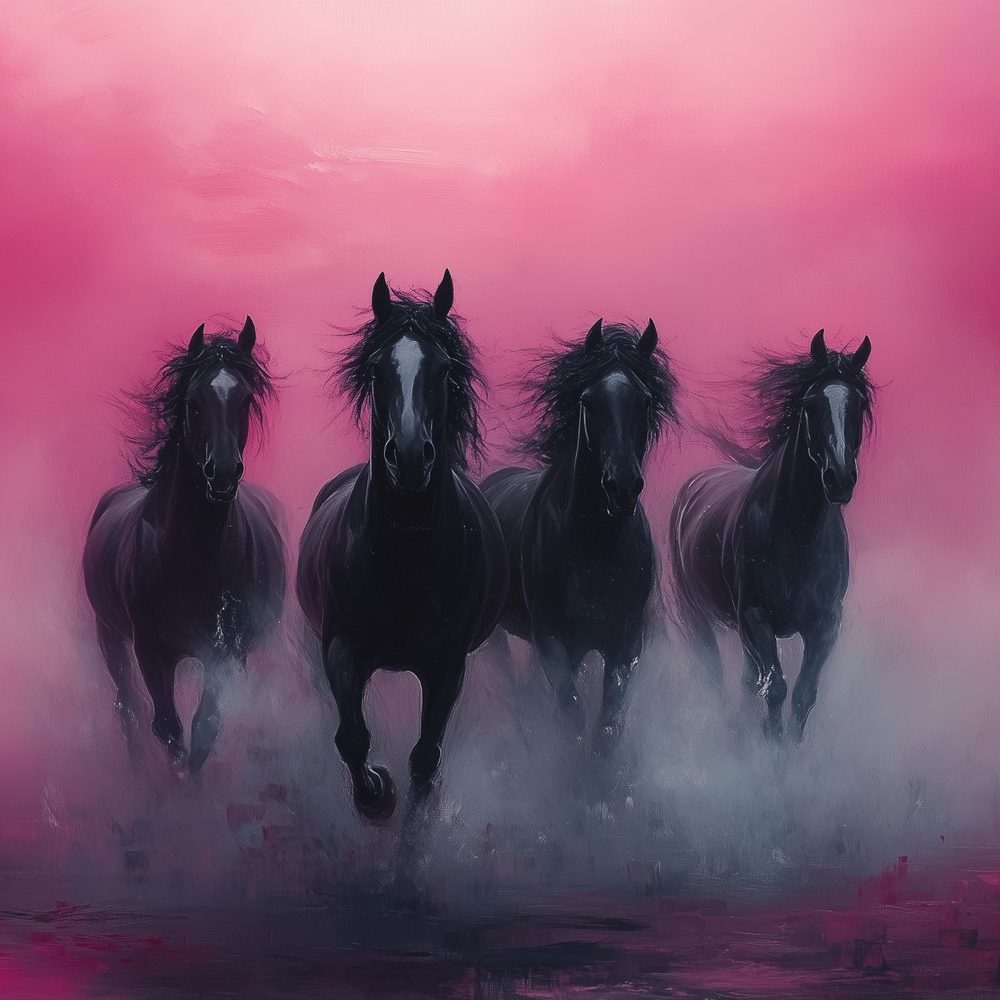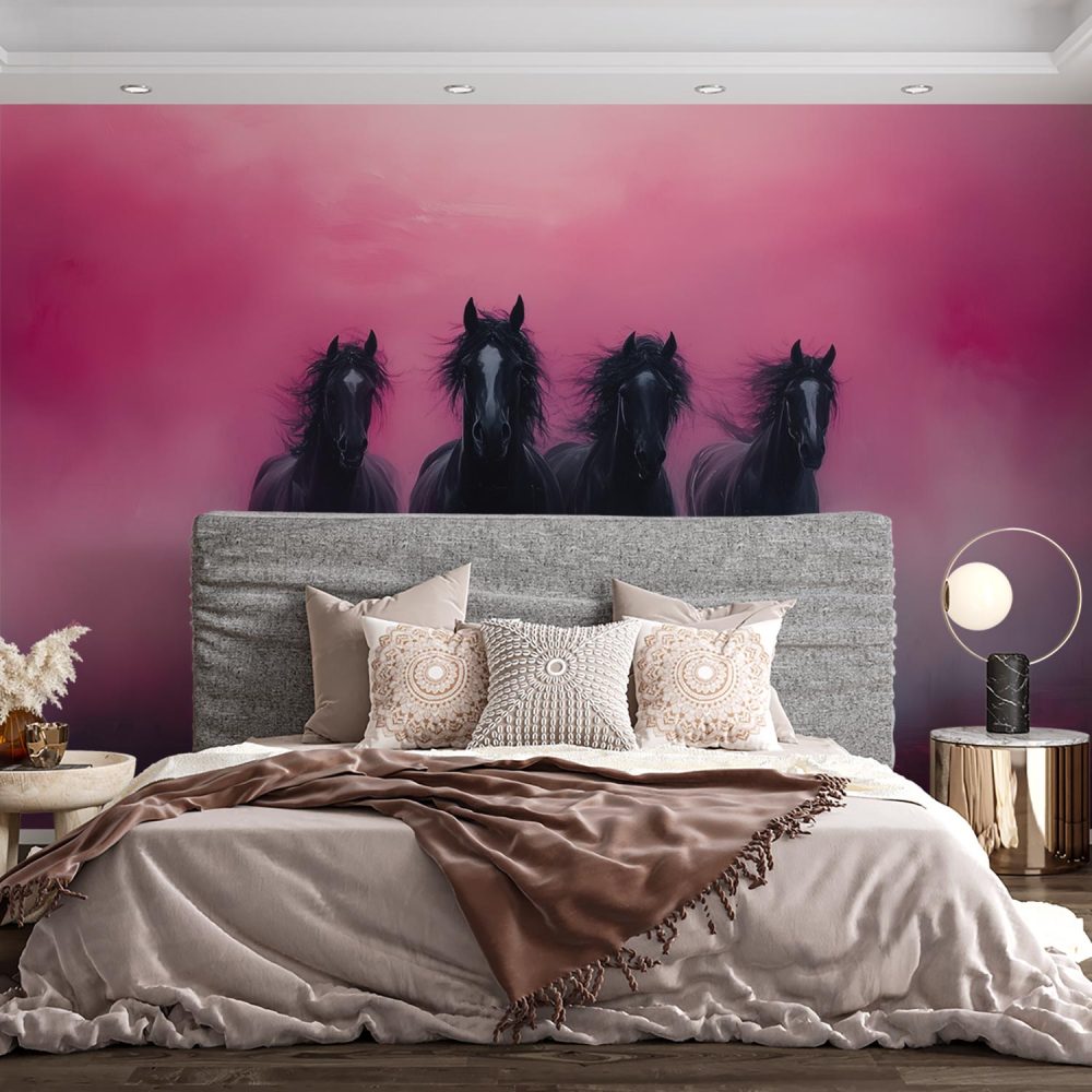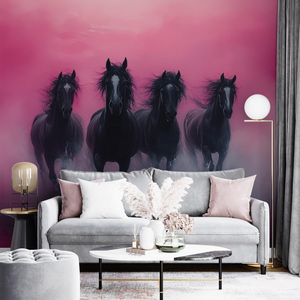 Vier zwarte paarden in galop behang