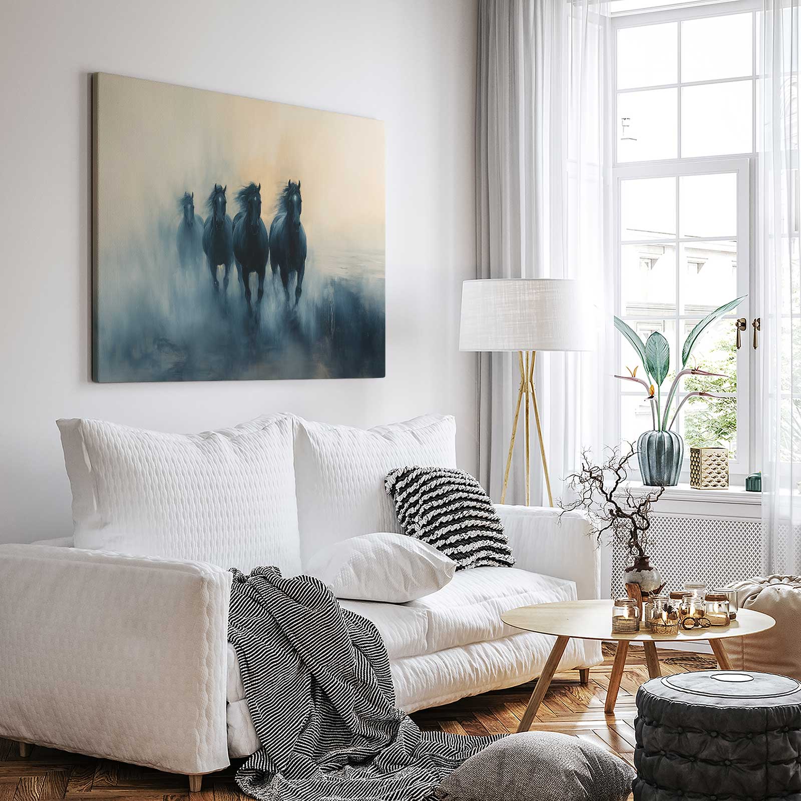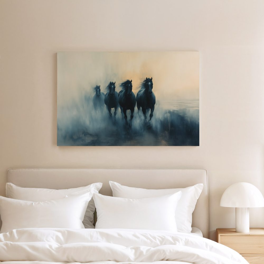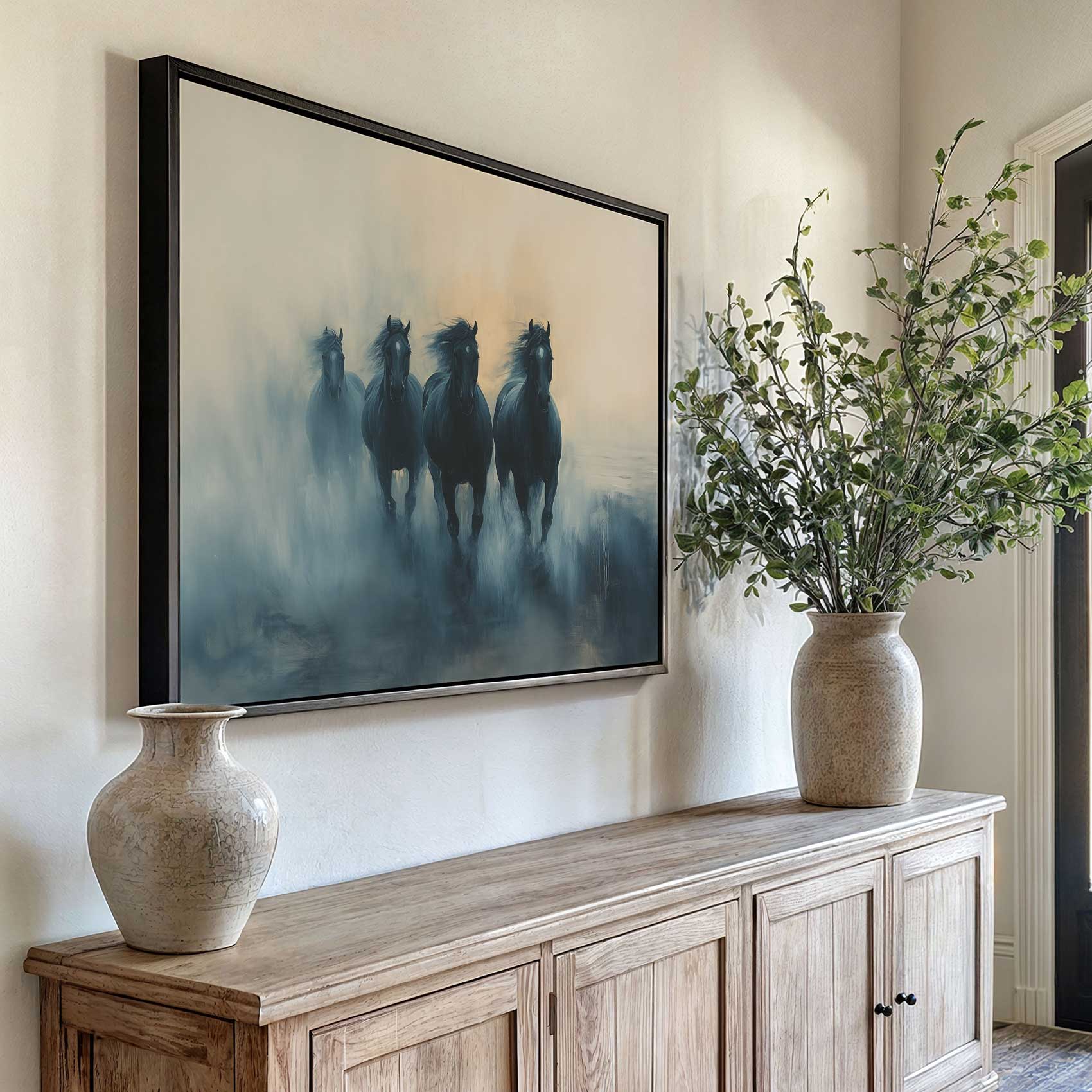 Terug naar collectie / Schilderijen / Dieren Schilderij / Vier zwarte paarden in mist