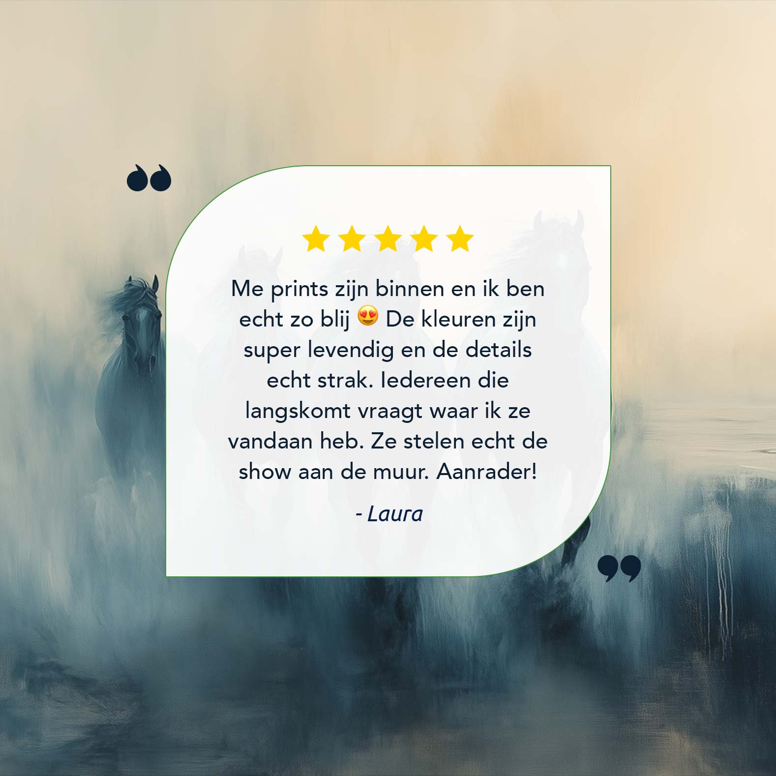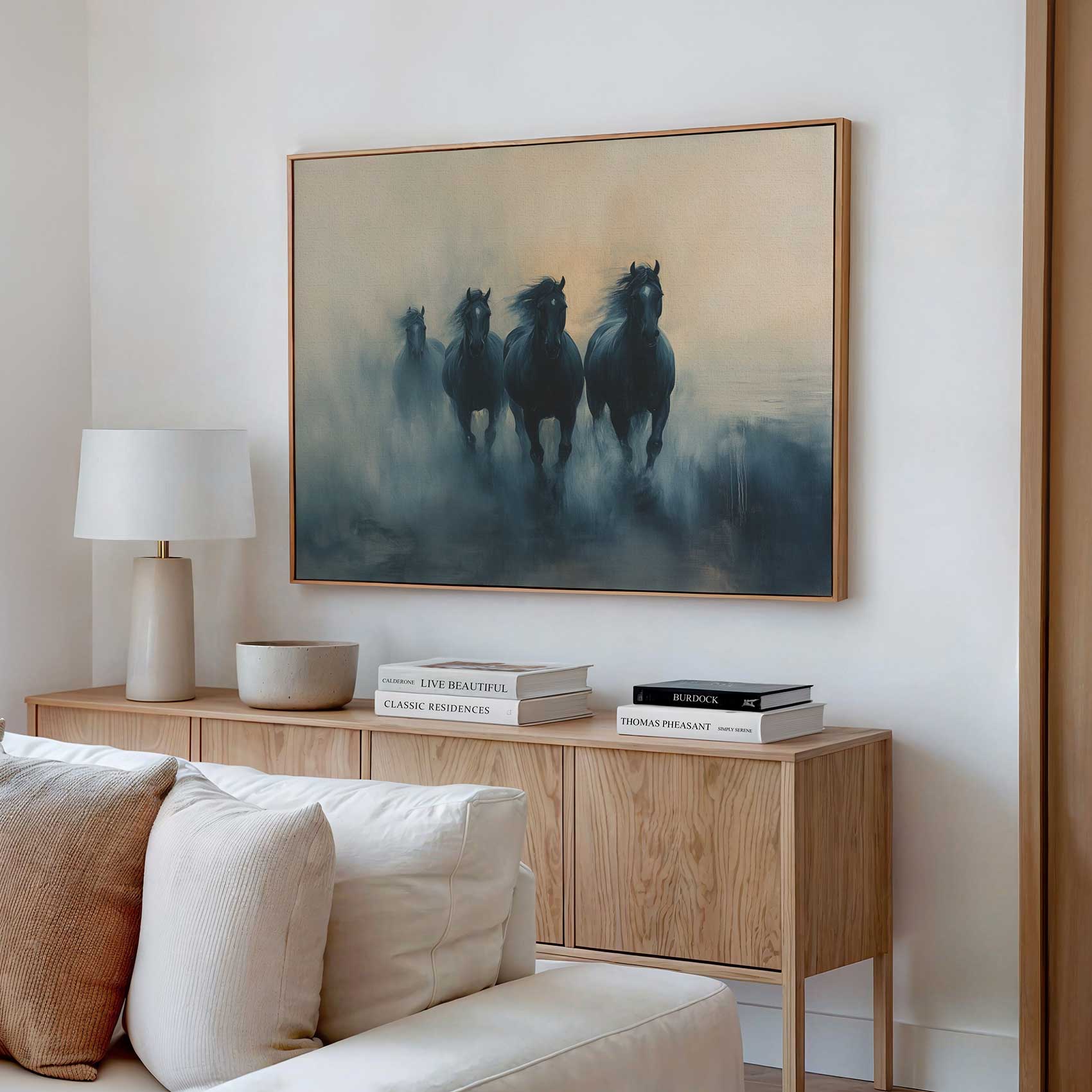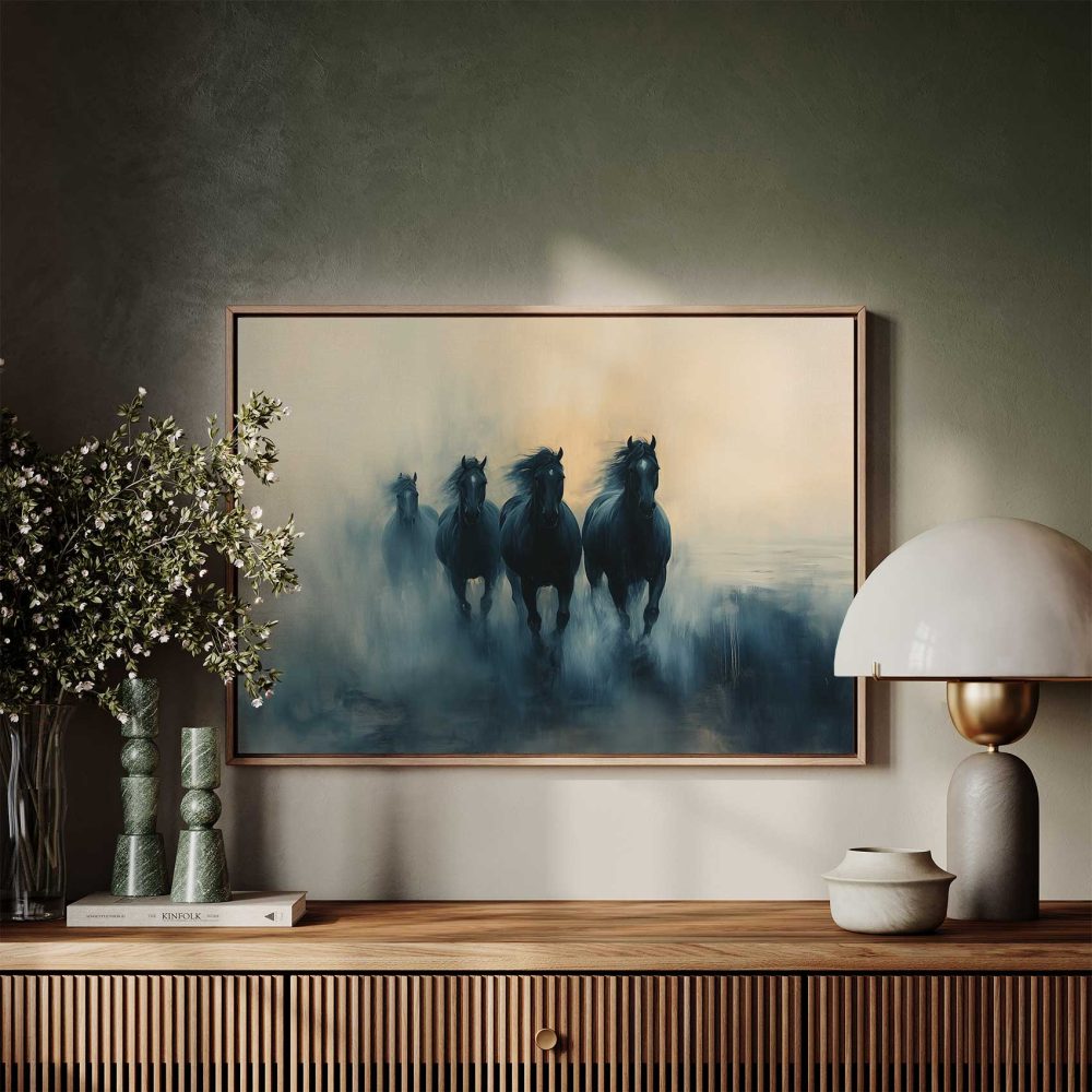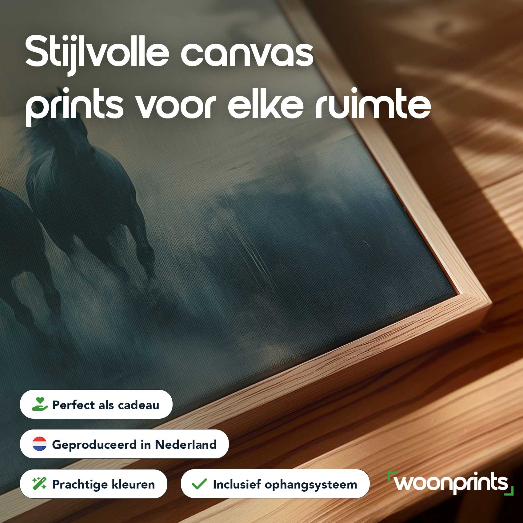 Terug naar collectie / Schilderijen / Dieren Schilderij / Vier zwarte paarden in mist