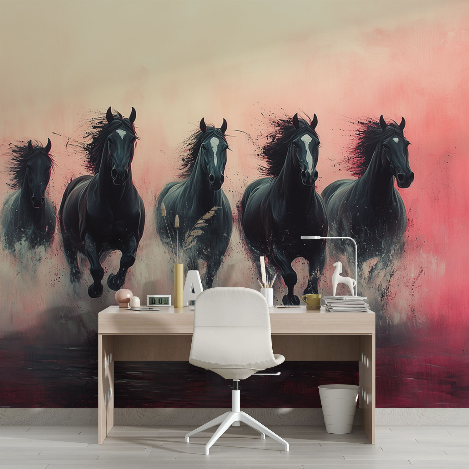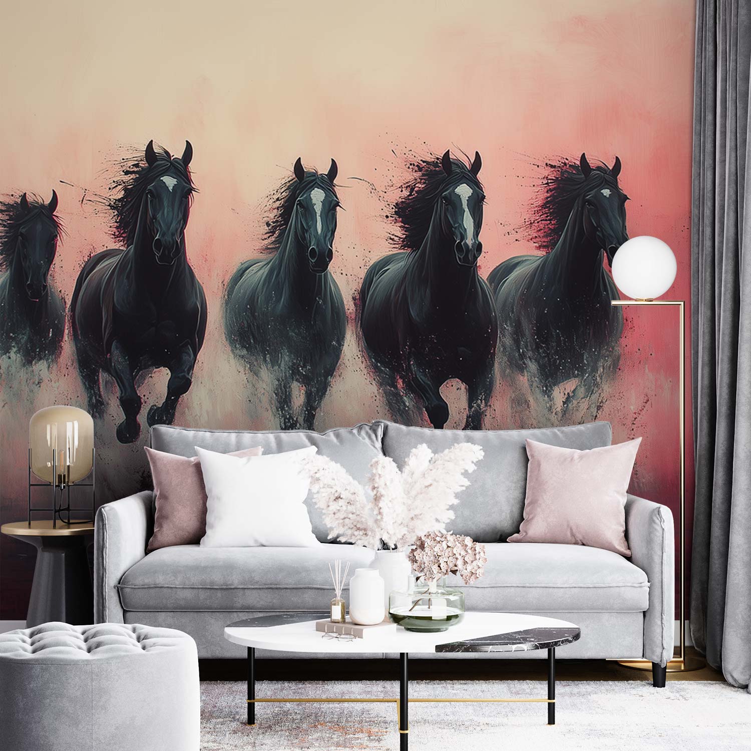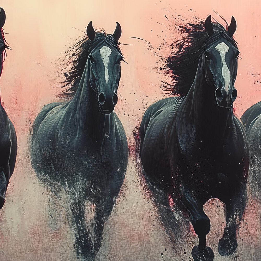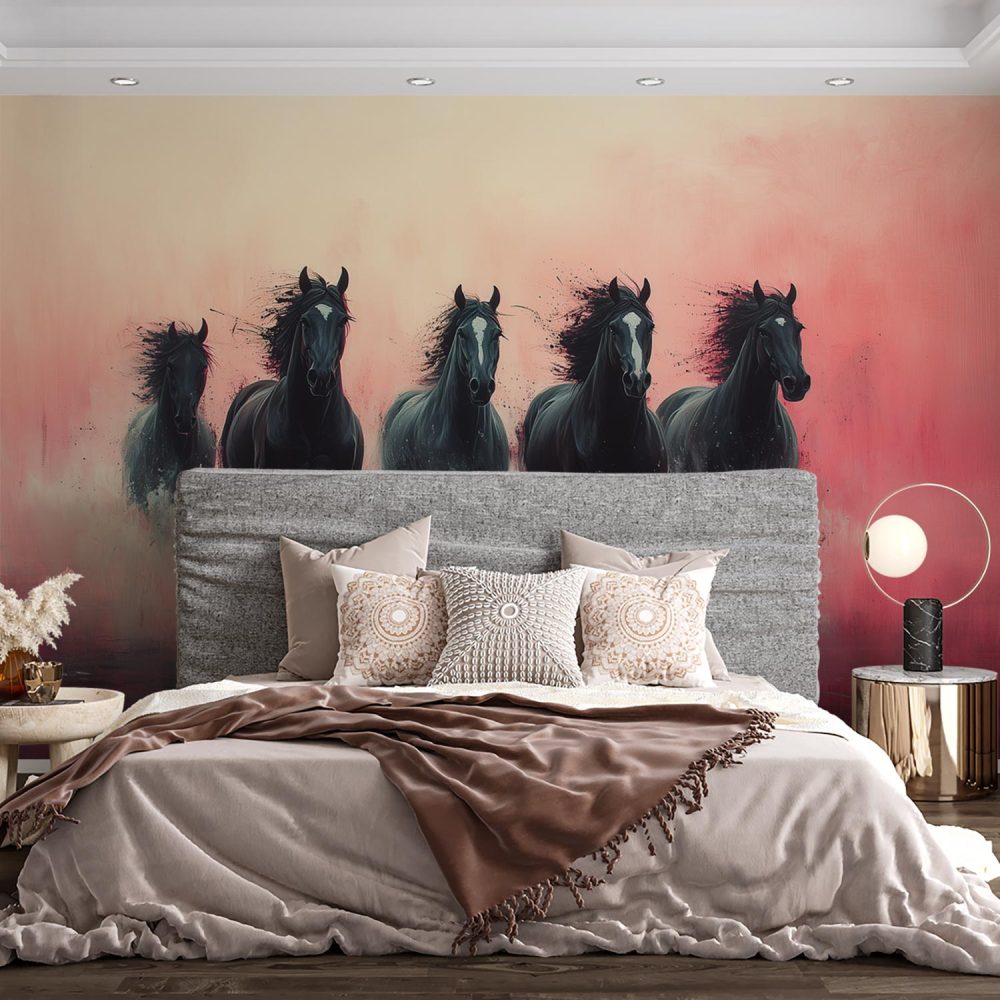 Vijf galopperende zwarte paarden behang