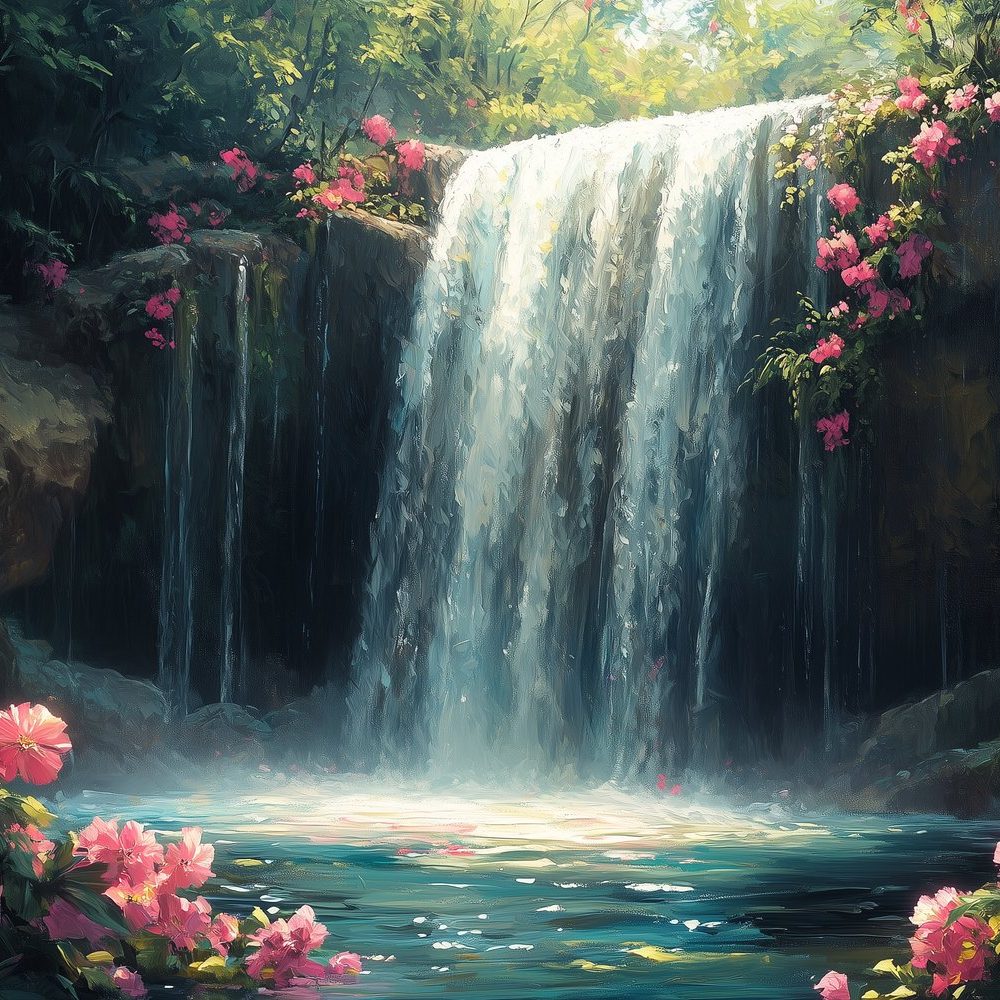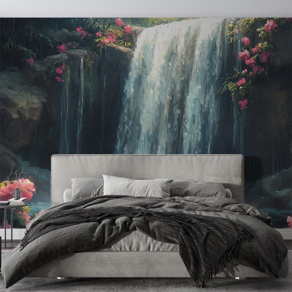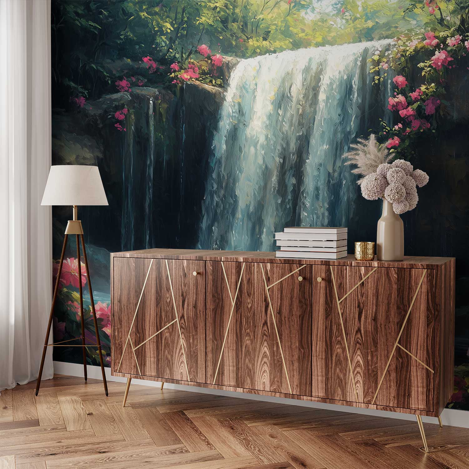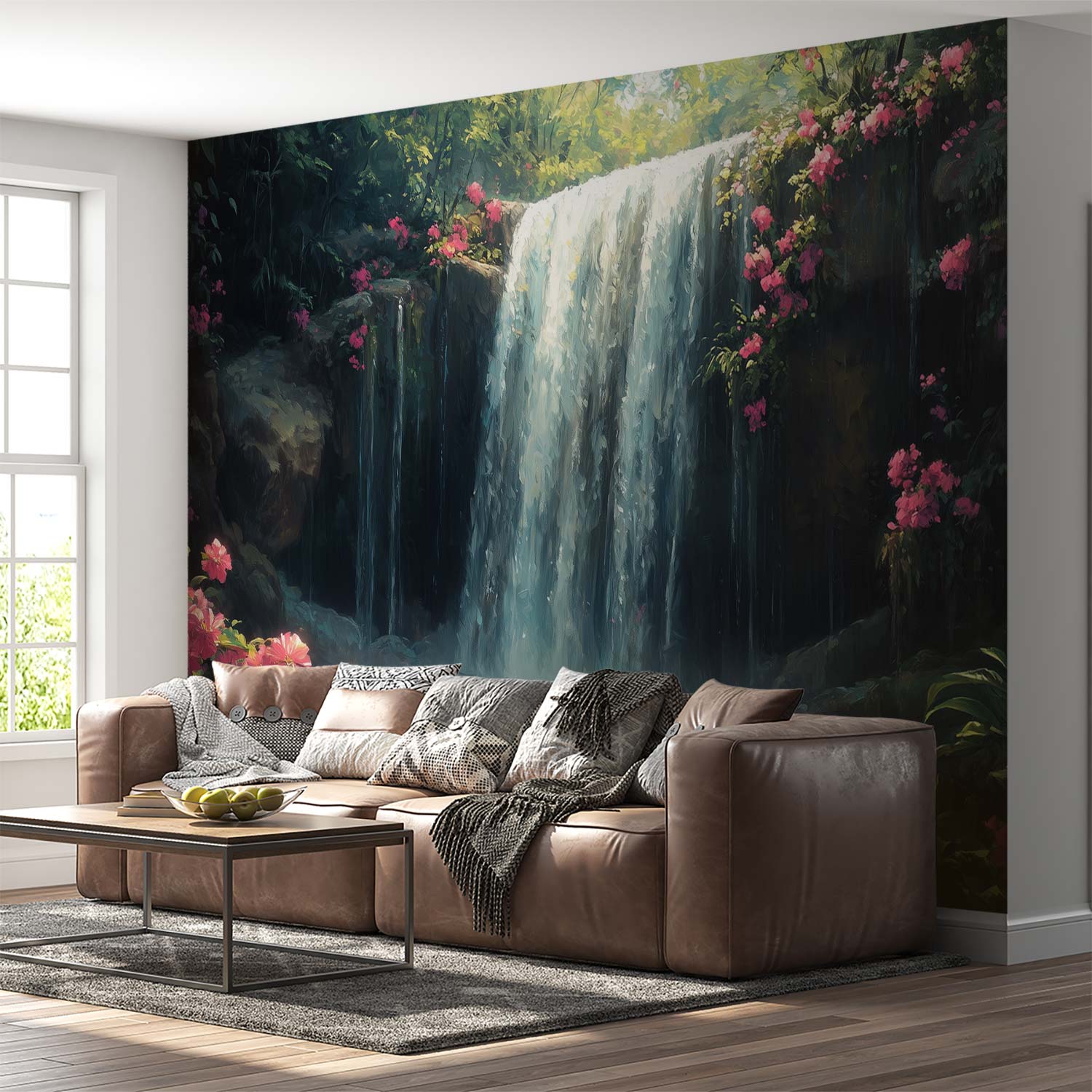 Terug naar collectie / Behang / Vredige waterval met bloemen behang