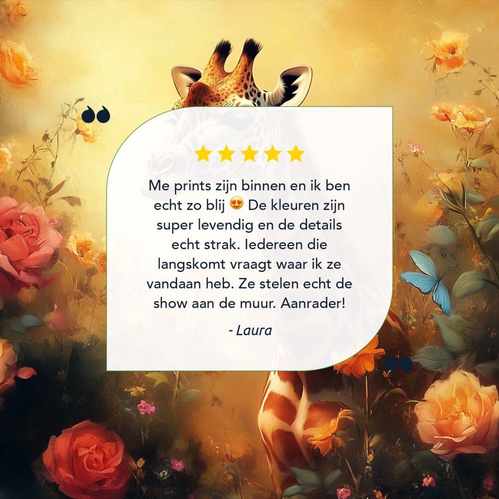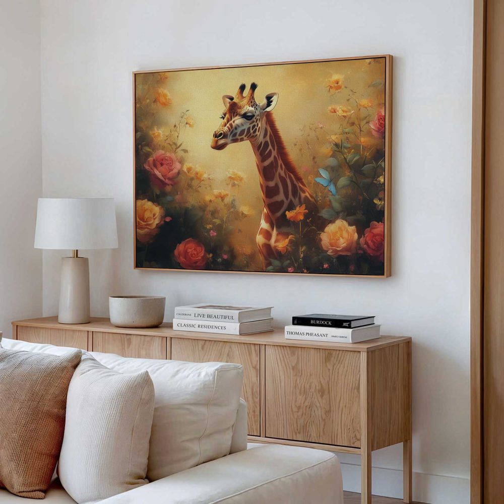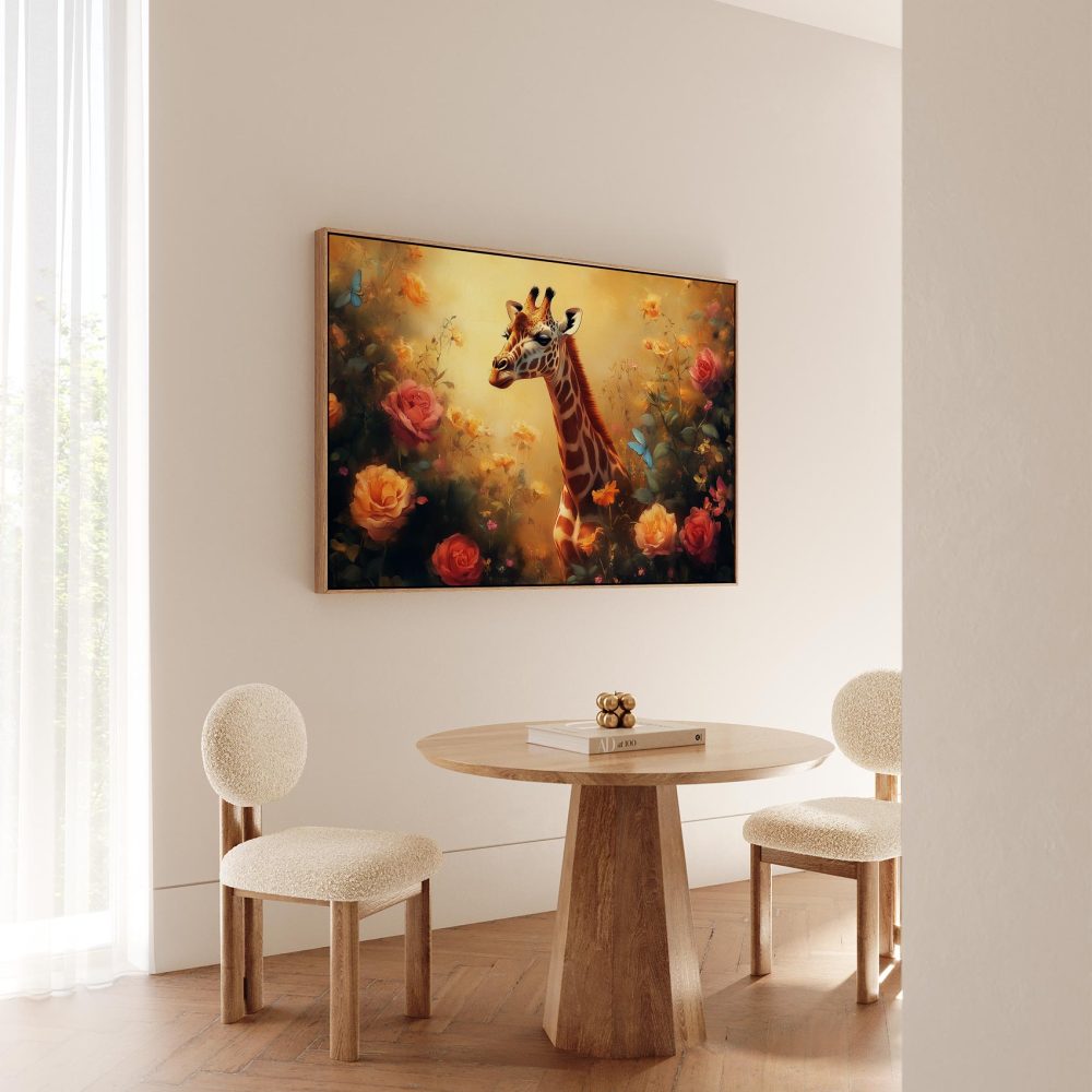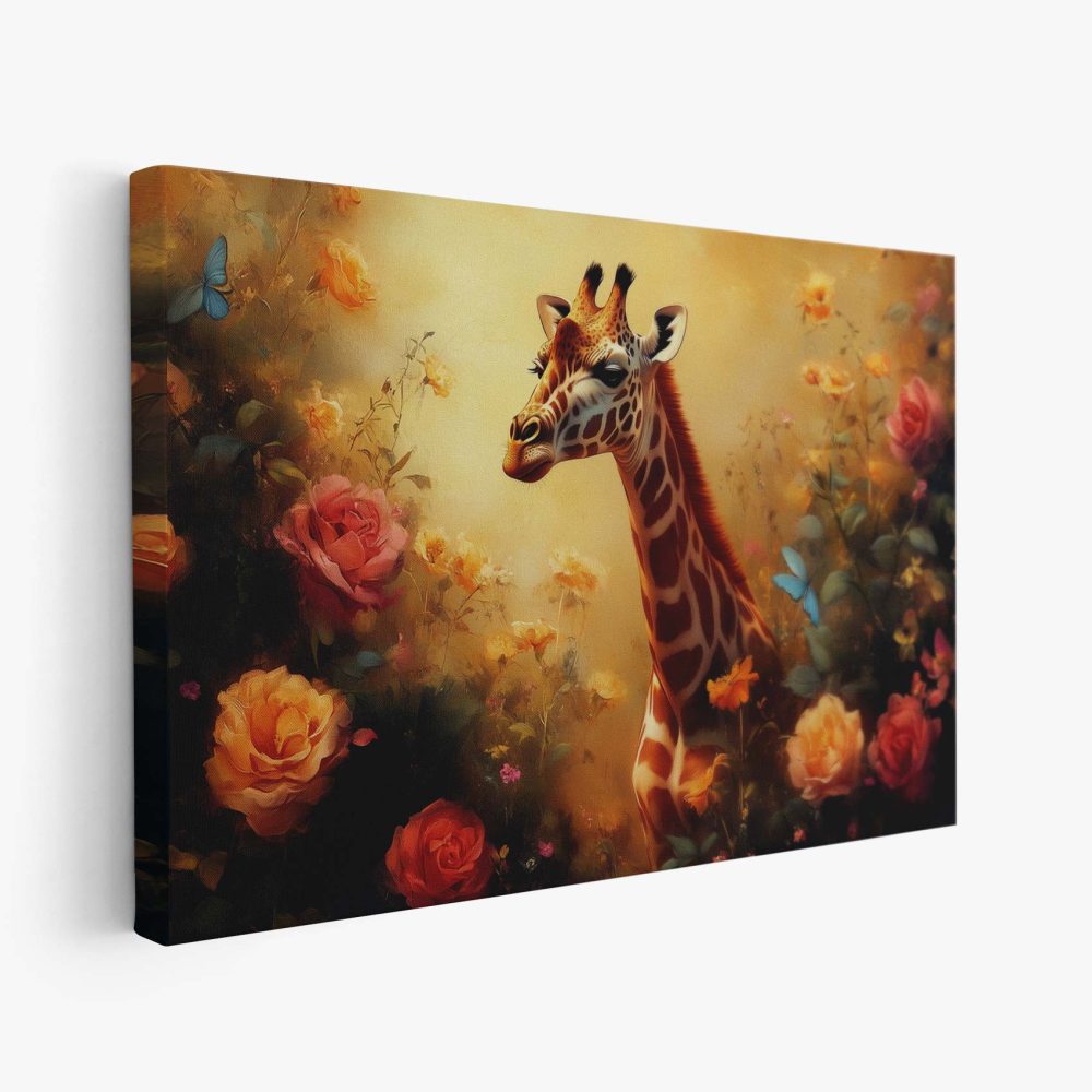 Terug naar collectie / Schilderijen / Bloemen Schilderij / Vrolijke giraf tussen bloemen