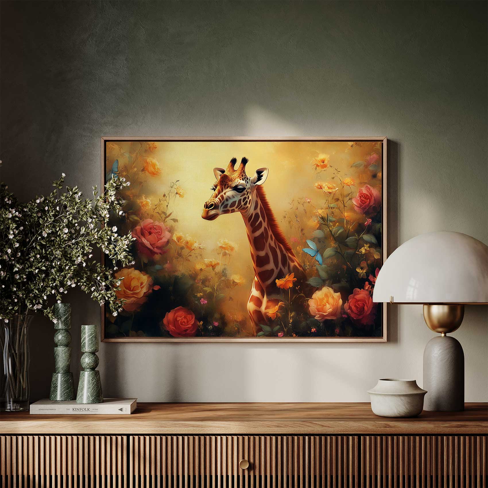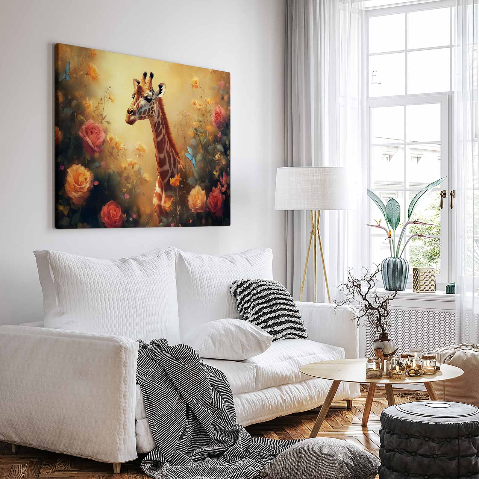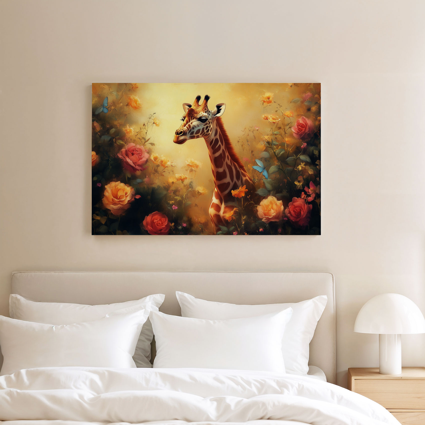 Terug naar collectie / Schilderijen / Bloemen Schilderij / Vrolijke giraf tussen bloemen