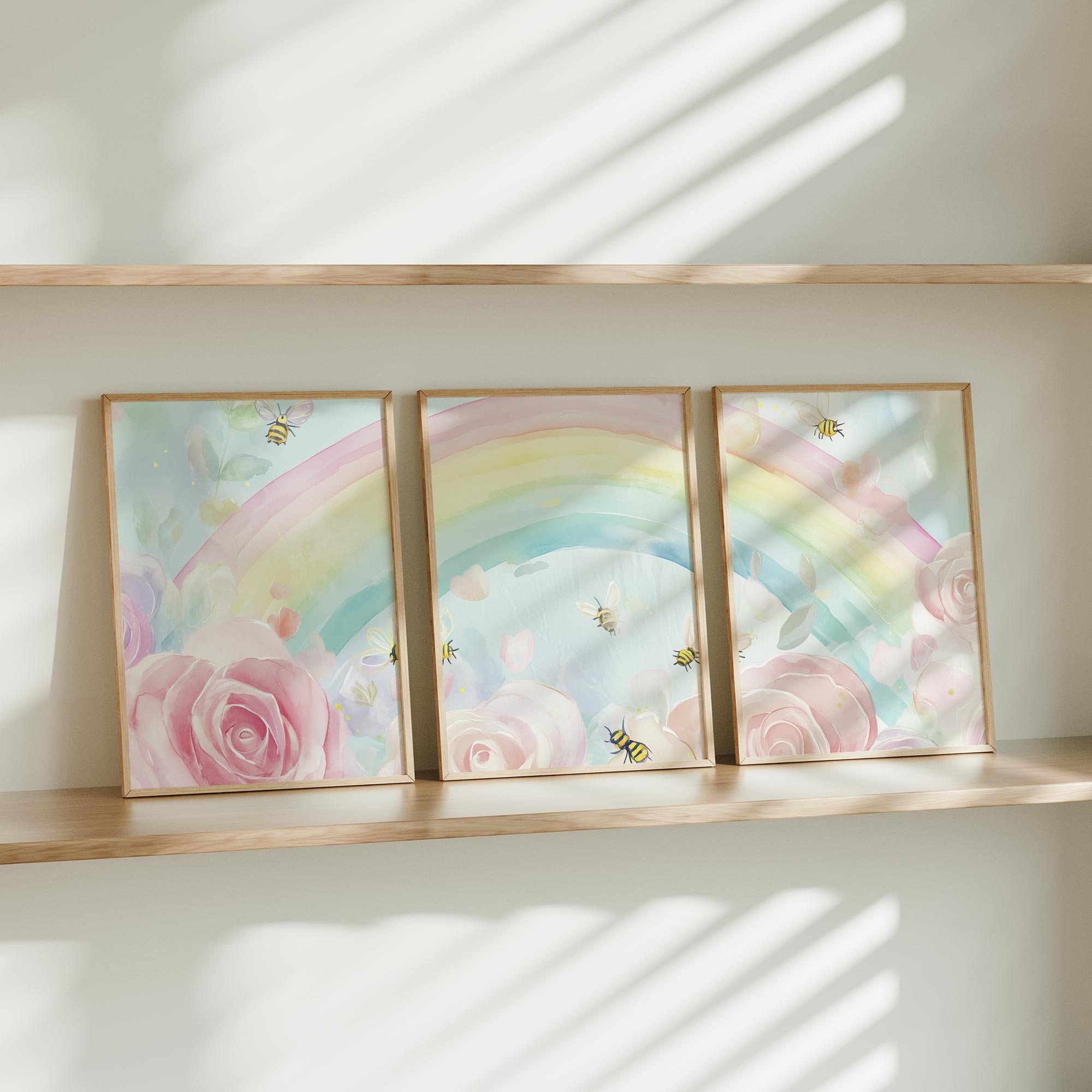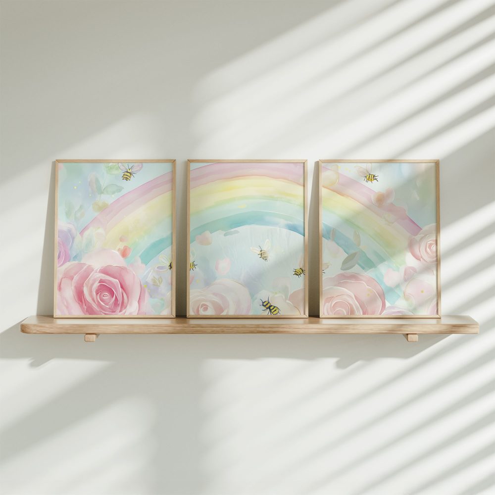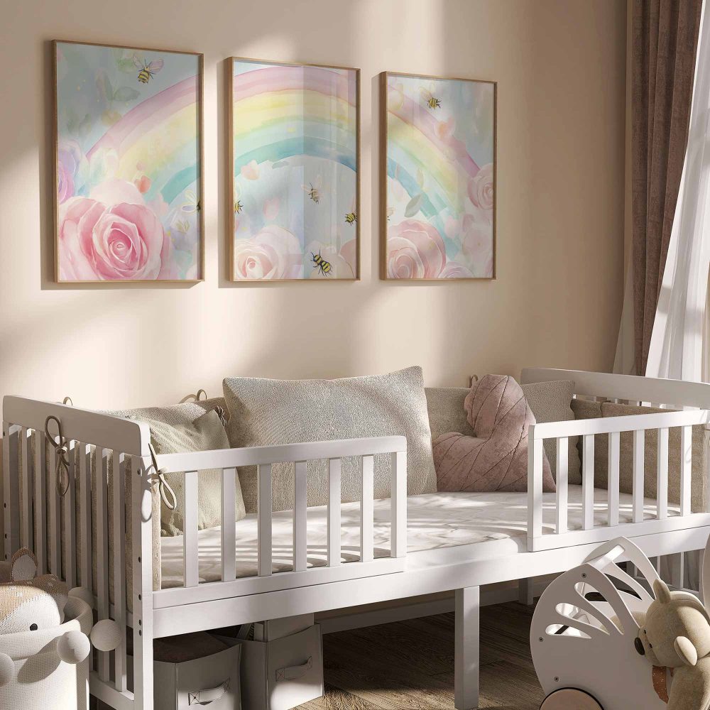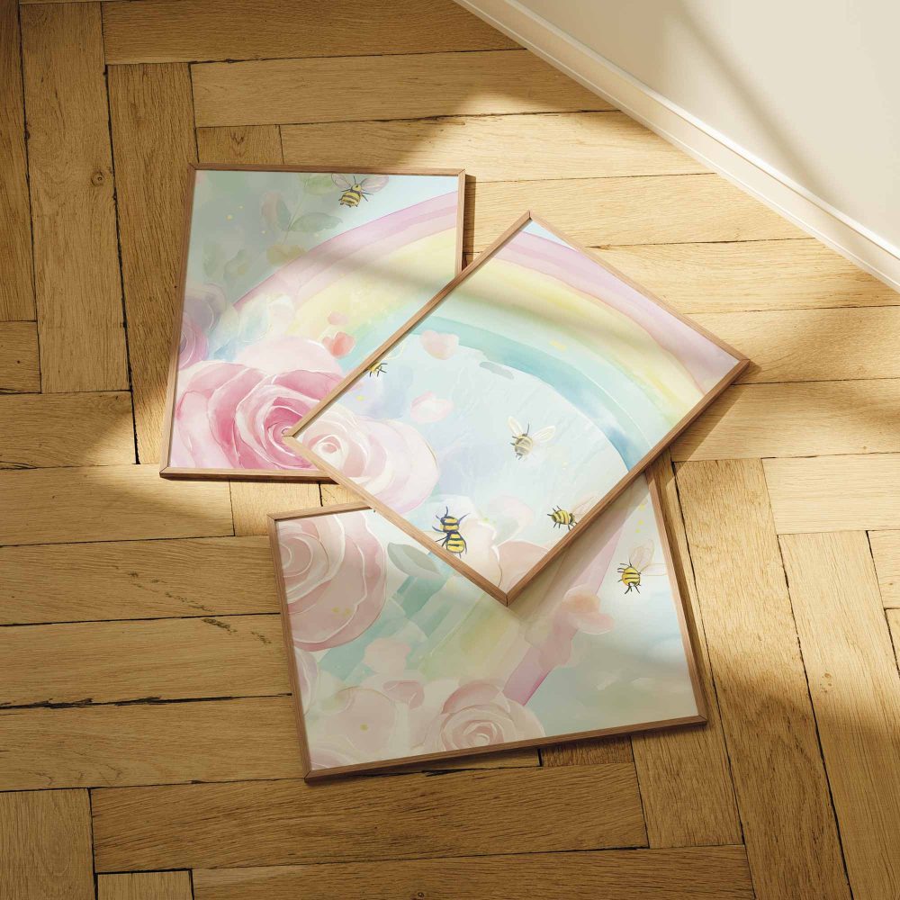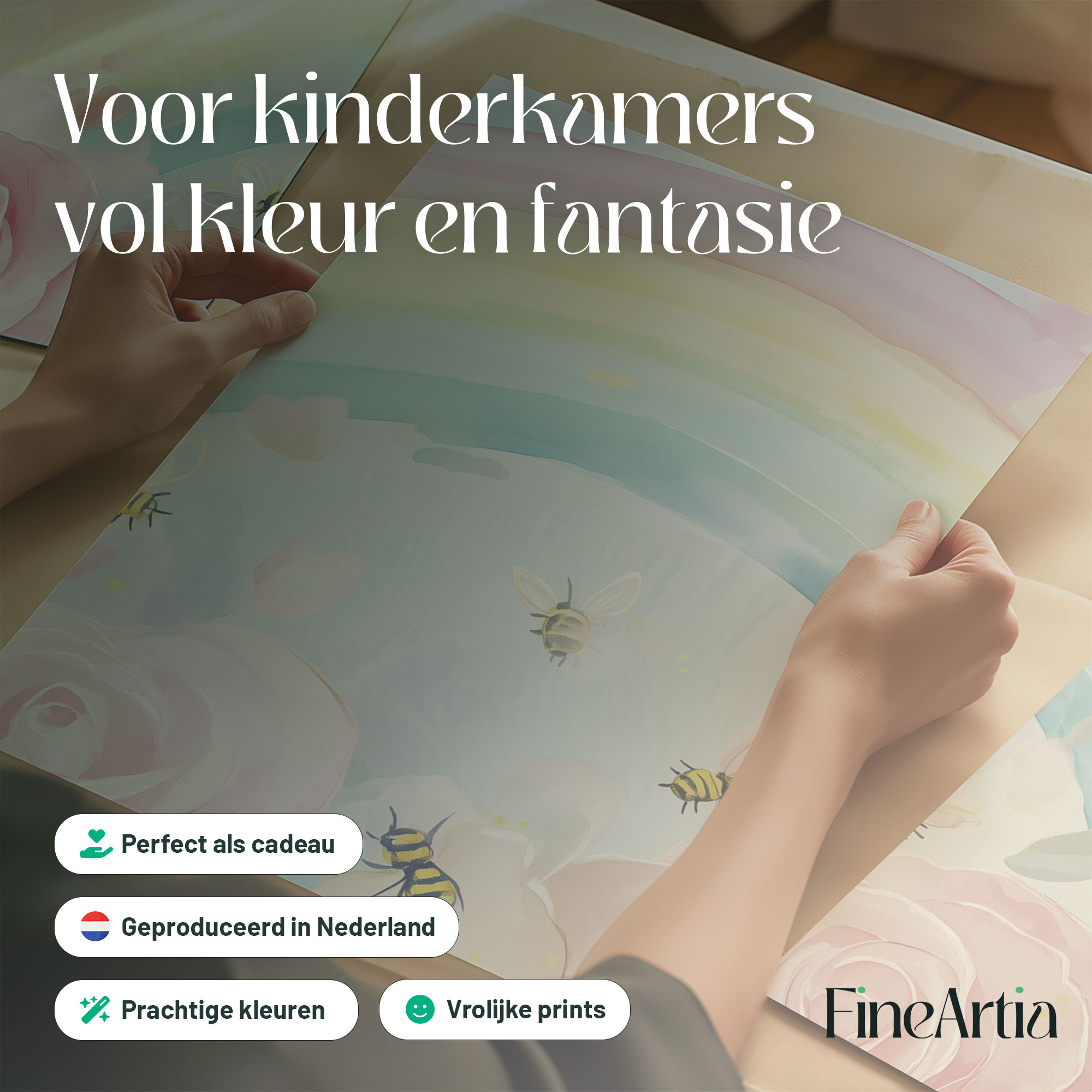 Terug naar collectie / Kinderkamer posters / Bloemen posters / Vrolijke regenboog met rozen en bijtjes