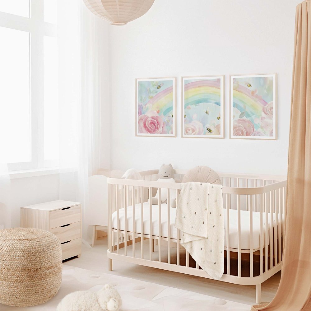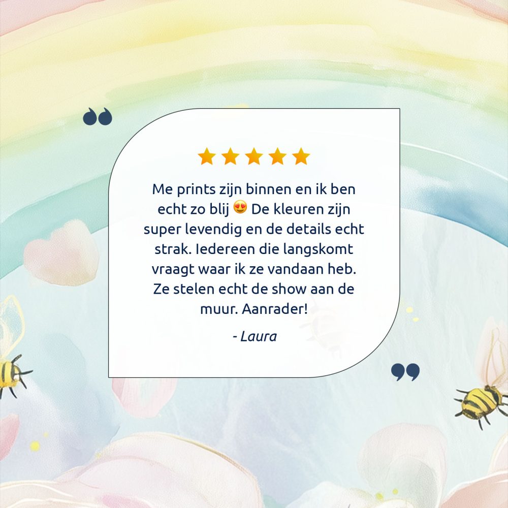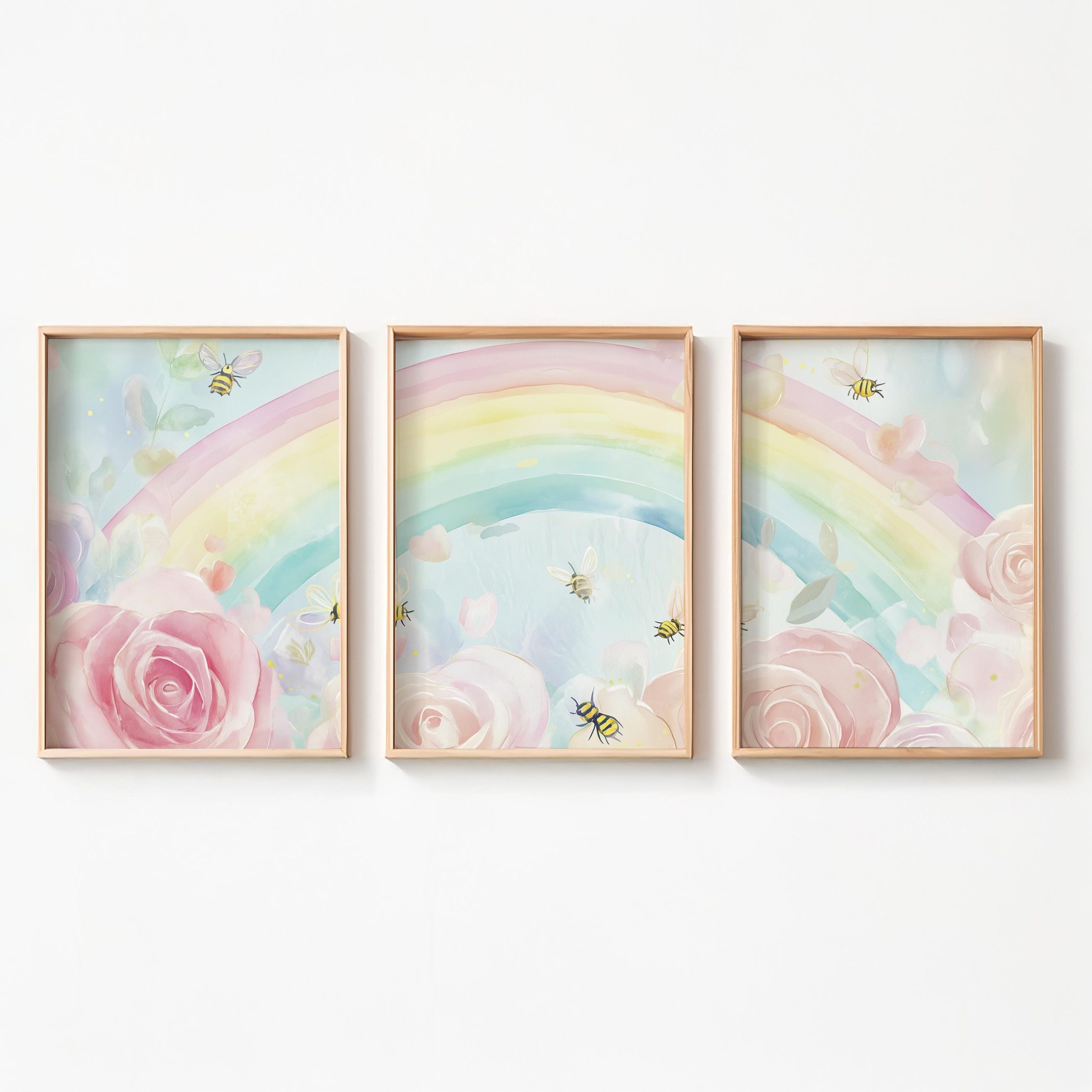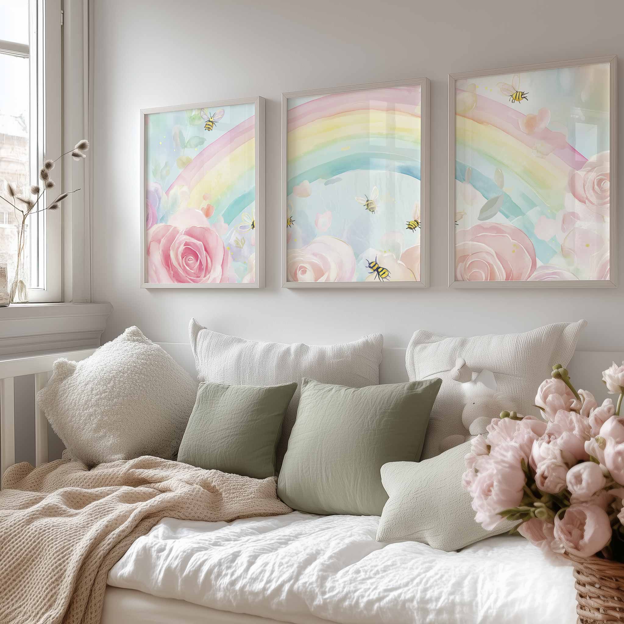 Terug naar collectie / Kinderkamer posters / Bloemen posters / Vrolijke regenboog met rozen en bijtjes