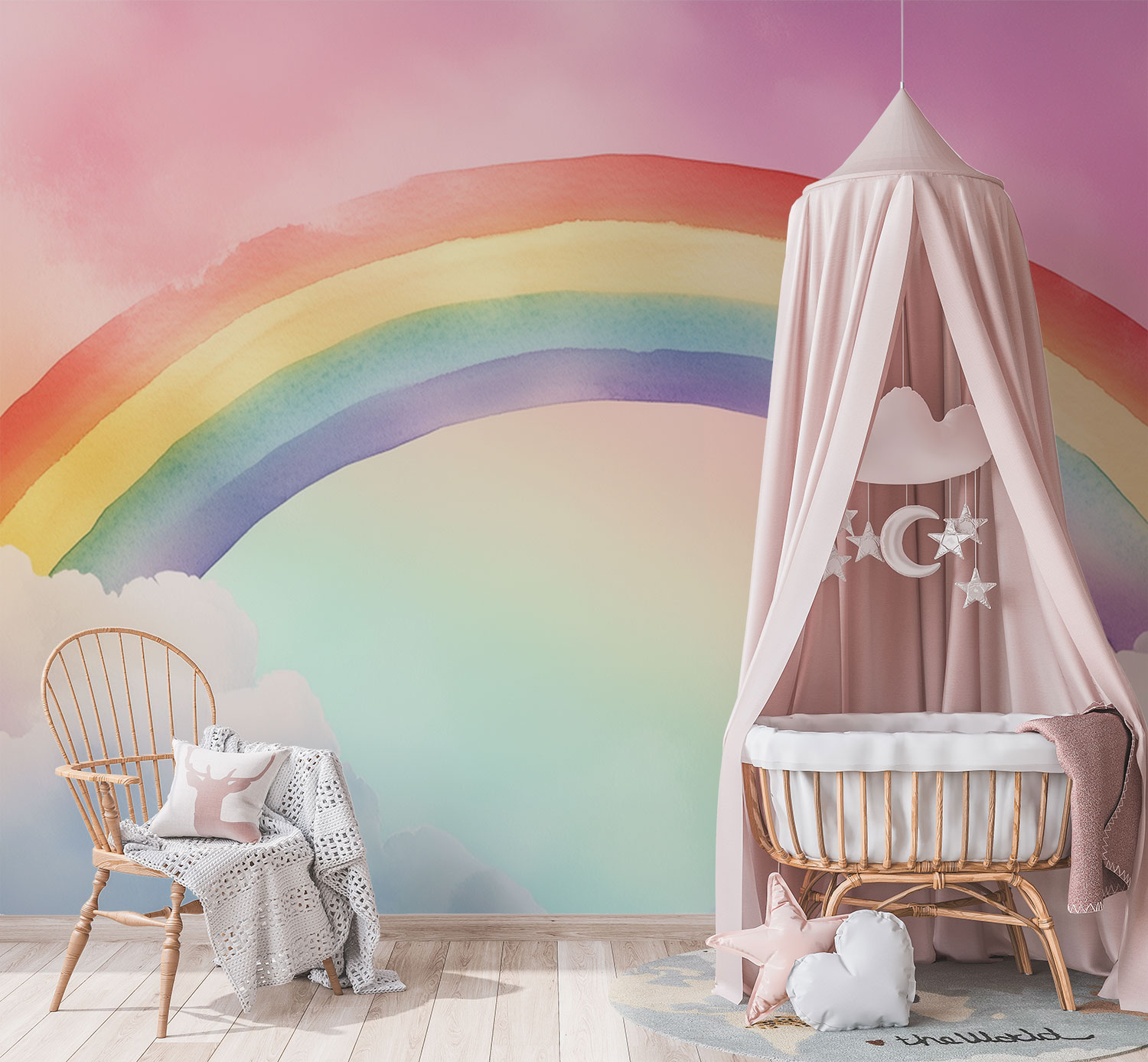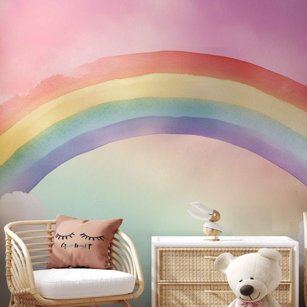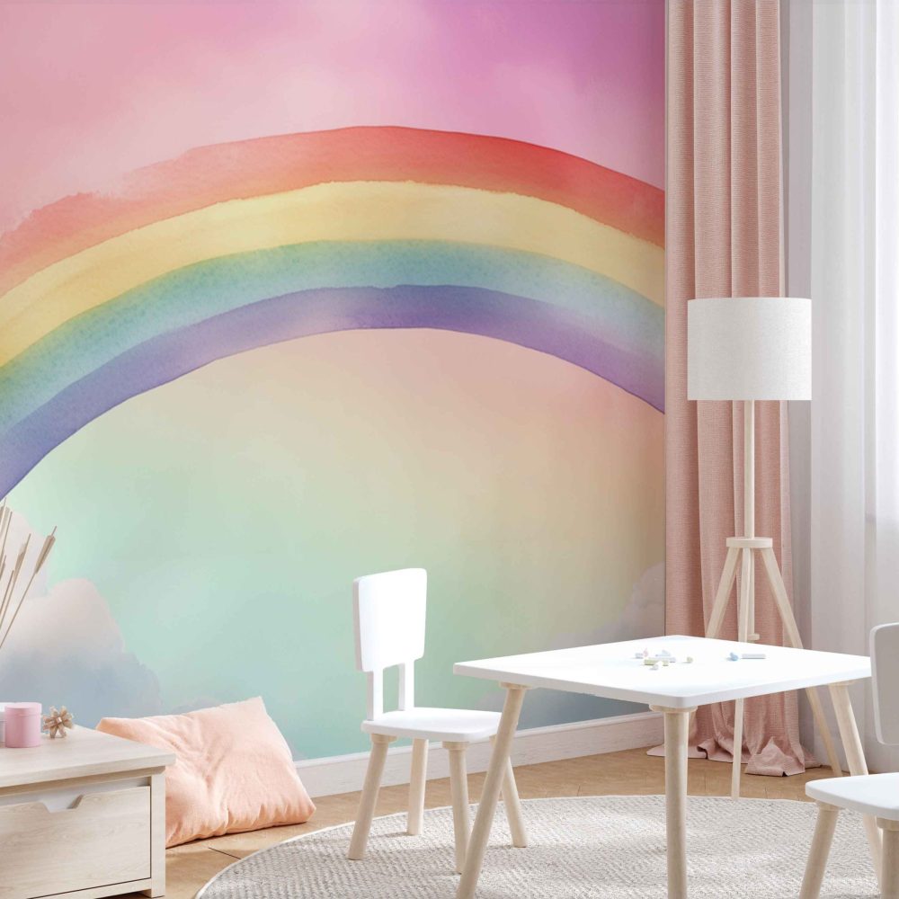 Terug naar collectie / Behang / Kinderkamer behang / Babykamer behang / Vrolijke Regenboog Wolkenhemel behang