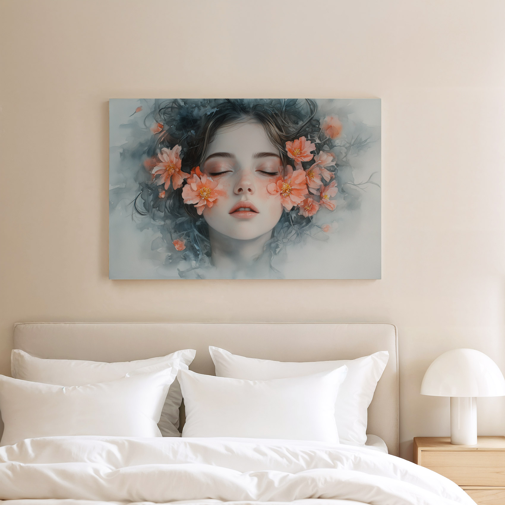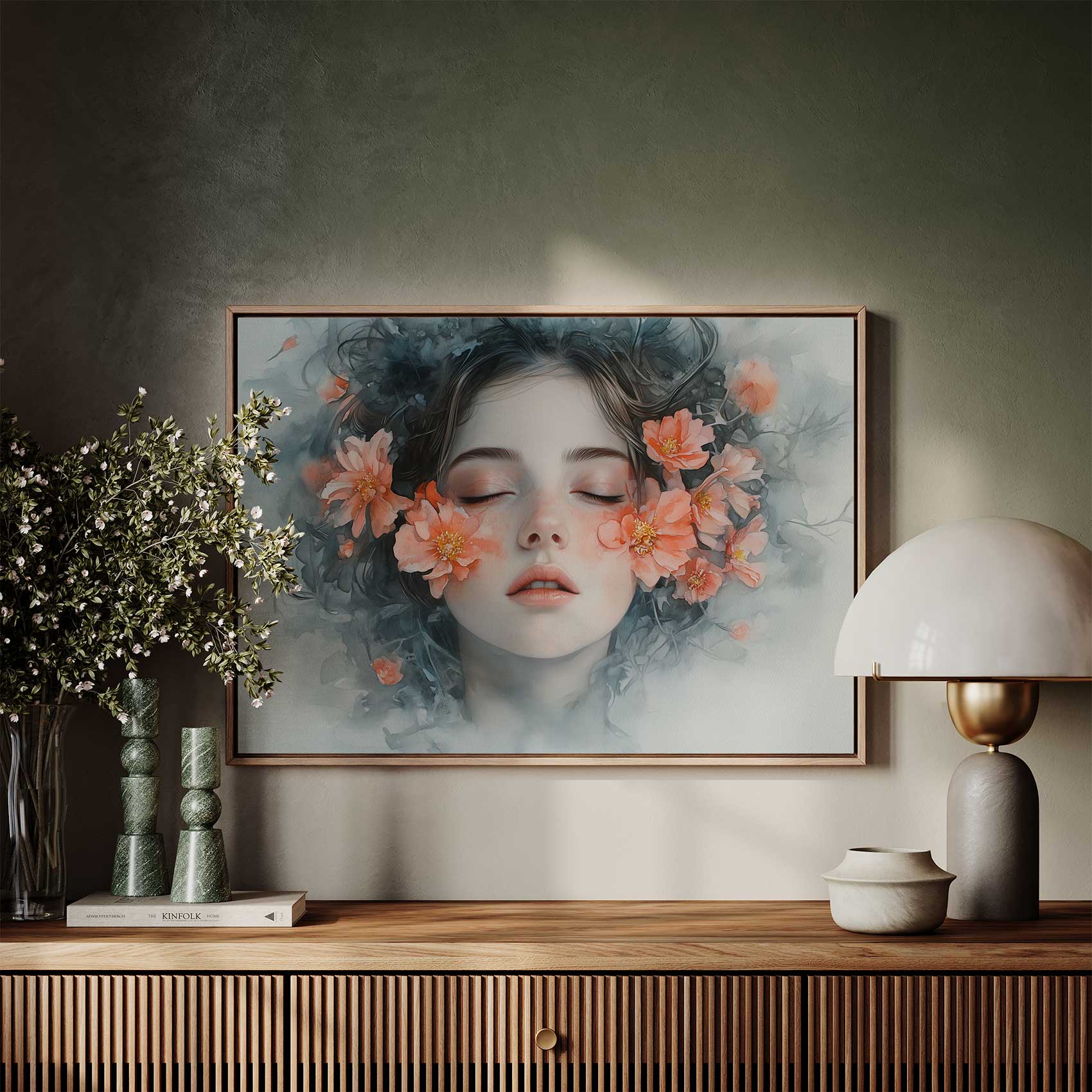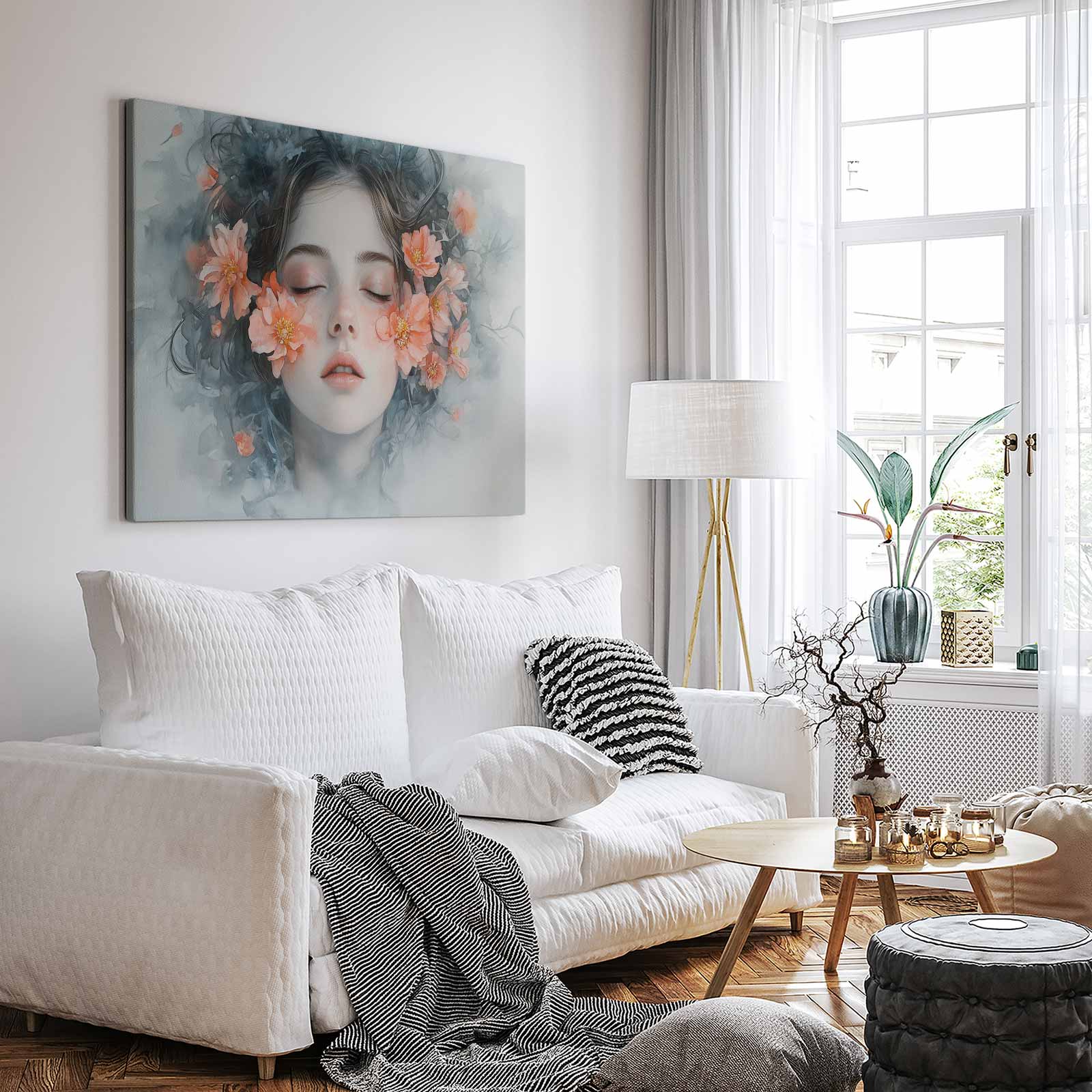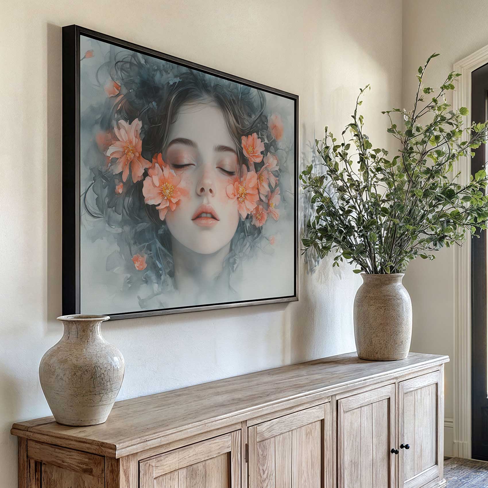 Terug naar collectie / Schilderijen / Bloemen Schilderij / Vrouw omringd door oranje bloemen