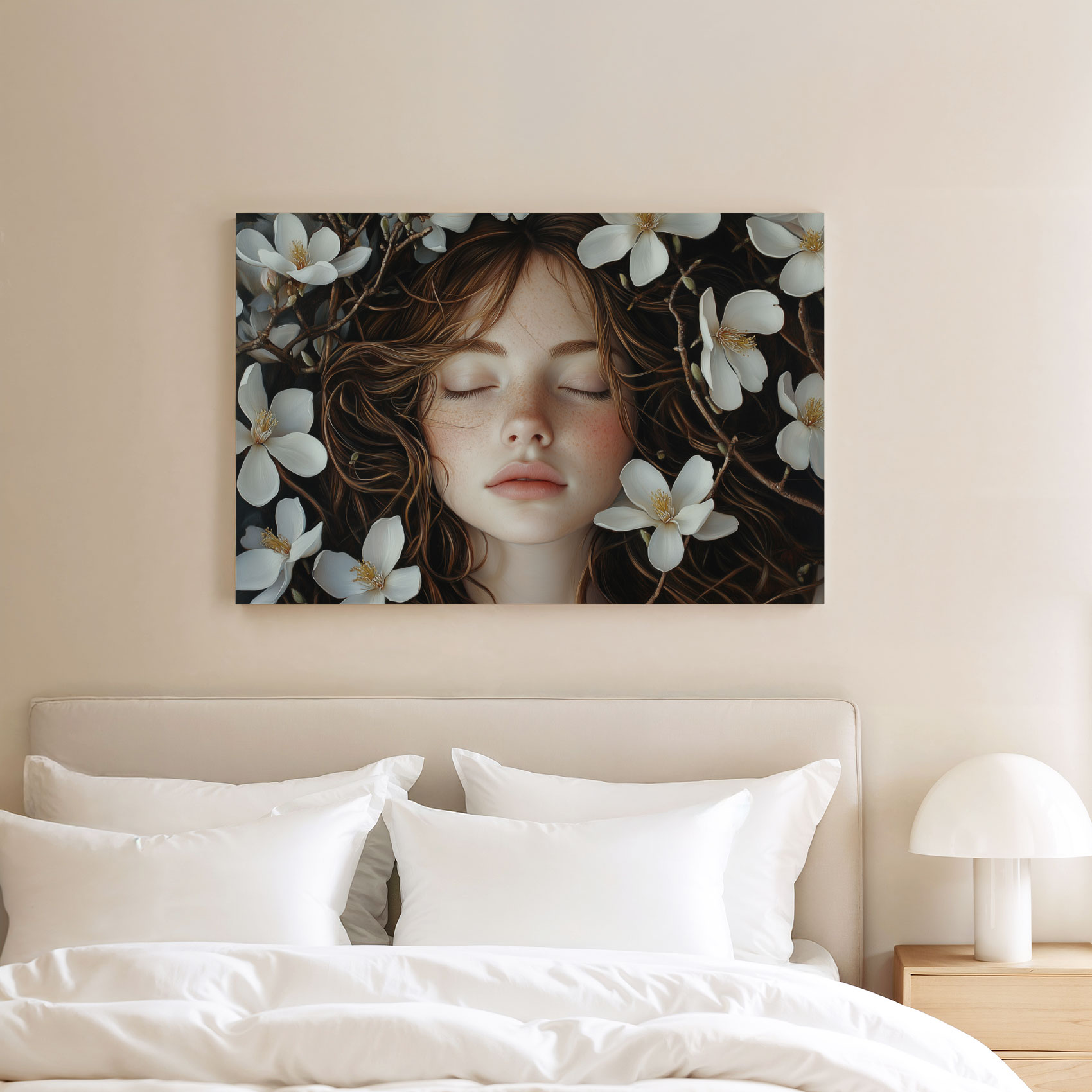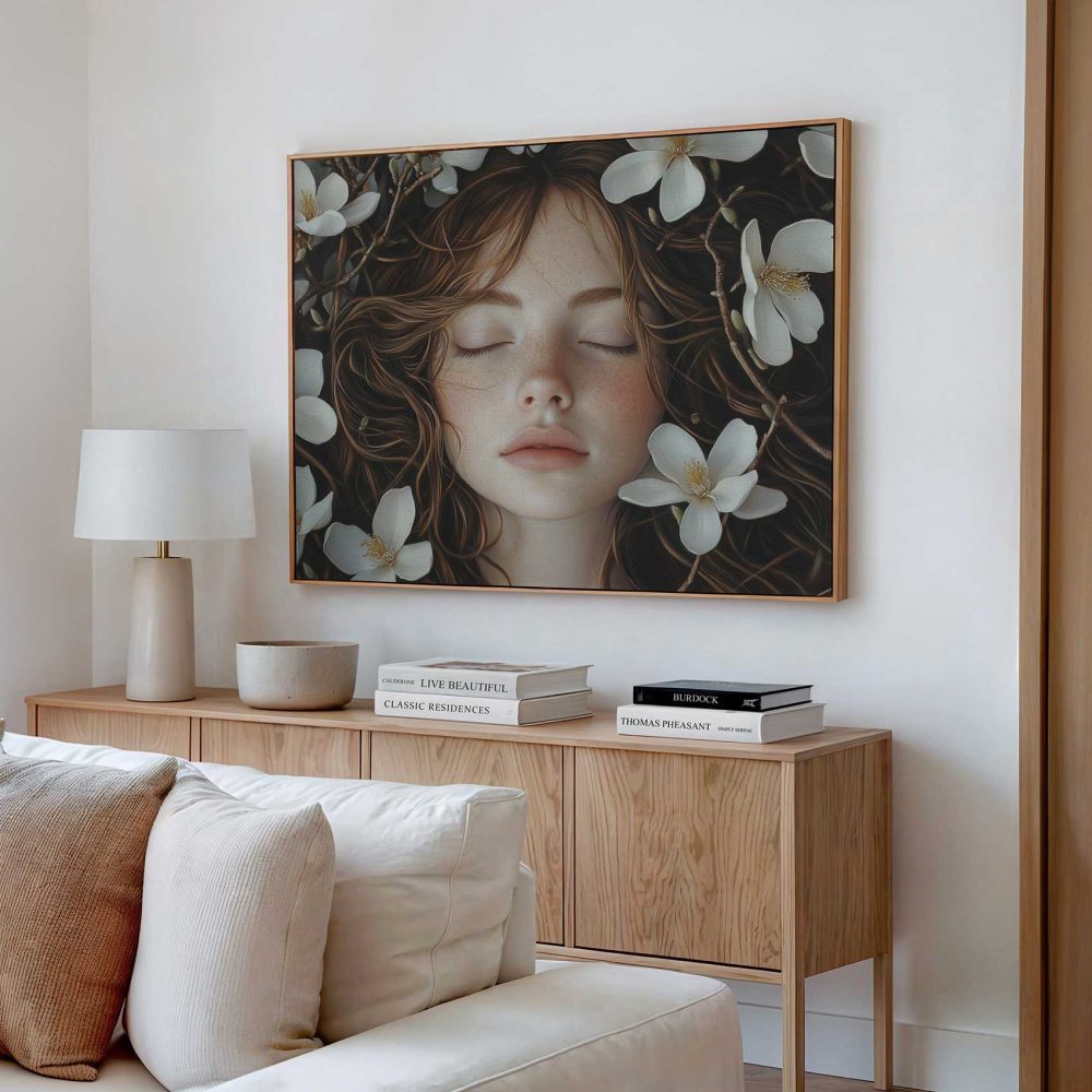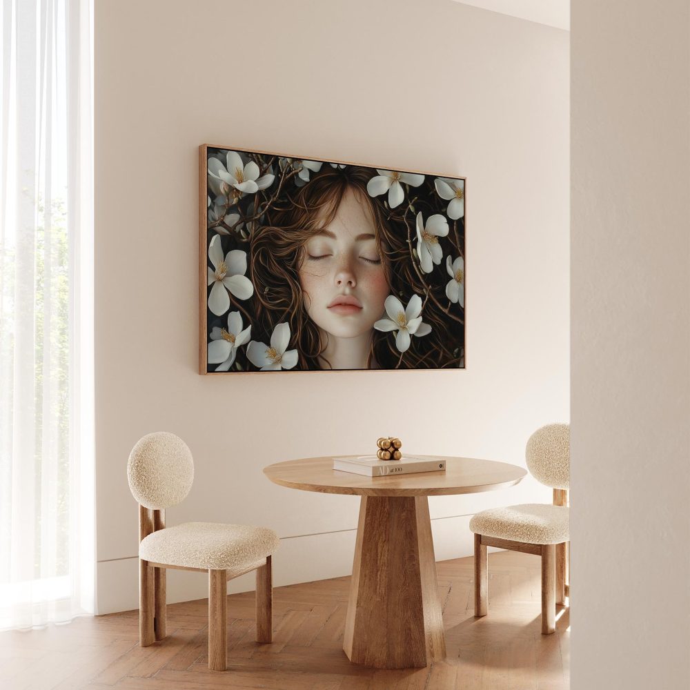 Terug naar collectie / Schilderijen / Bloemen Schilderij / Vrouw sluimert tussen witte bloemen