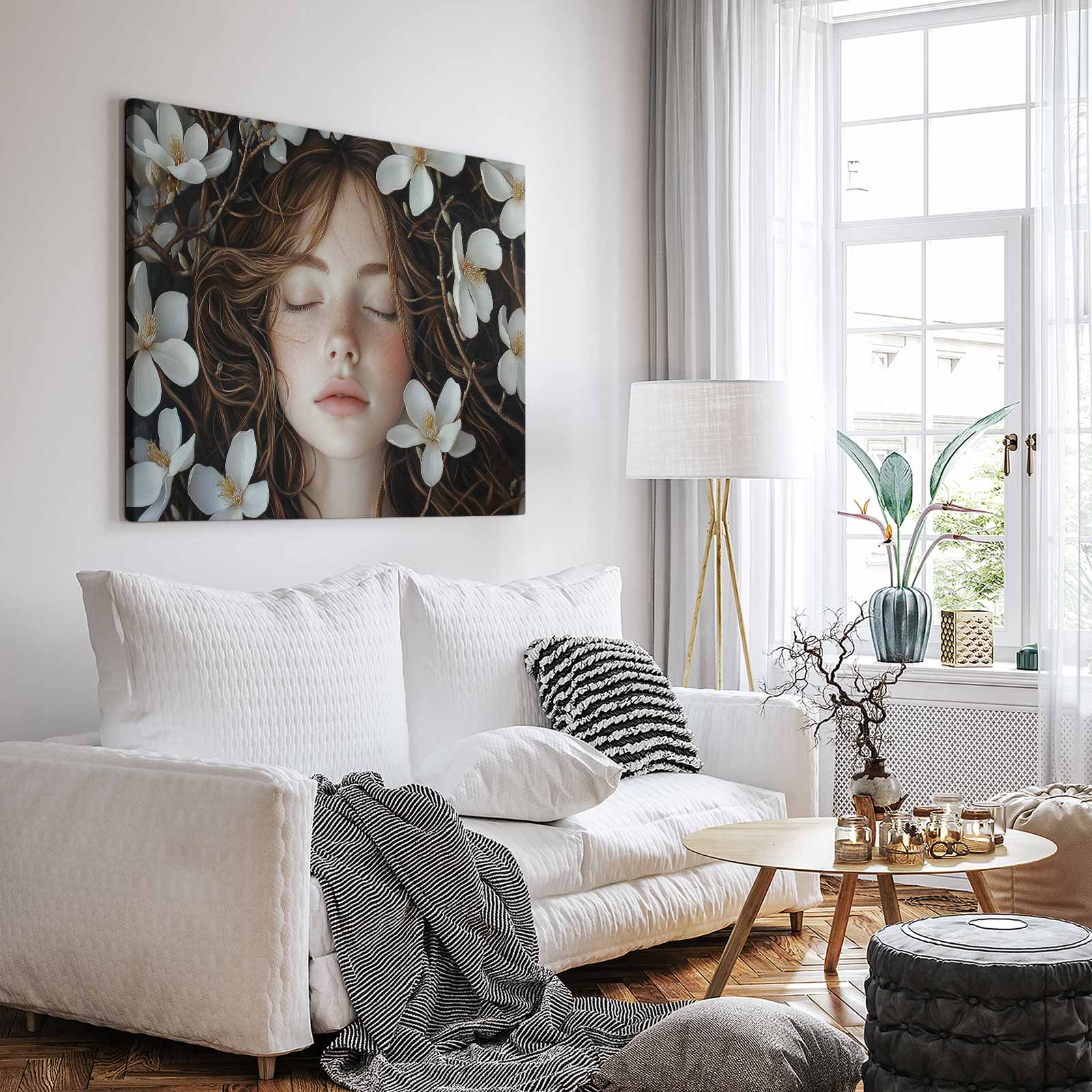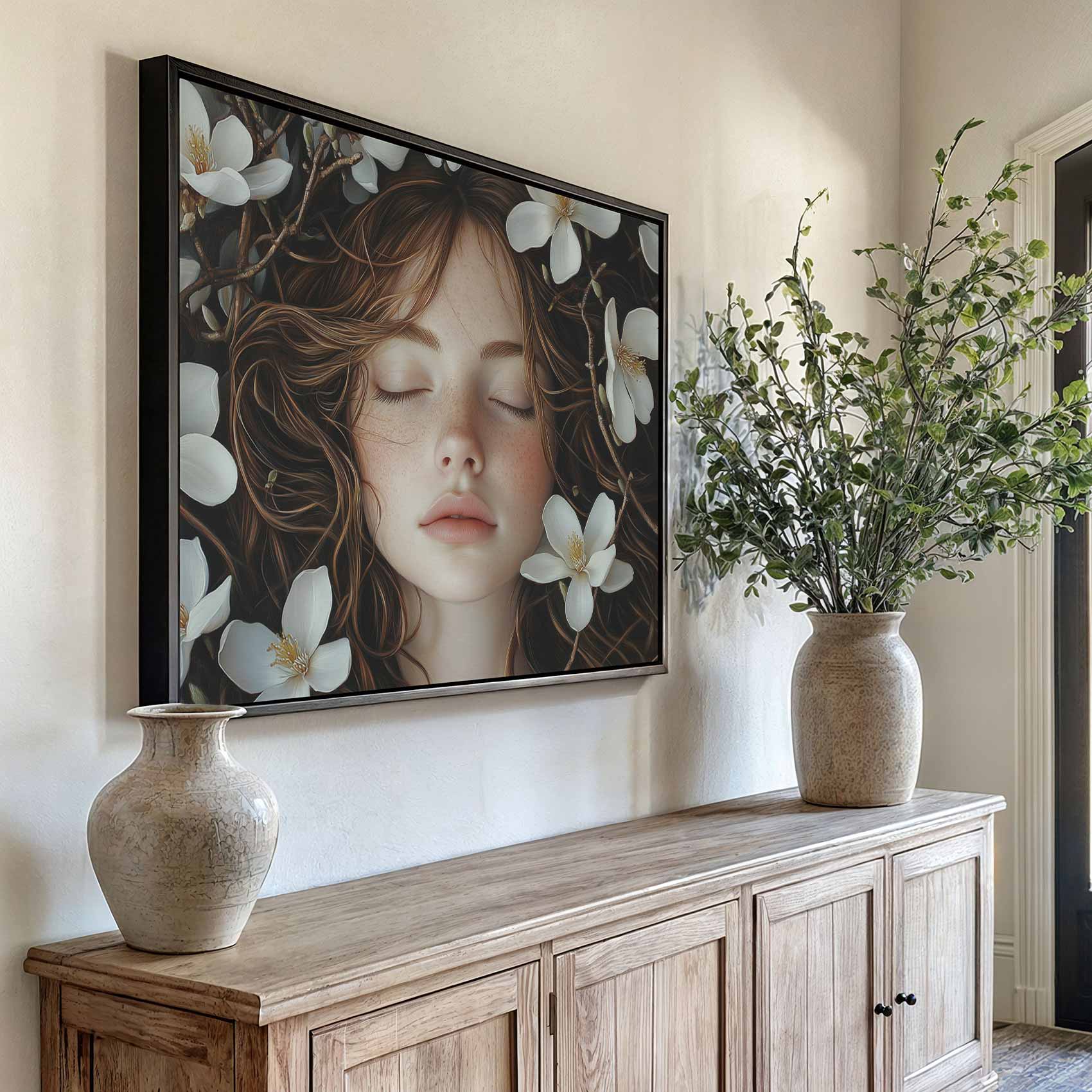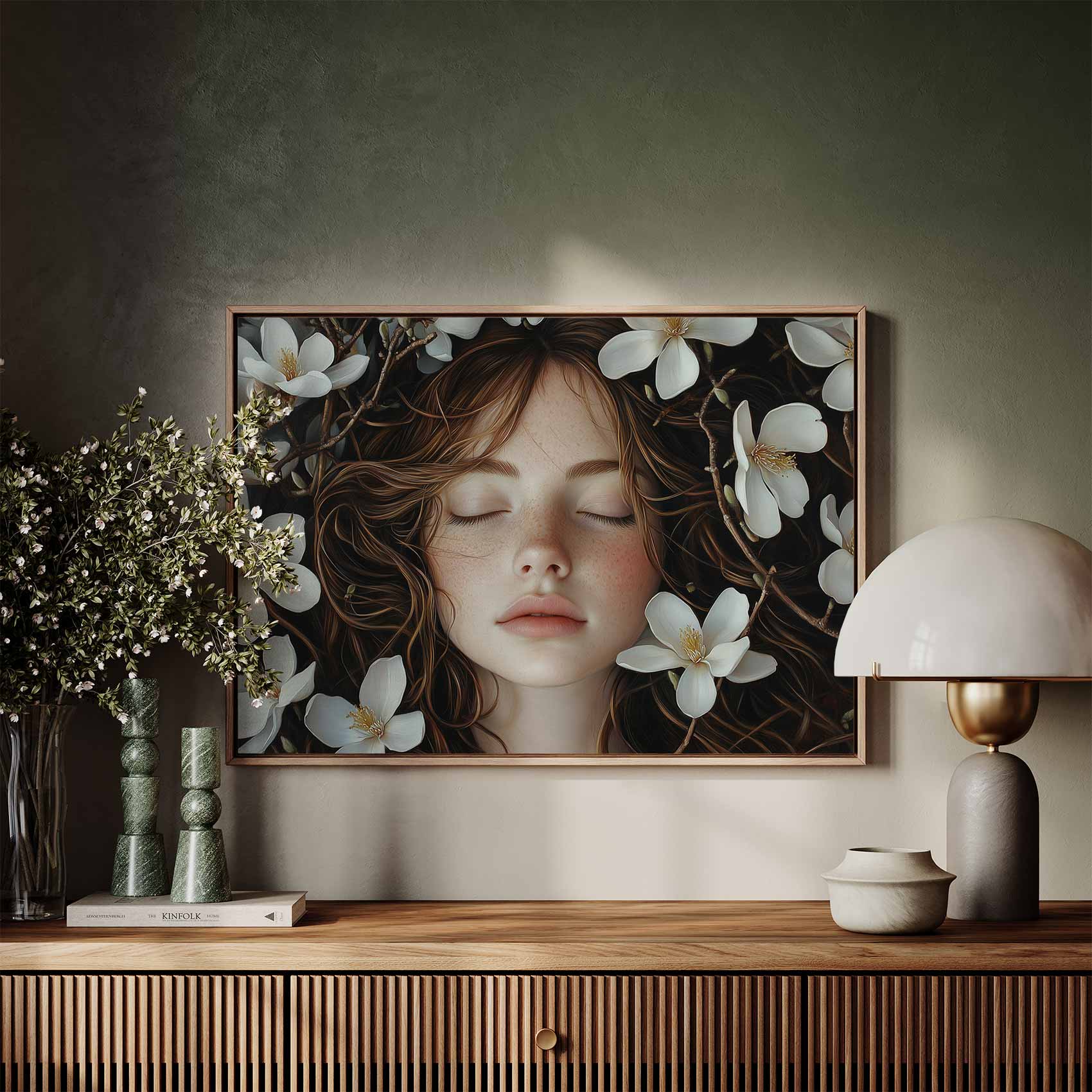 Terug naar collectie / Schilderijen / Bloemen Schilderij / Vrouw sluimert tussen witte bloemen