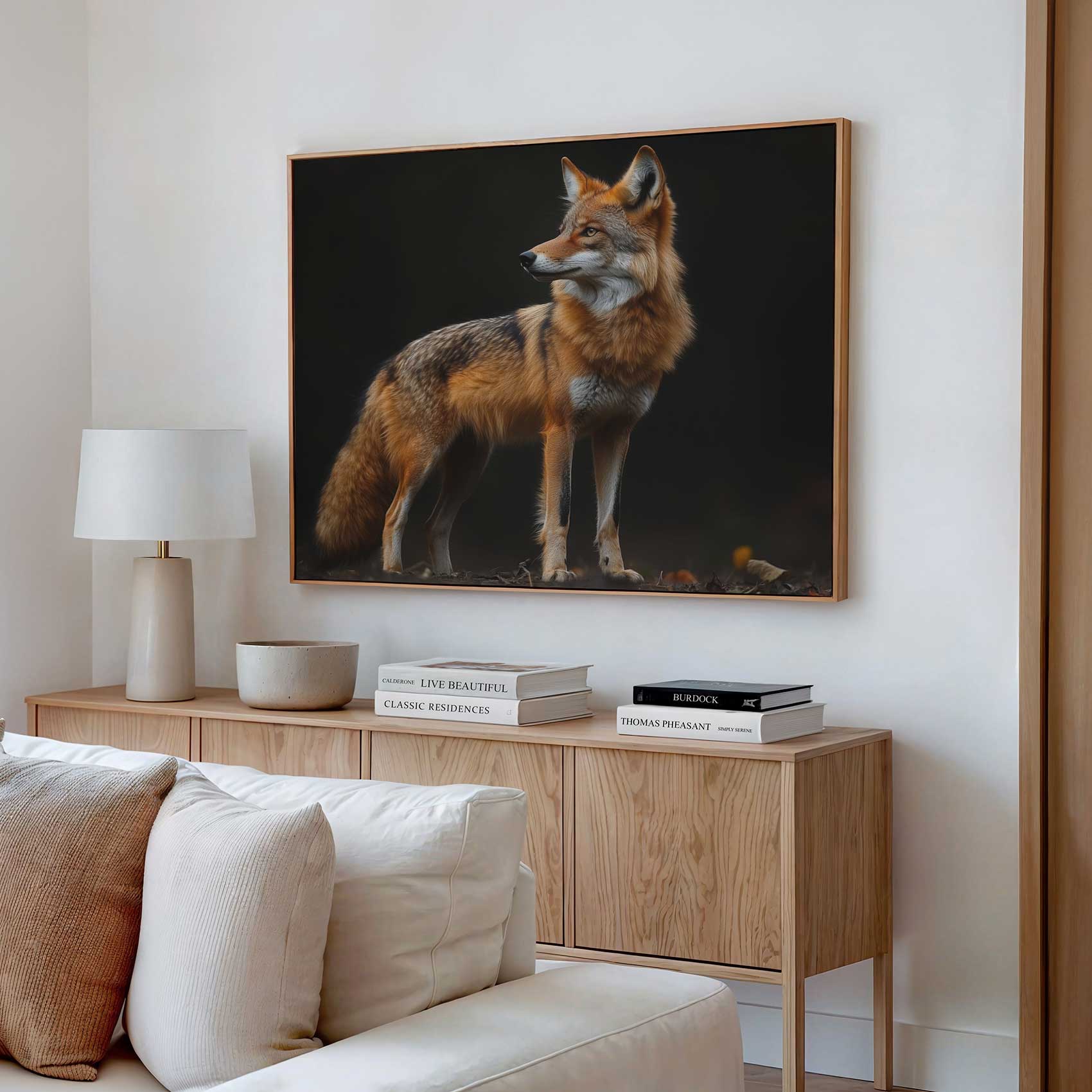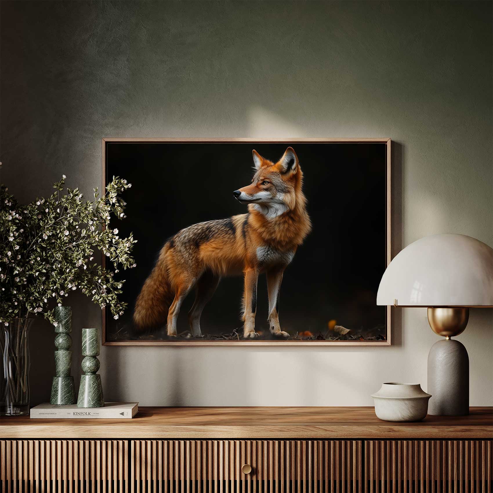 Terug naar collectie / Schilderijen / Bossen Schilderij / Waakzame vos in donker bos