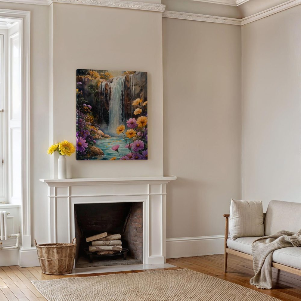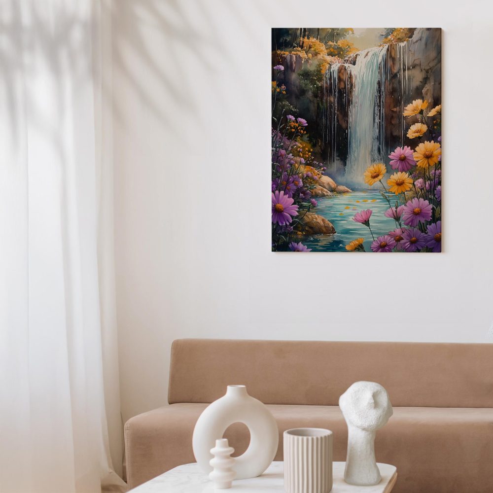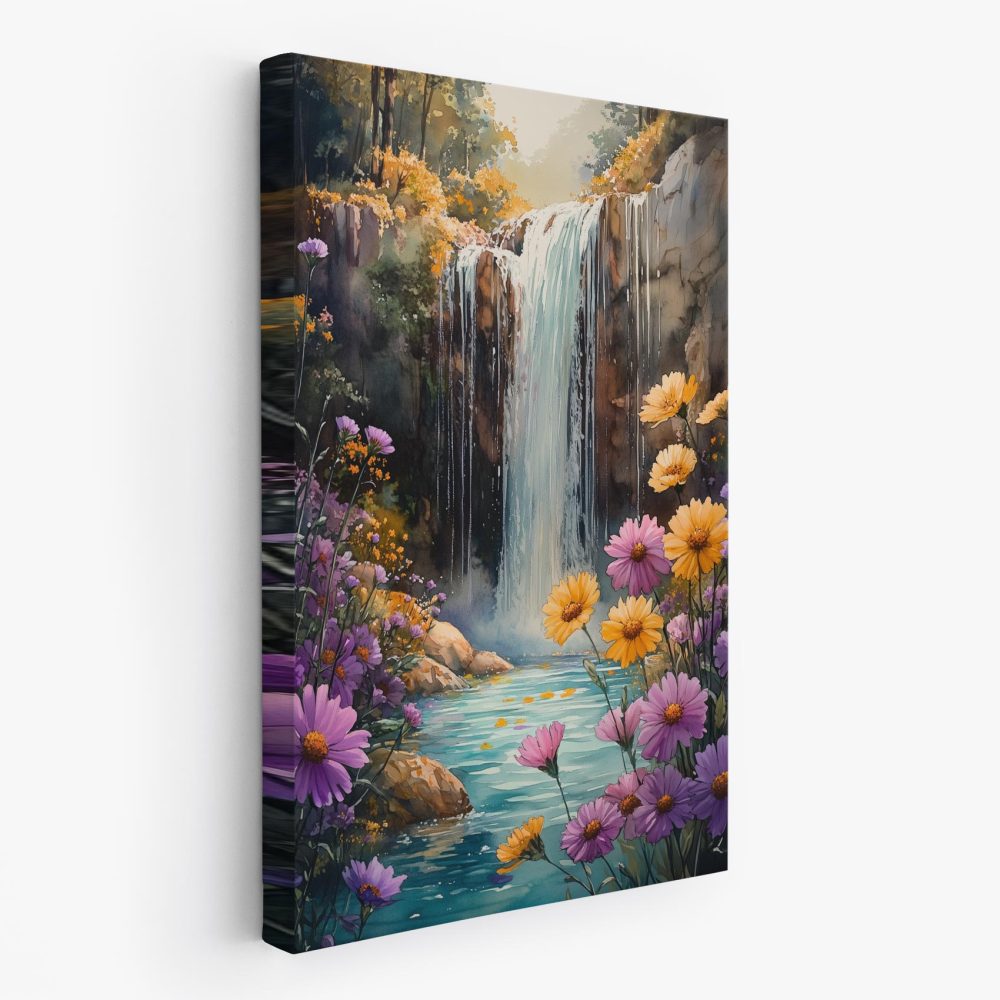 Terug naar collectie / Schilderijen / Bergen Schilderij / Watercolor waterval in bloeiende tuin