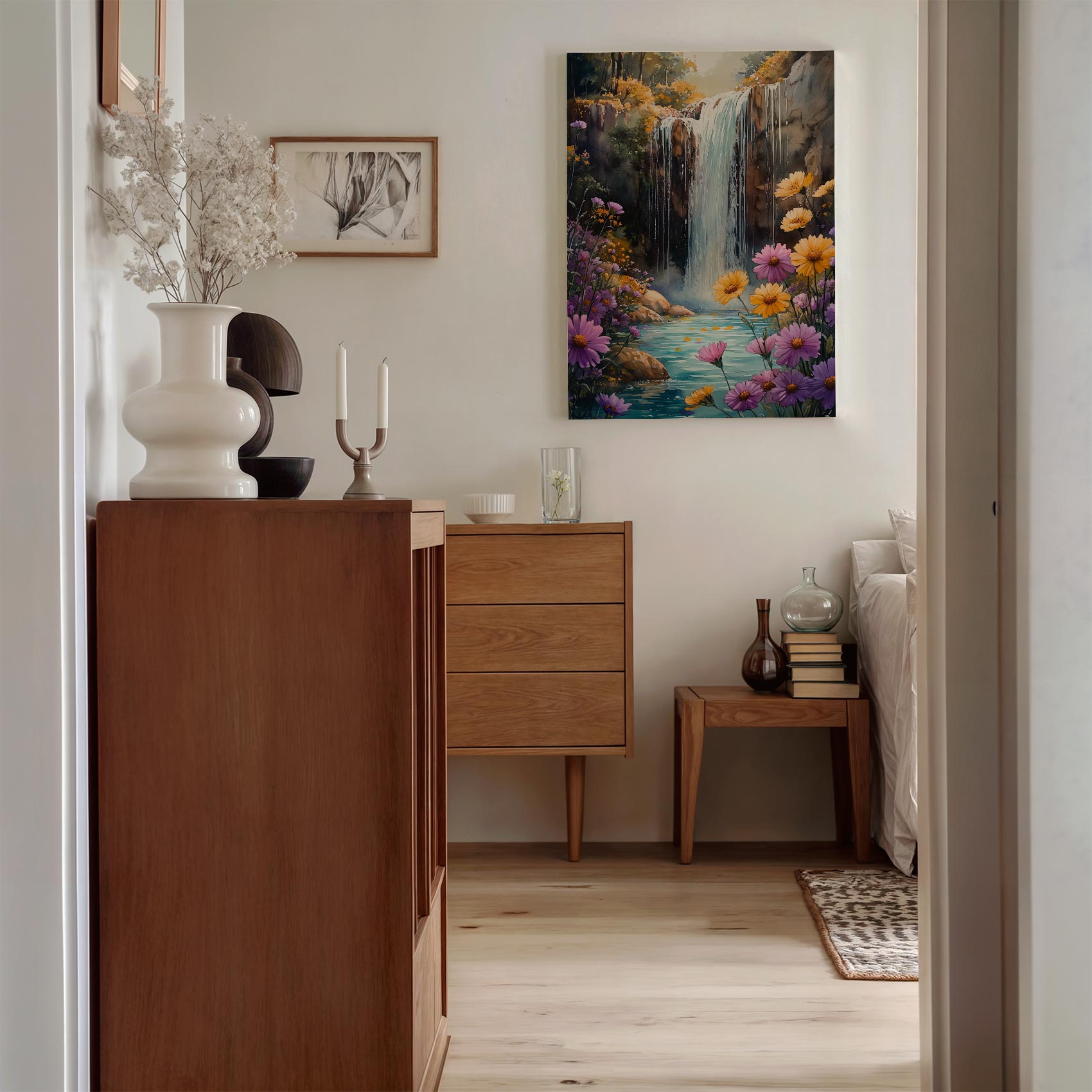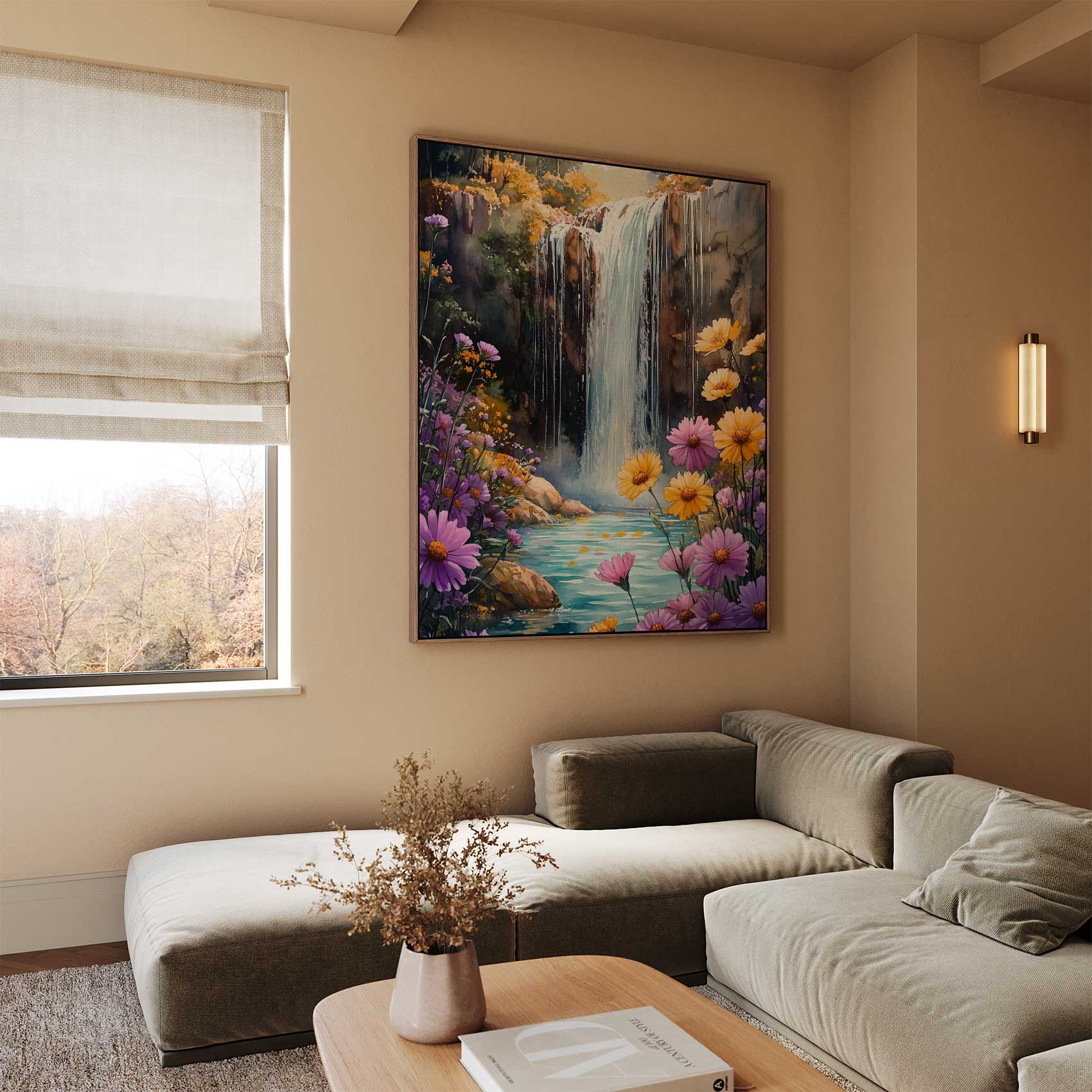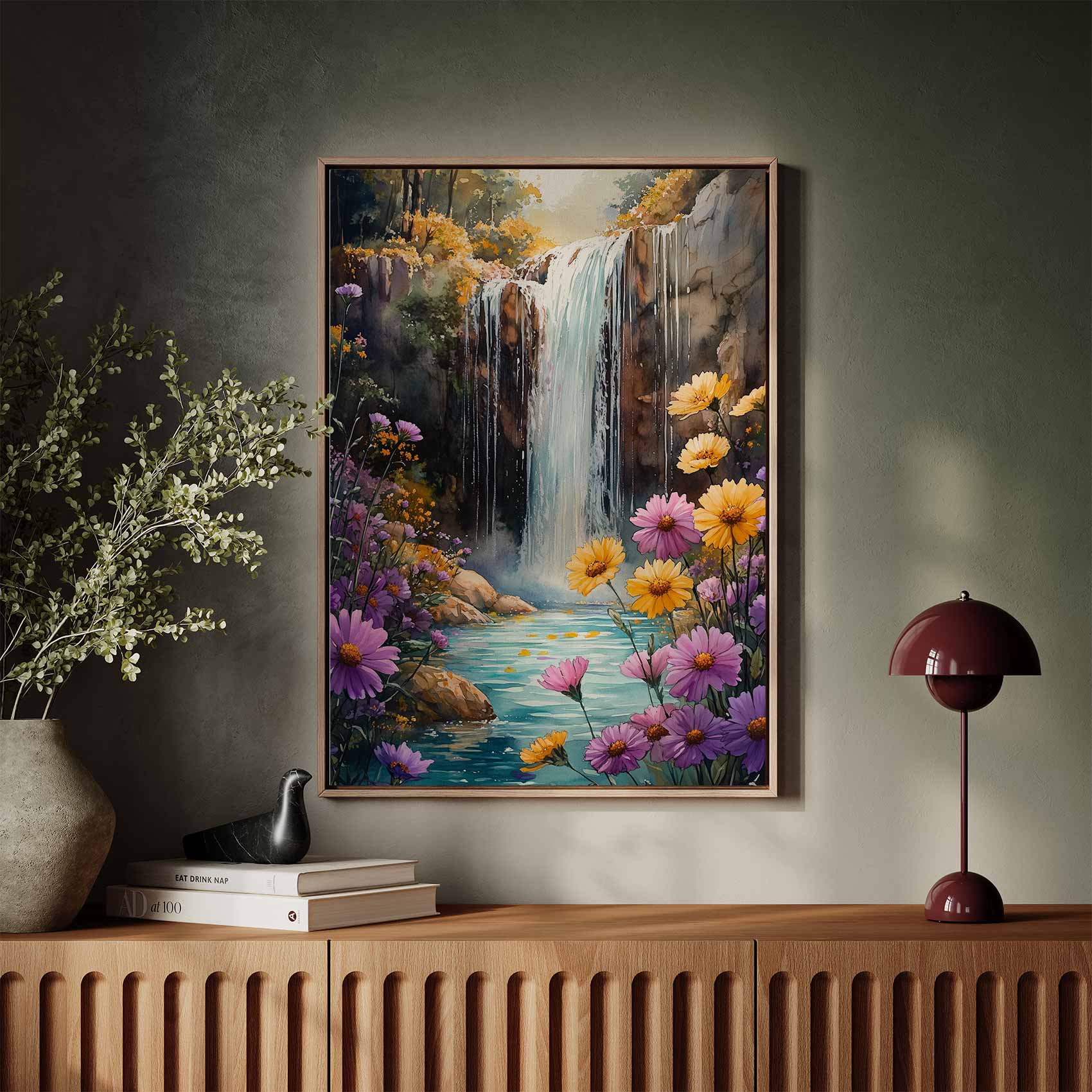Terug naar collectie / Schilderijen / Bergen Schilderij / Watercolor waterval in bloeiende tuin