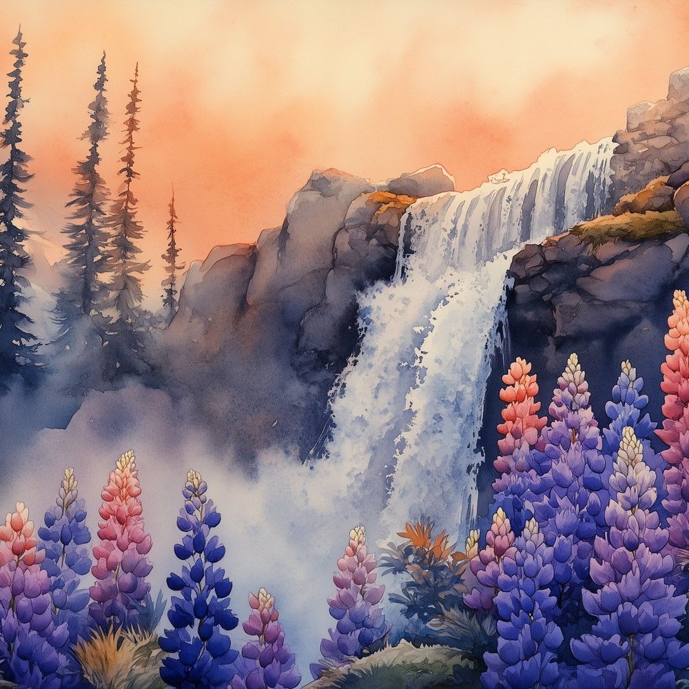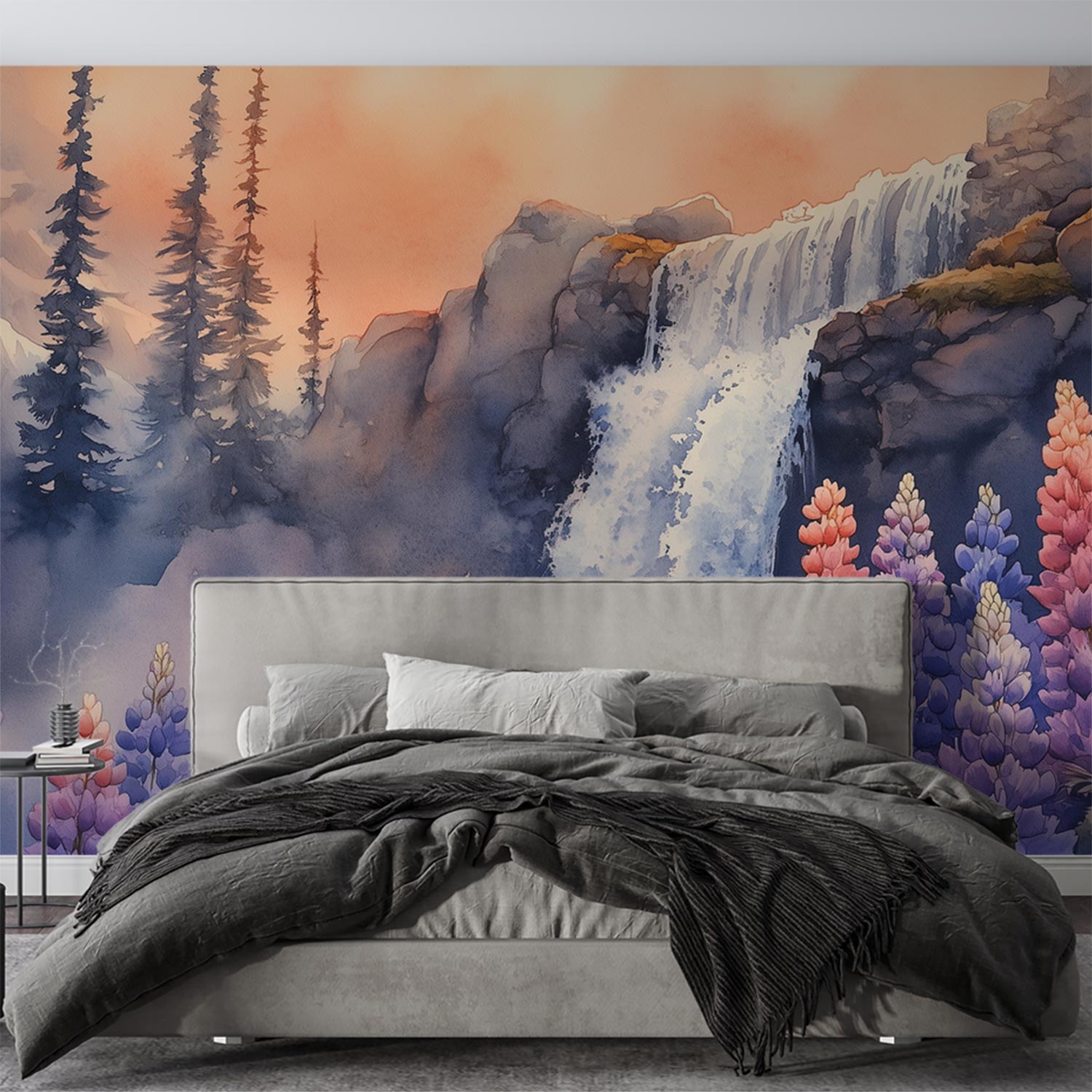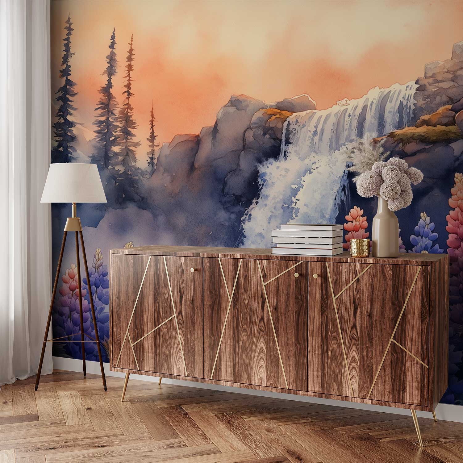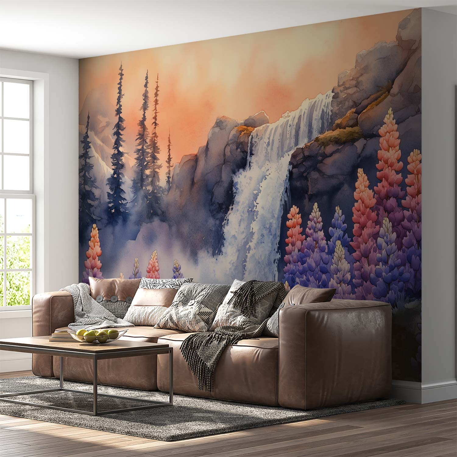 Terug naar collectie / Behang / Waterfall in bloeiende natuur behang