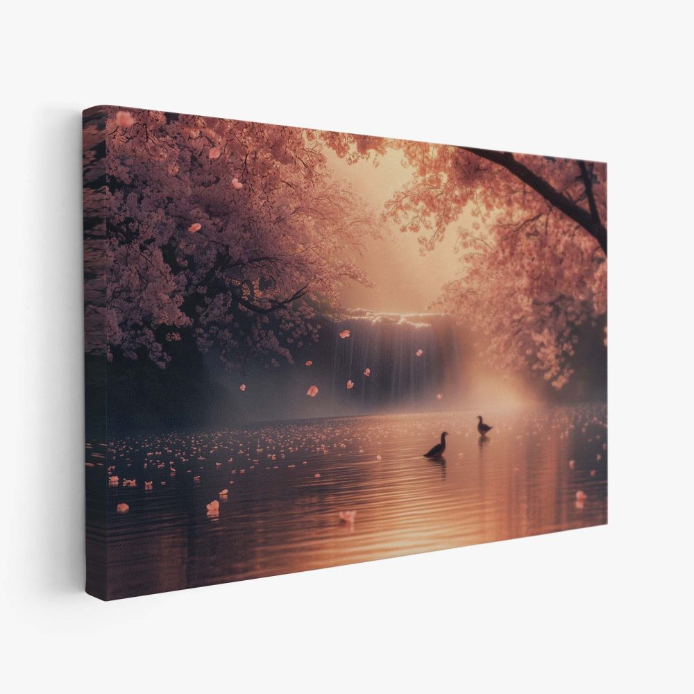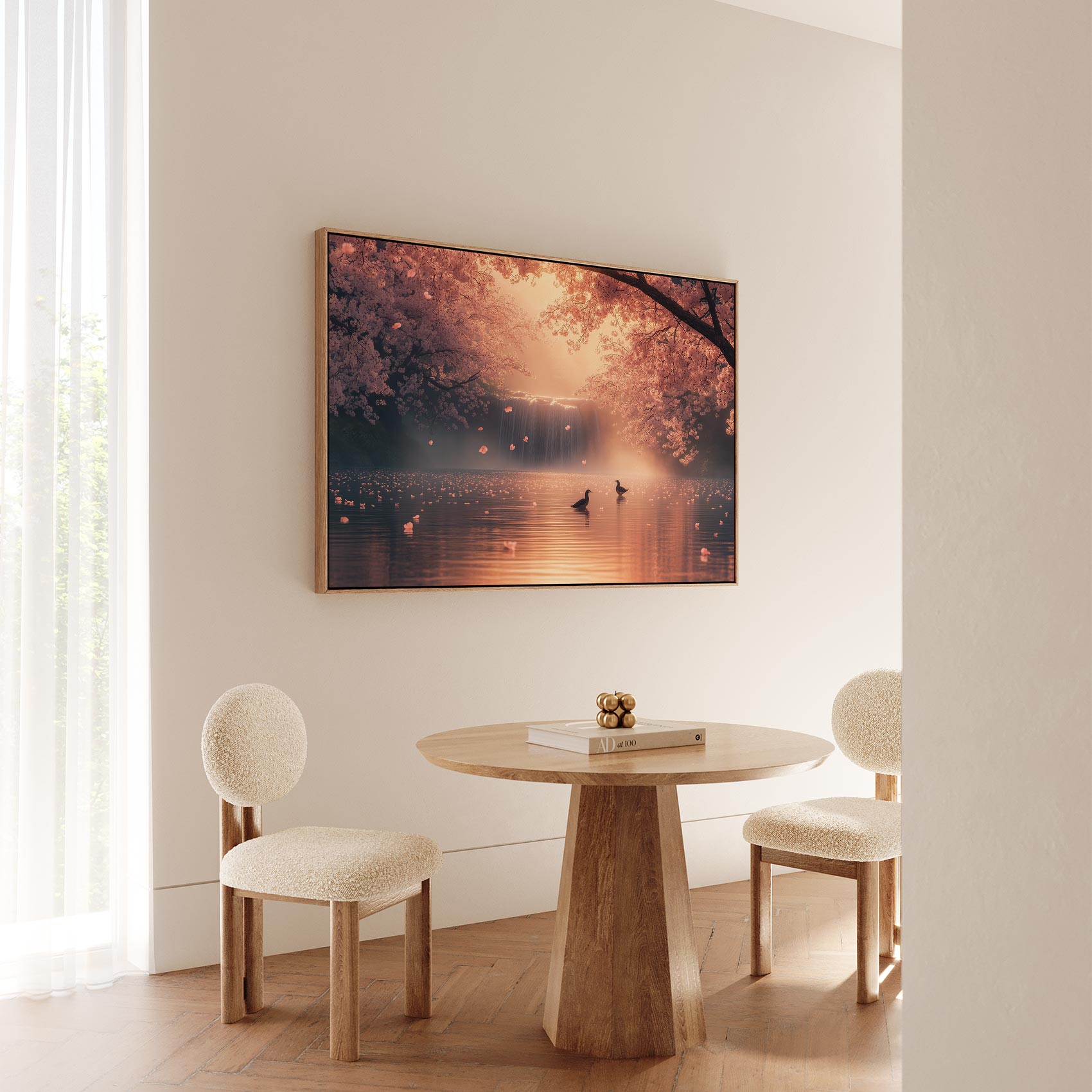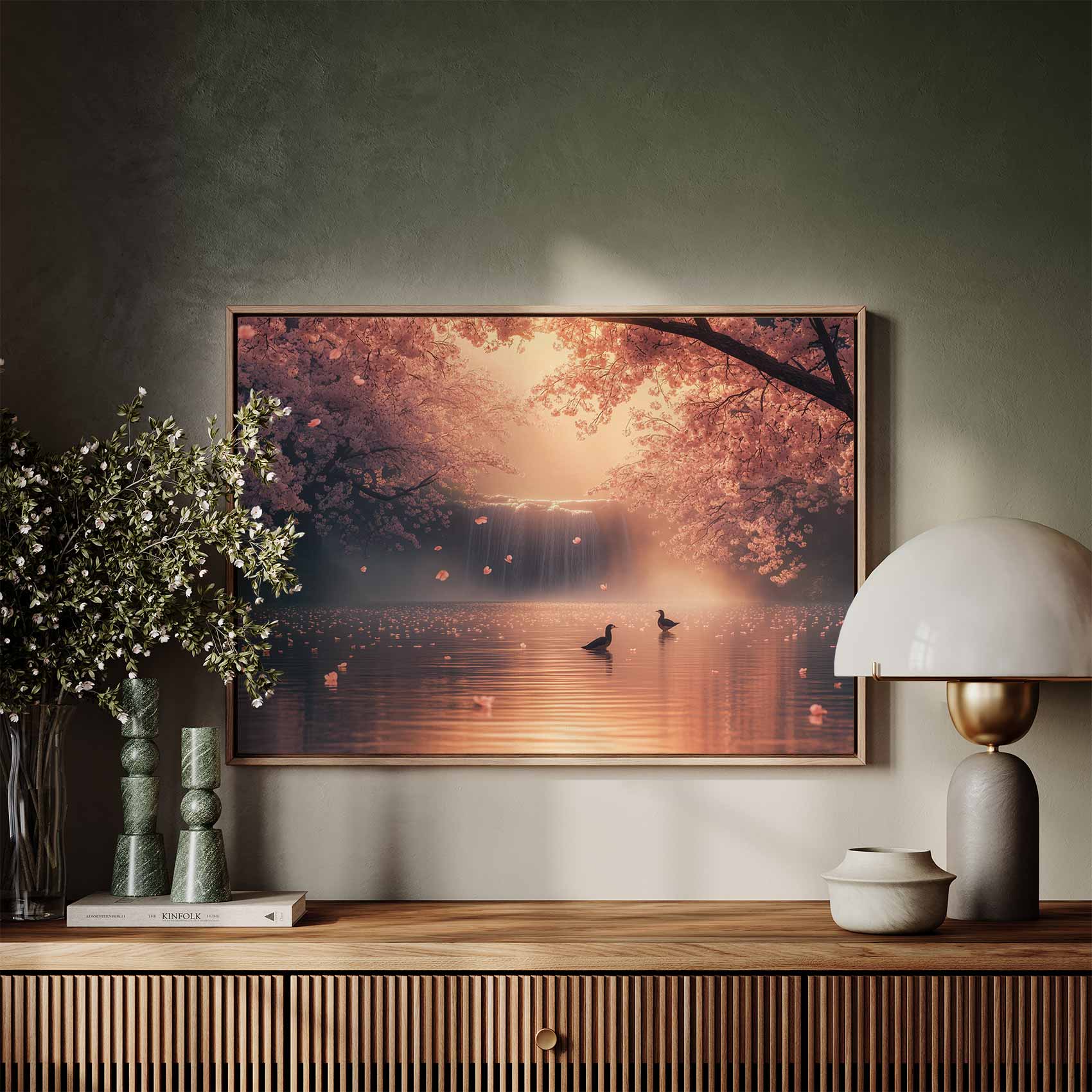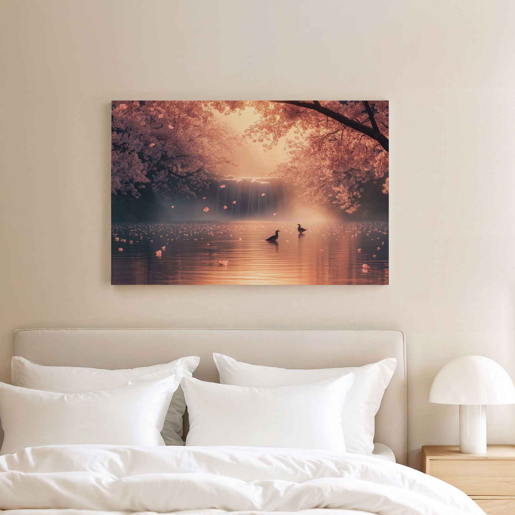Terug naar collectie / Schilderijen / Bergen Schilderij / Waterval met roze bloemenveld