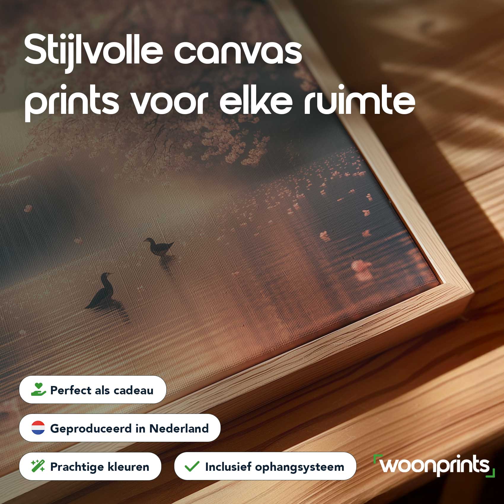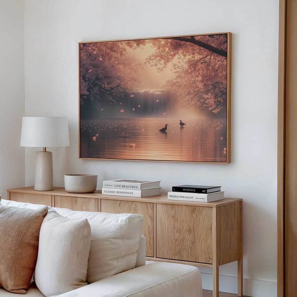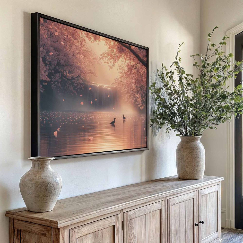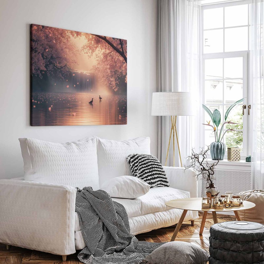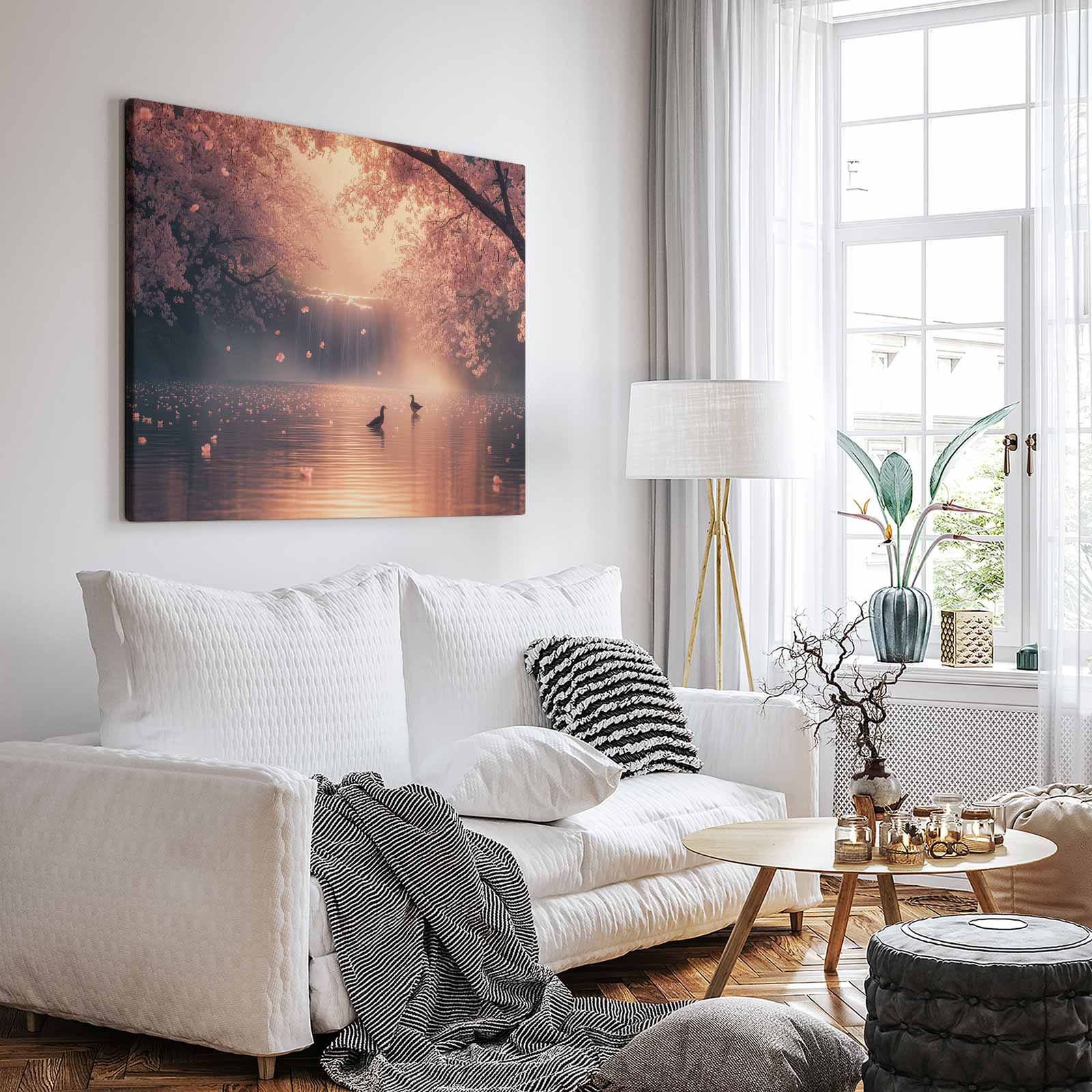 Terug naar collectie / Schilderijen / Bergen Schilderij / Waterval met roze bloemenveld