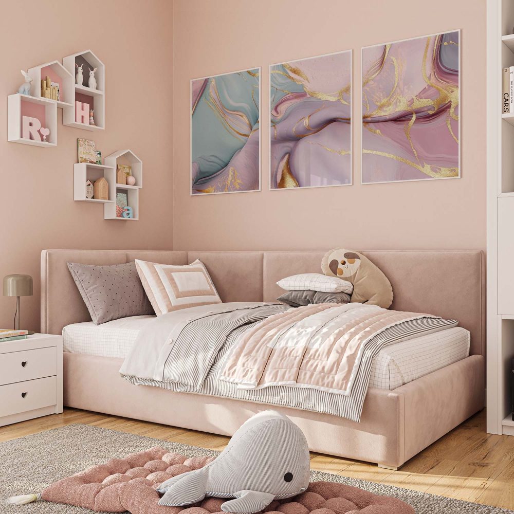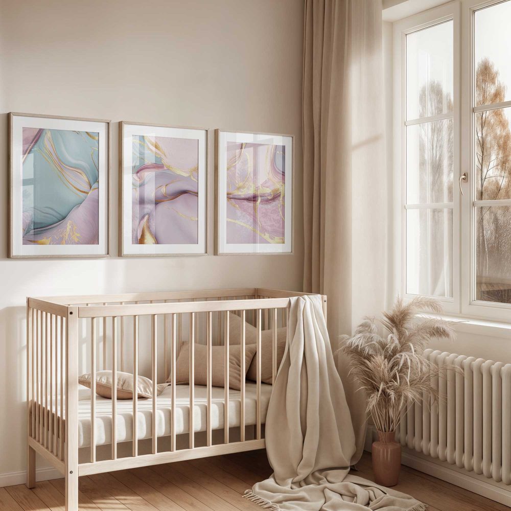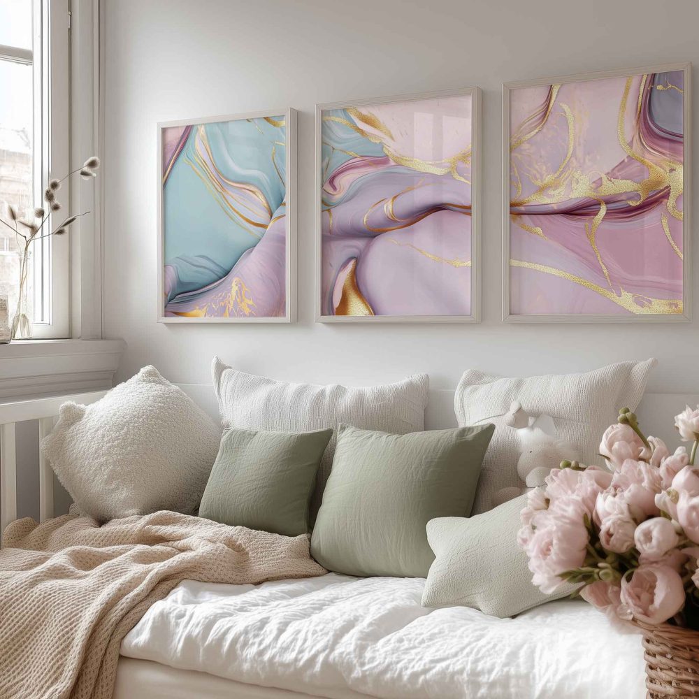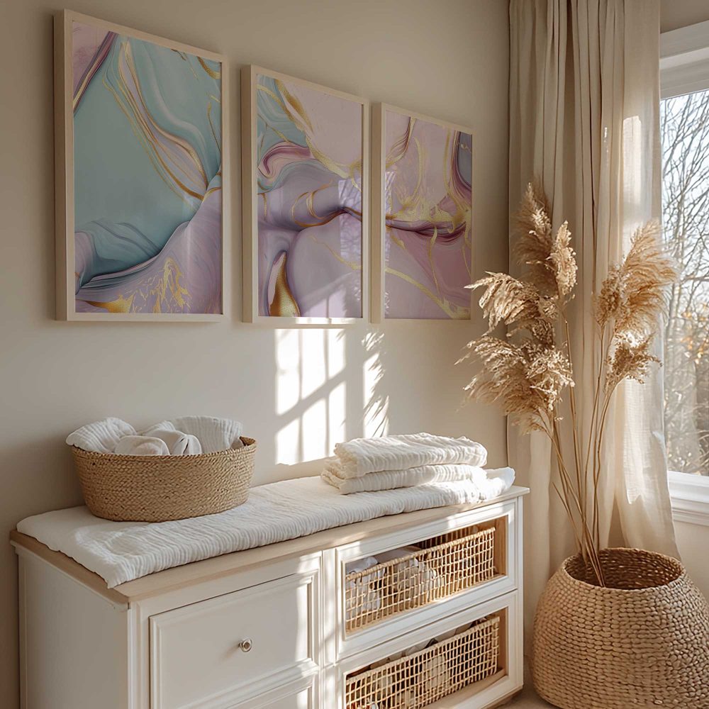 Terug naar collectie / Kinderkamer posters / Whimsical Marble Swirls in Blauw, Roze en Goud