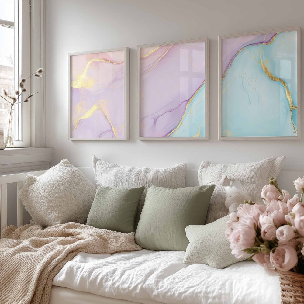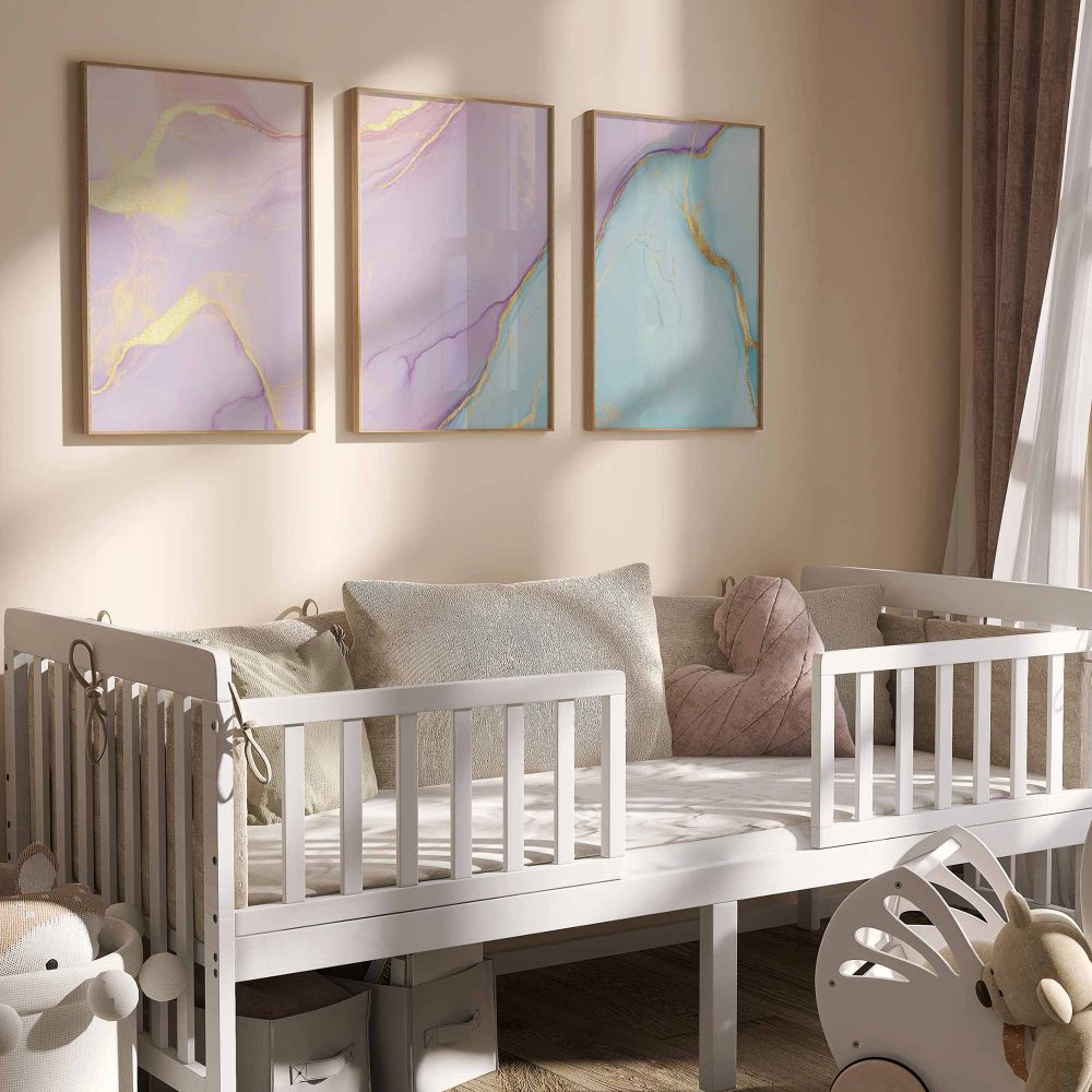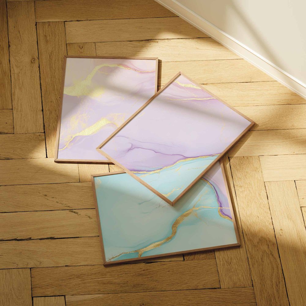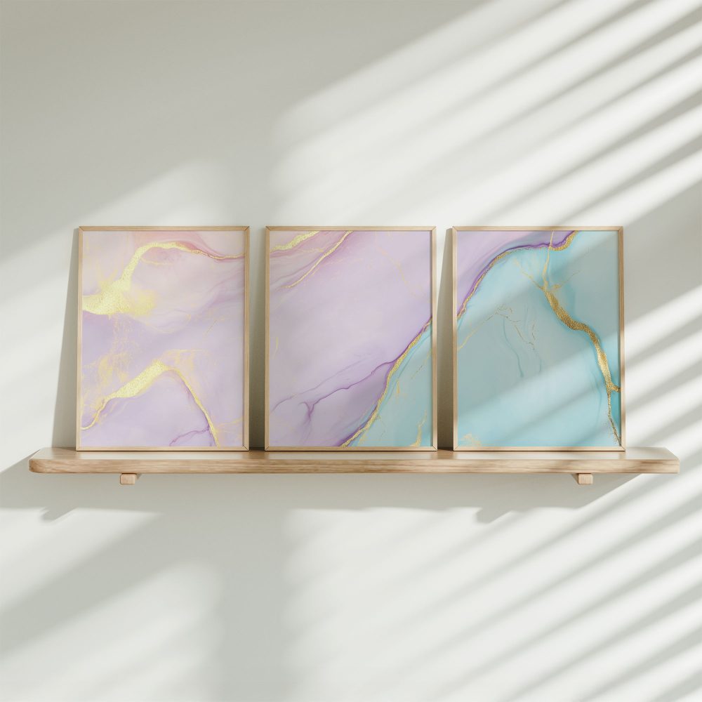 Terug naar collectie / Kinderkamer posters / Whimsical Marble Swirls in Roze, Blauw en Goud
