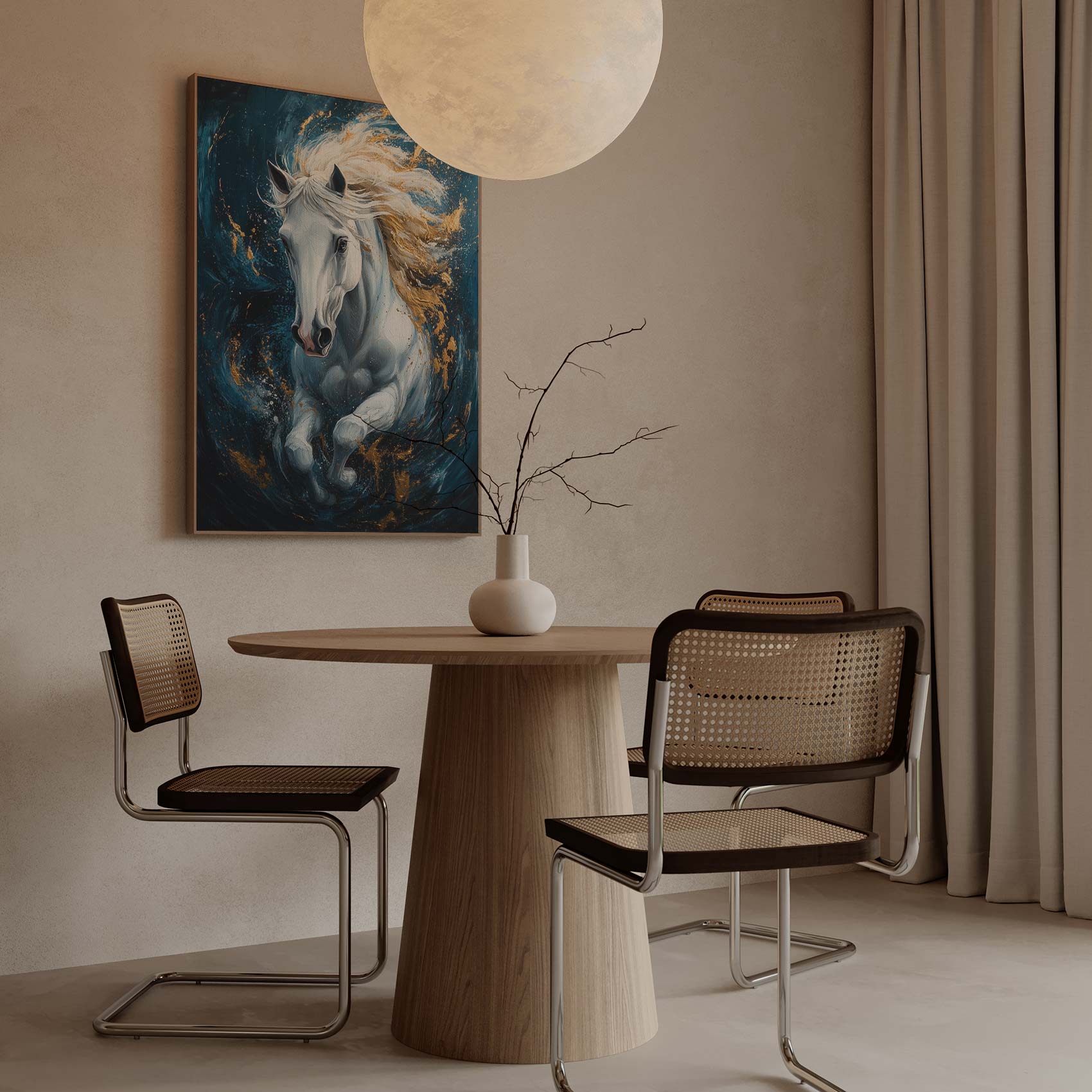Terug naar collectie / Schilderijen / Abstract Schilderij / Wit paard in gouden galop
