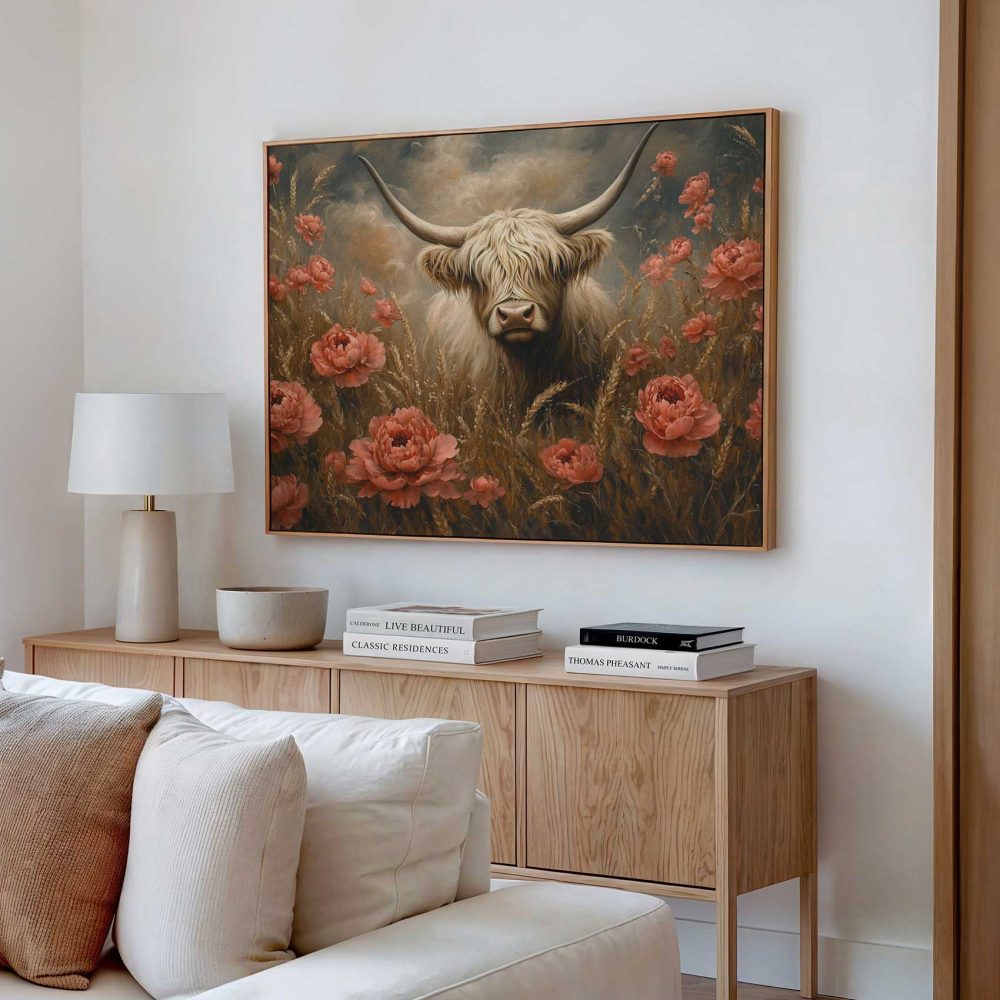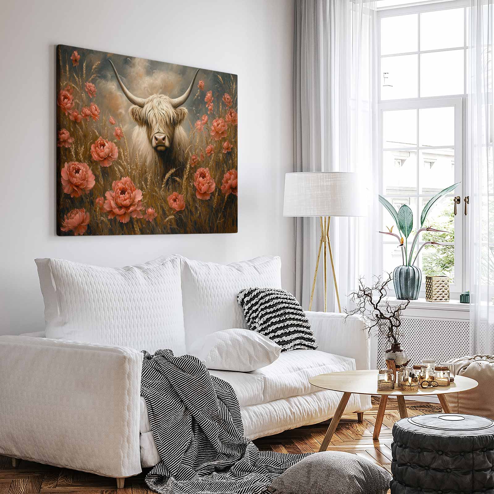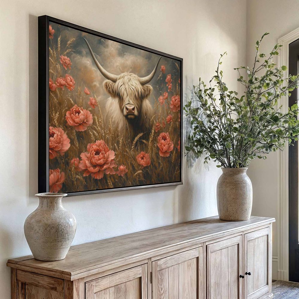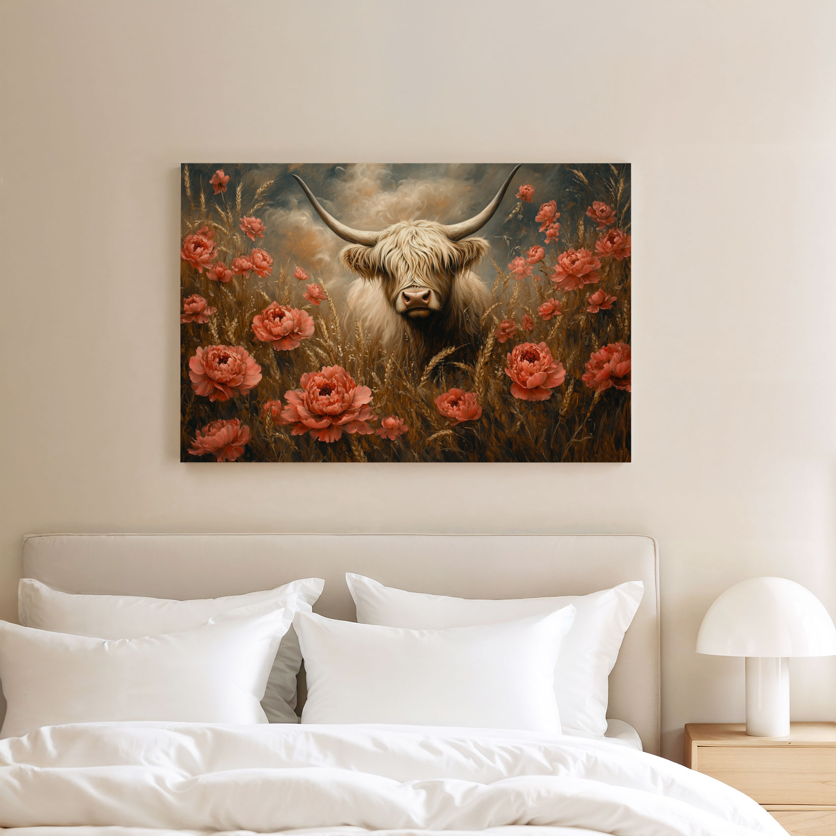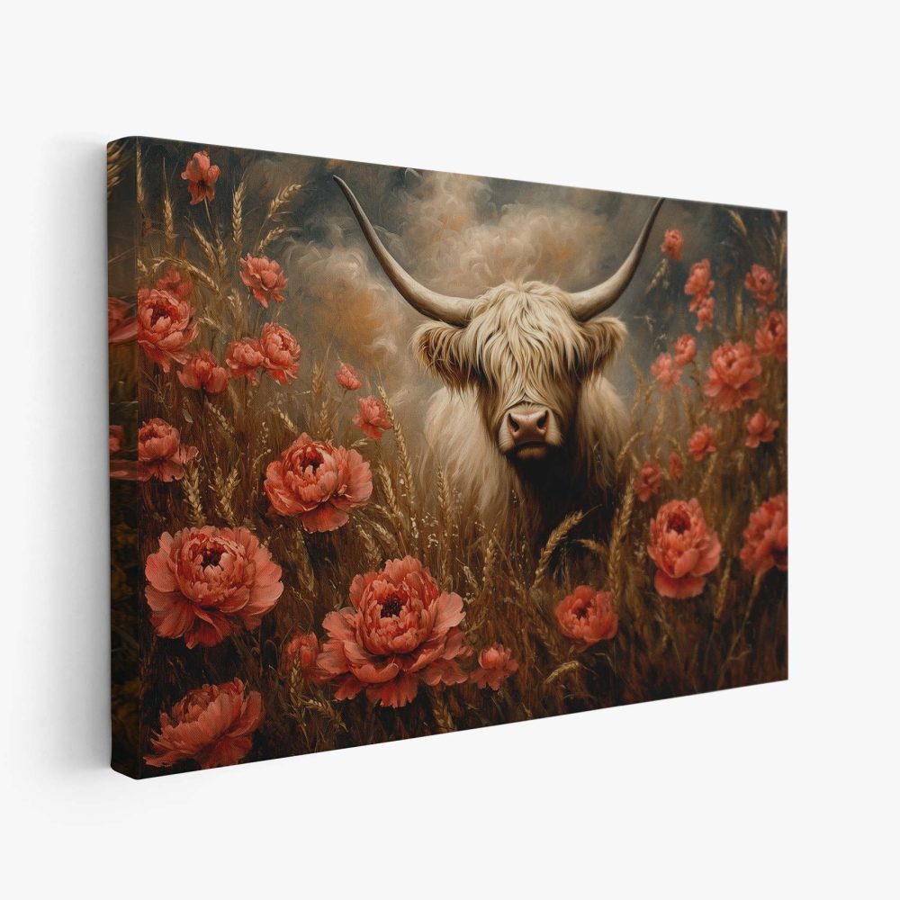 Terug naar collectie / Schilderijen / Bloemen Schilderij / Witte koe tussen rode bloemen