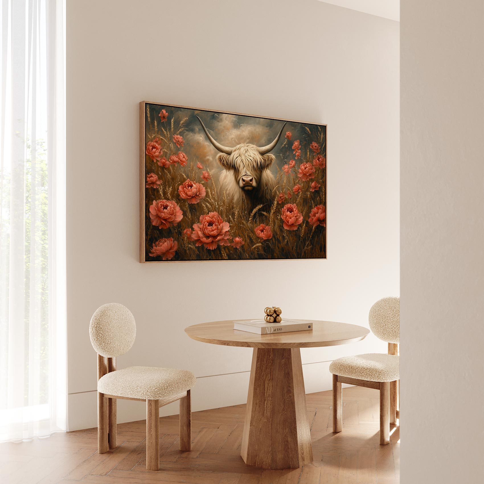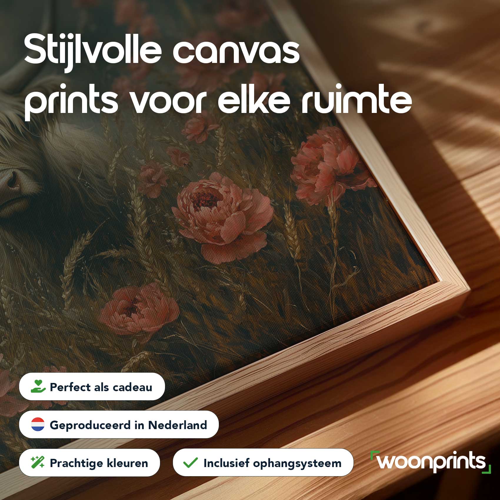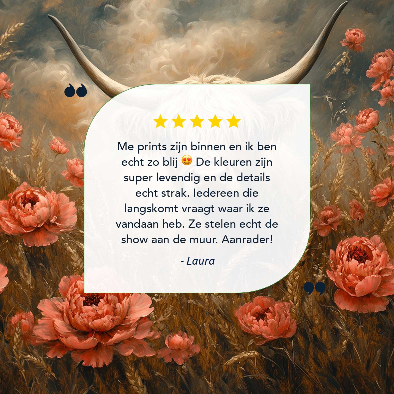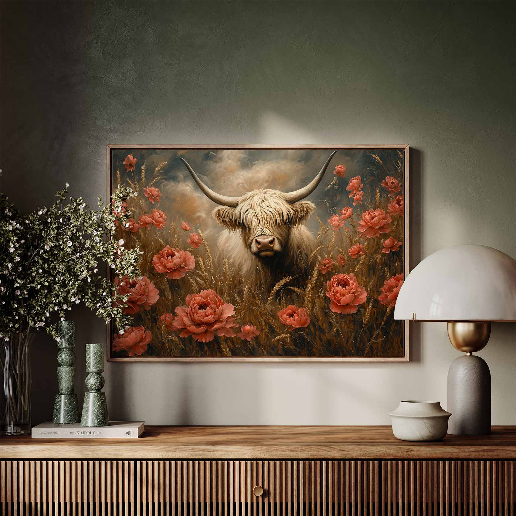 Terug naar collectie / Schilderijen / Bloemen Schilderij / Witte koe tussen rode bloemen