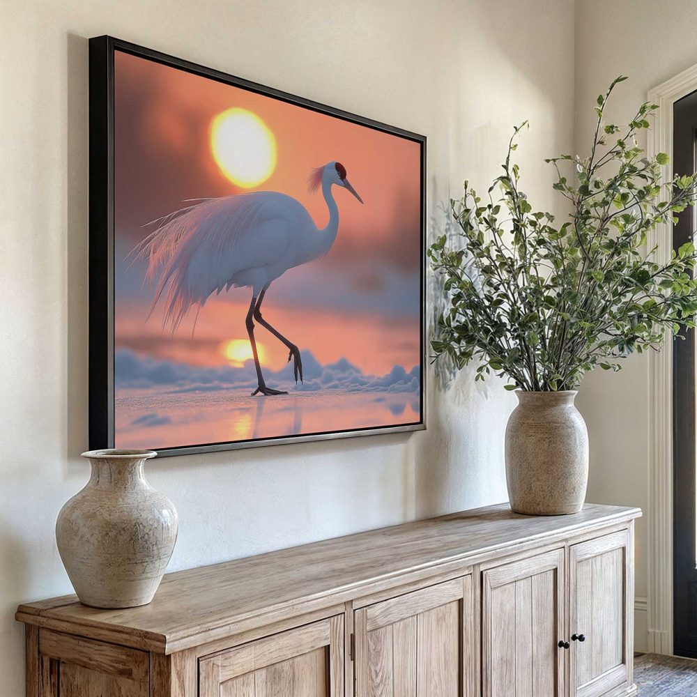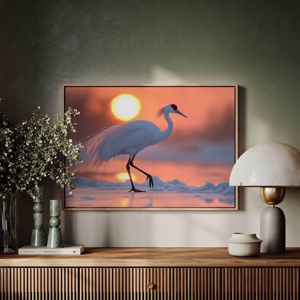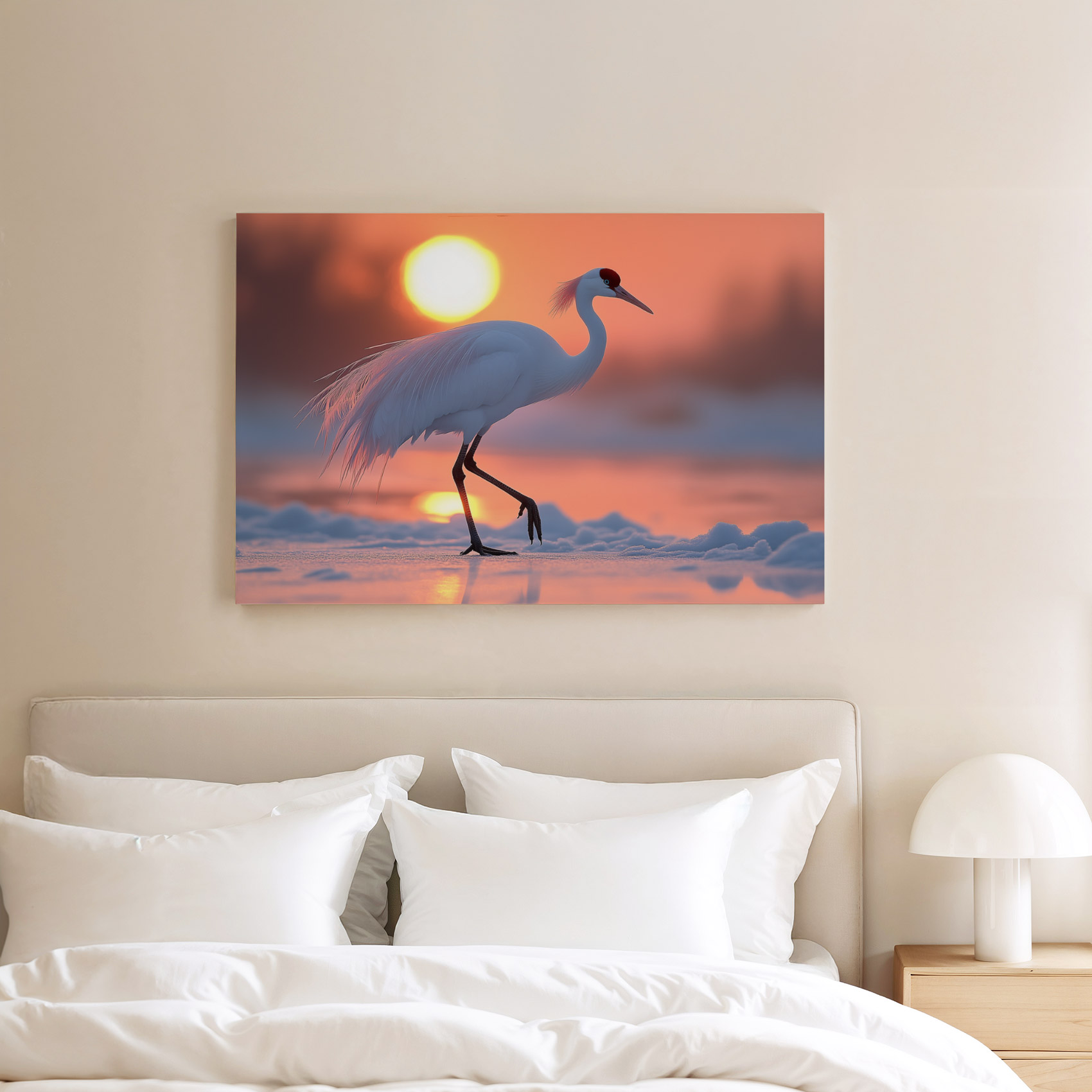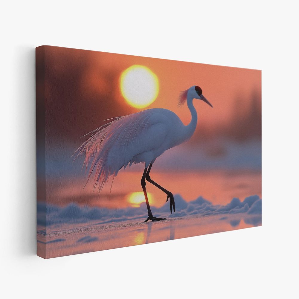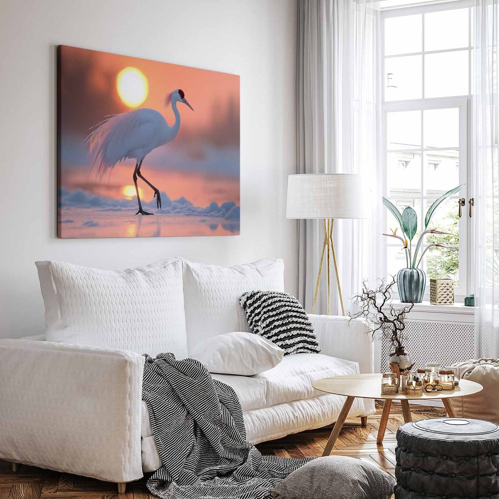 Terug naar collectie / Schilderijen / Dieren Schilderij / Witte kraanvogel bij zonsondergang