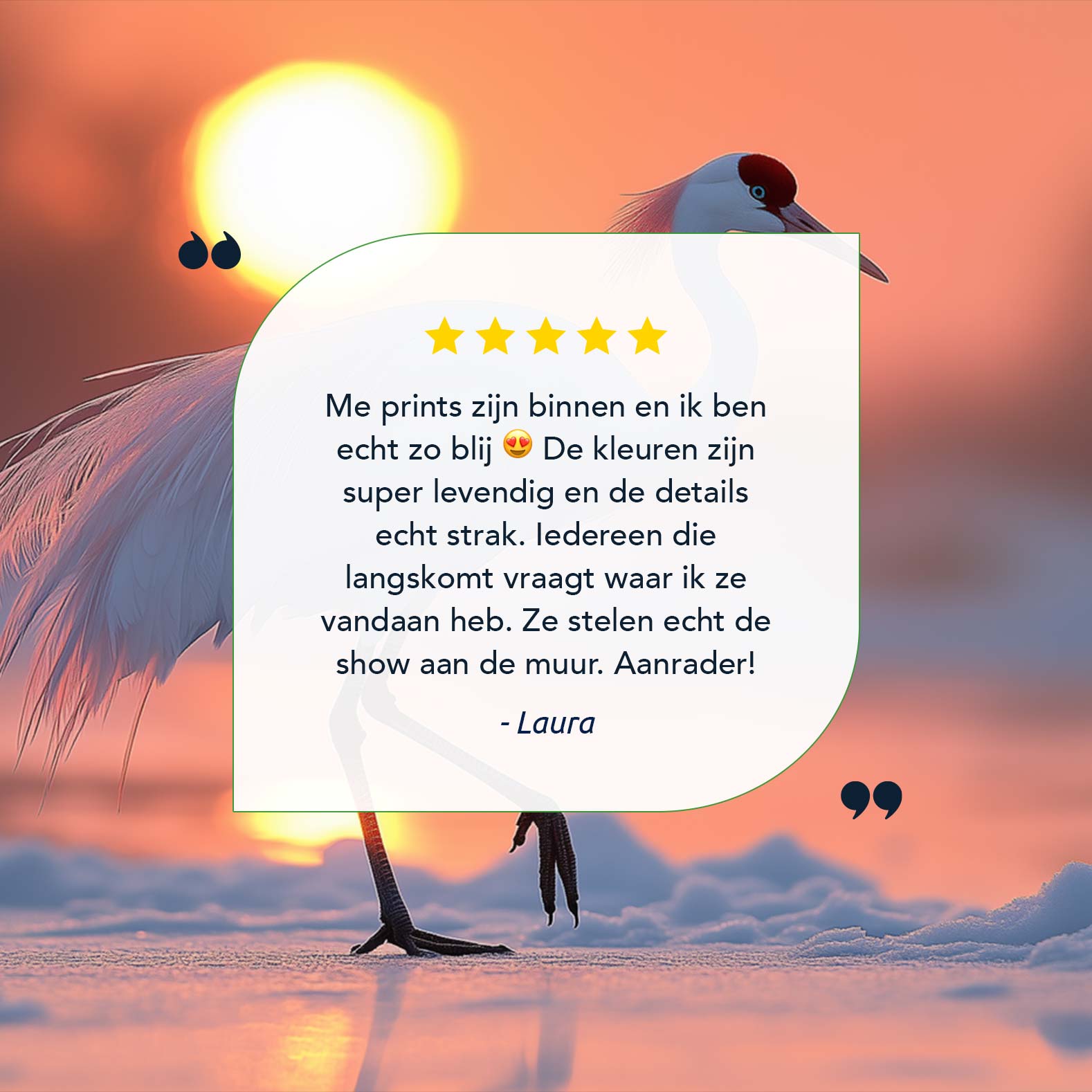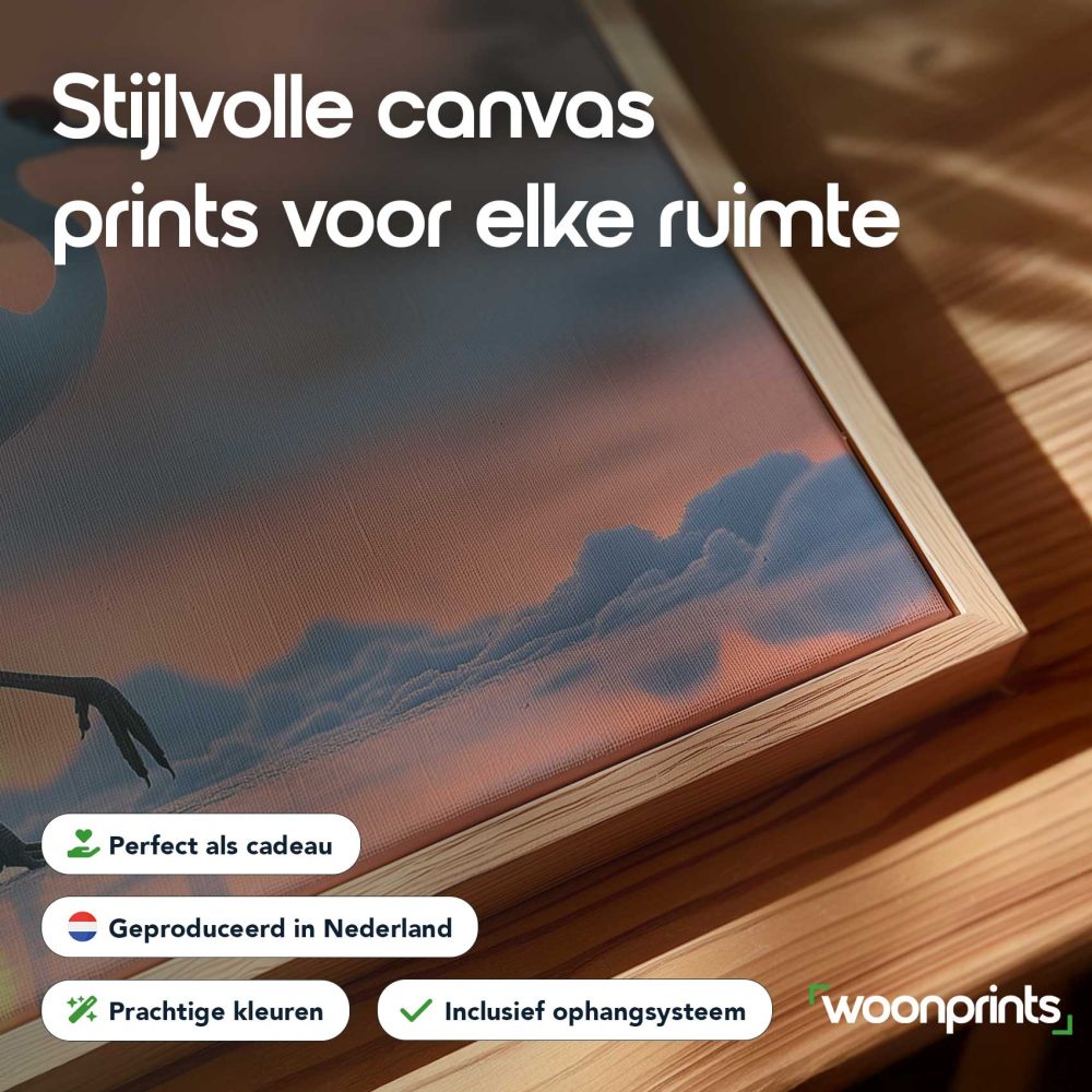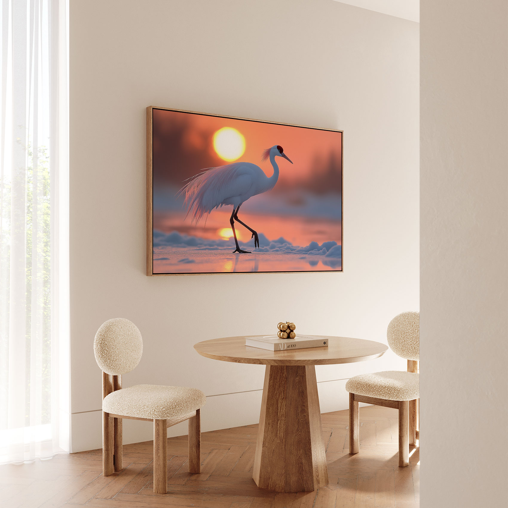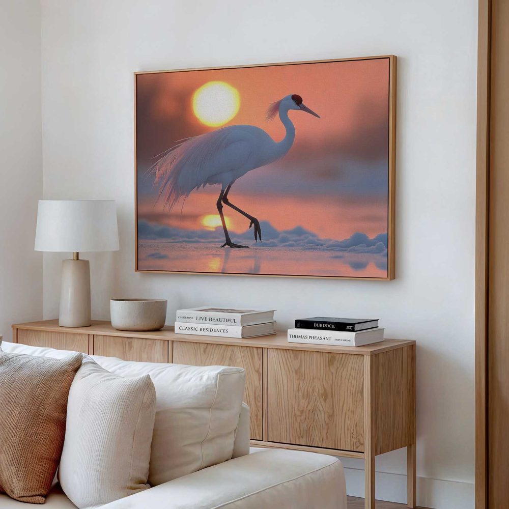 Terug naar collectie / Schilderijen / Dieren Schilderij / Witte kraanvogel bij zonsondergang