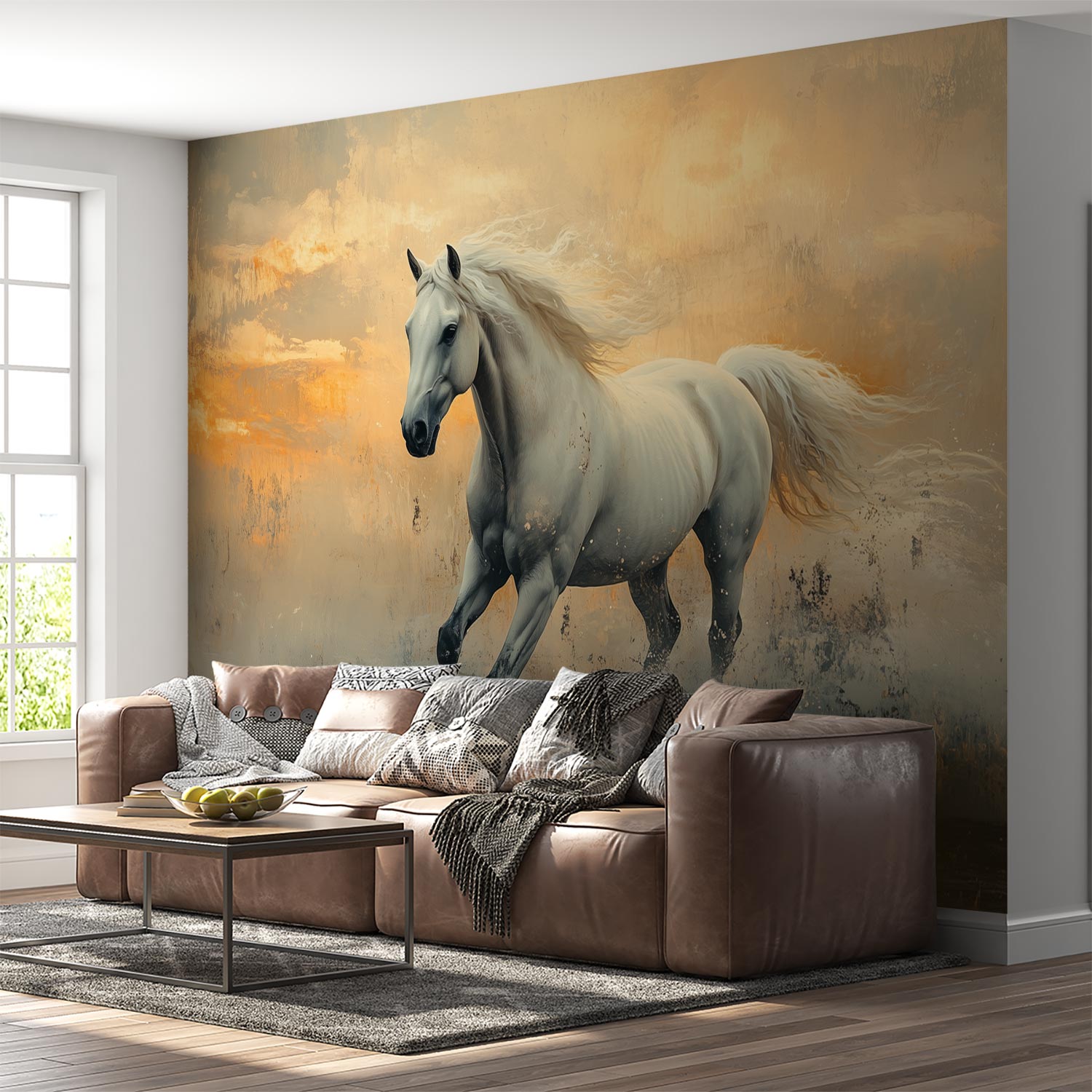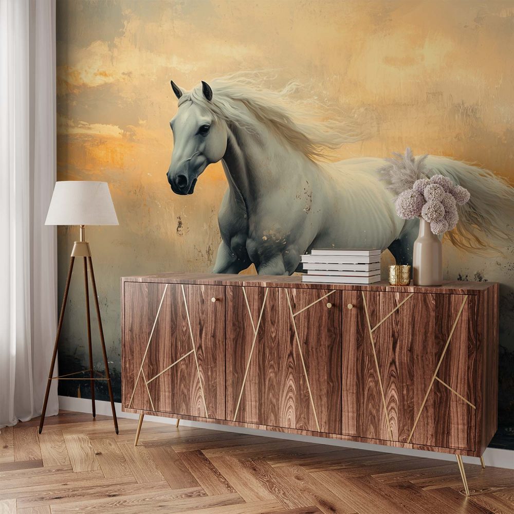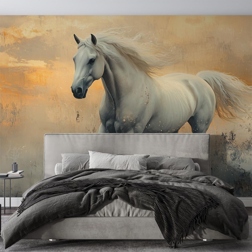 Witte paard in oranje veld behang