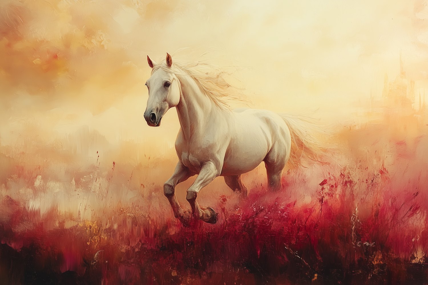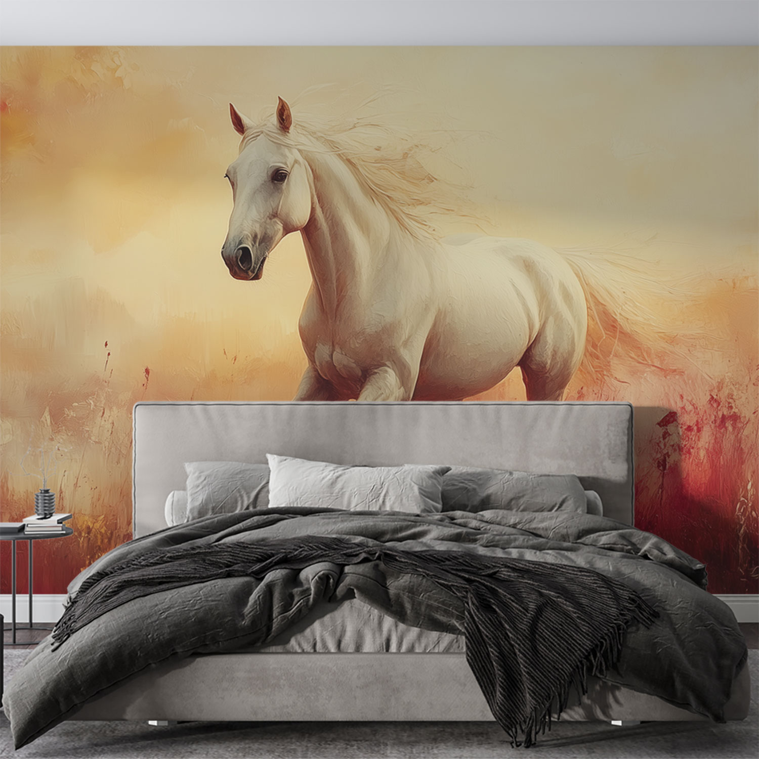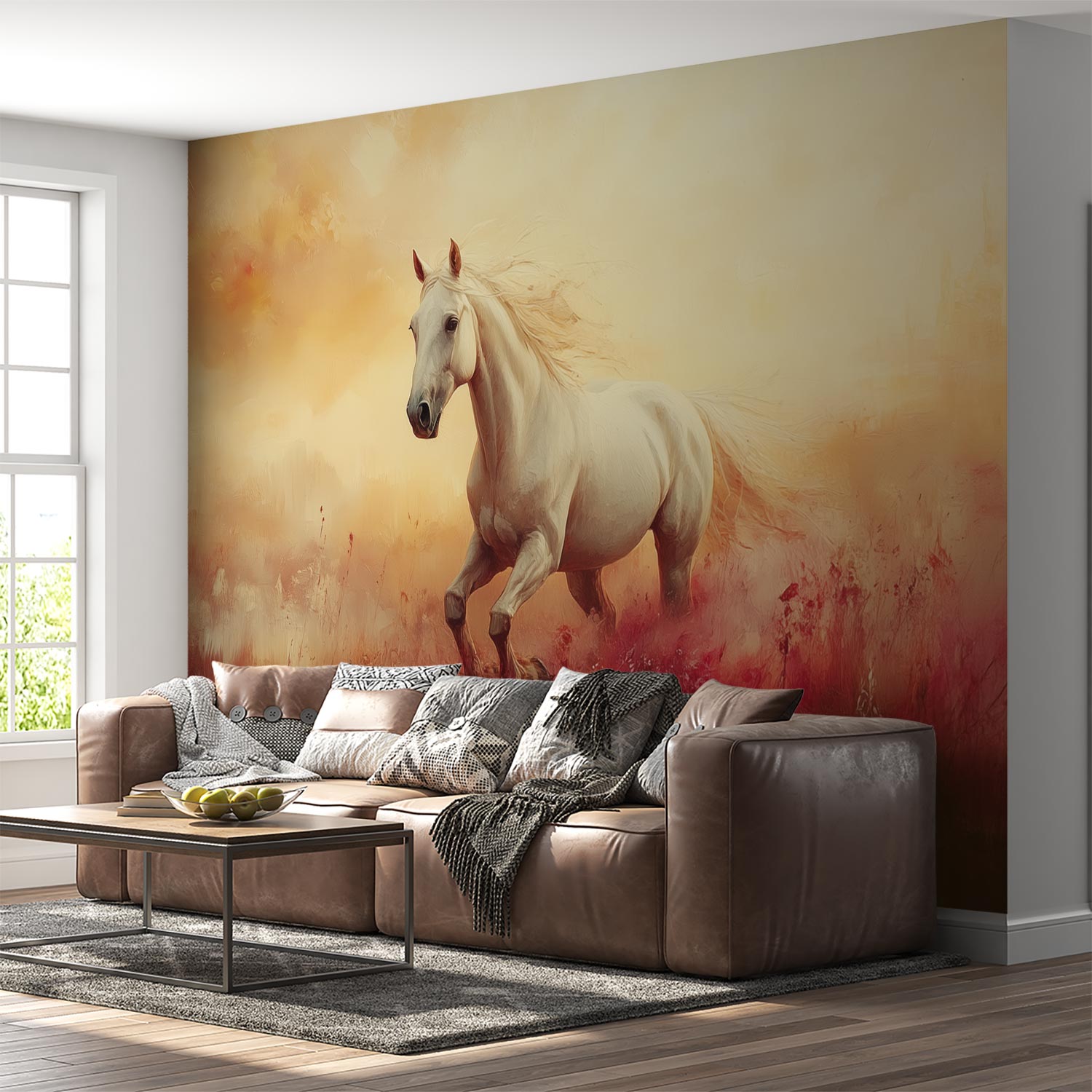 Terug naar collectie / Behang / Witte paard in rode bloemen behang