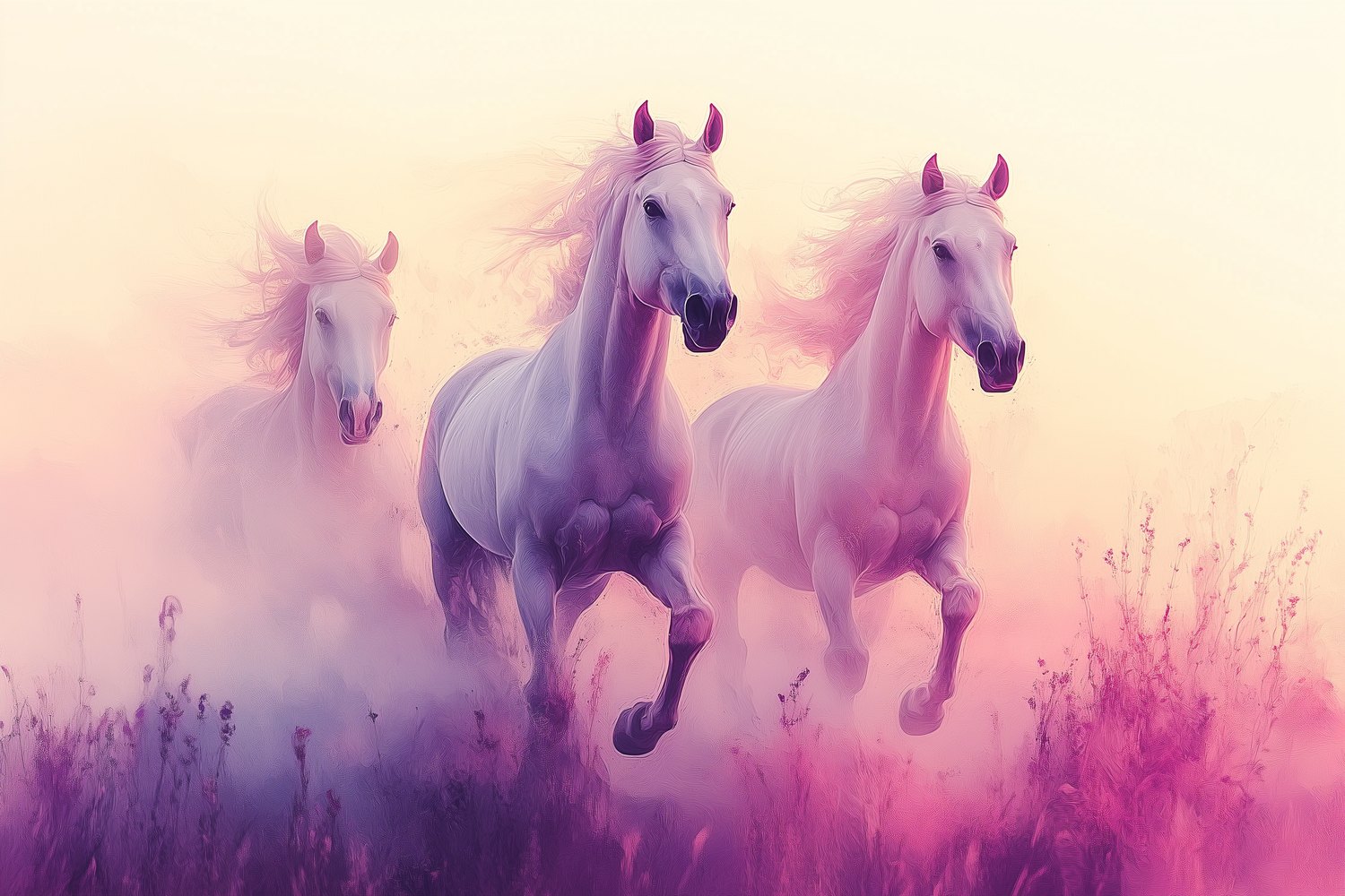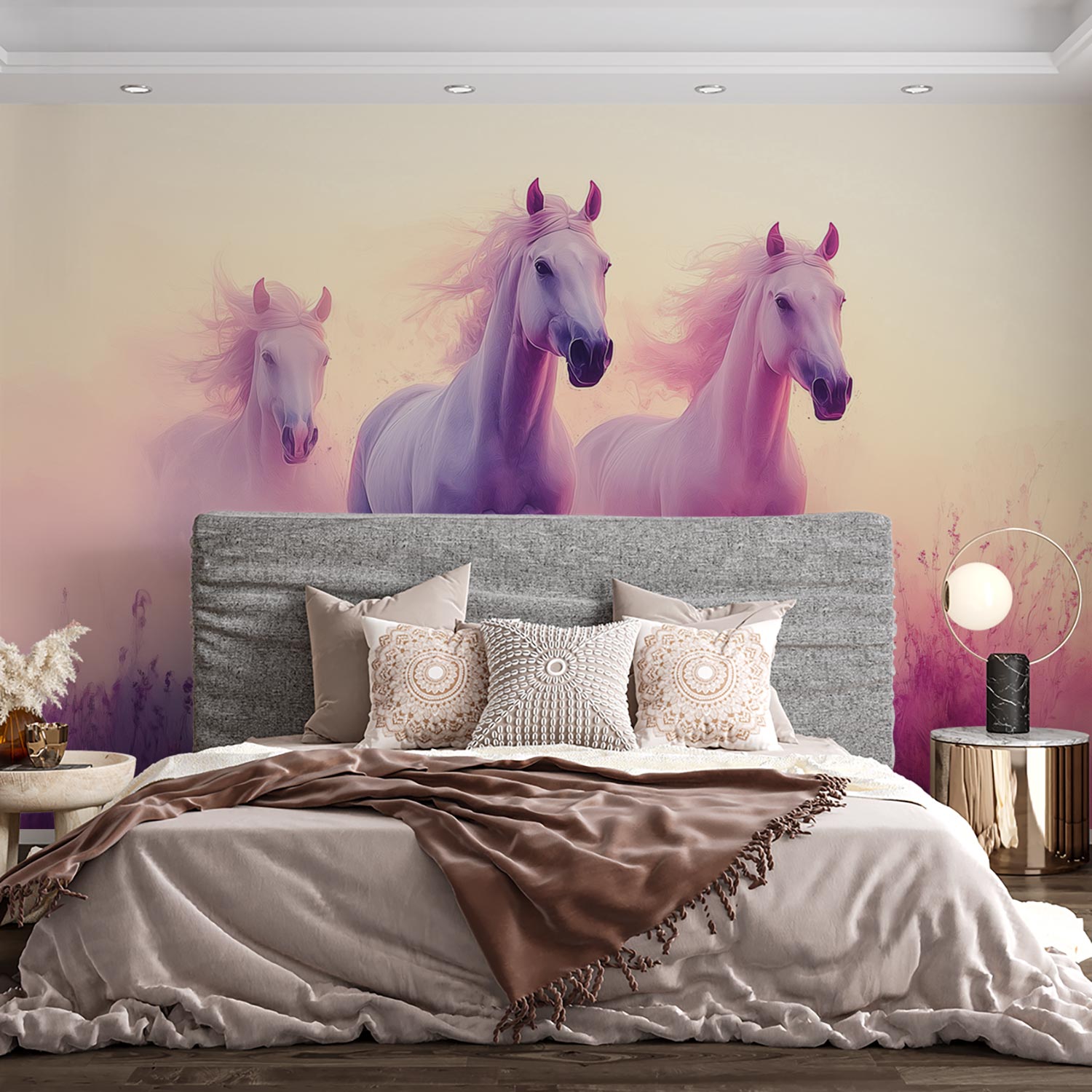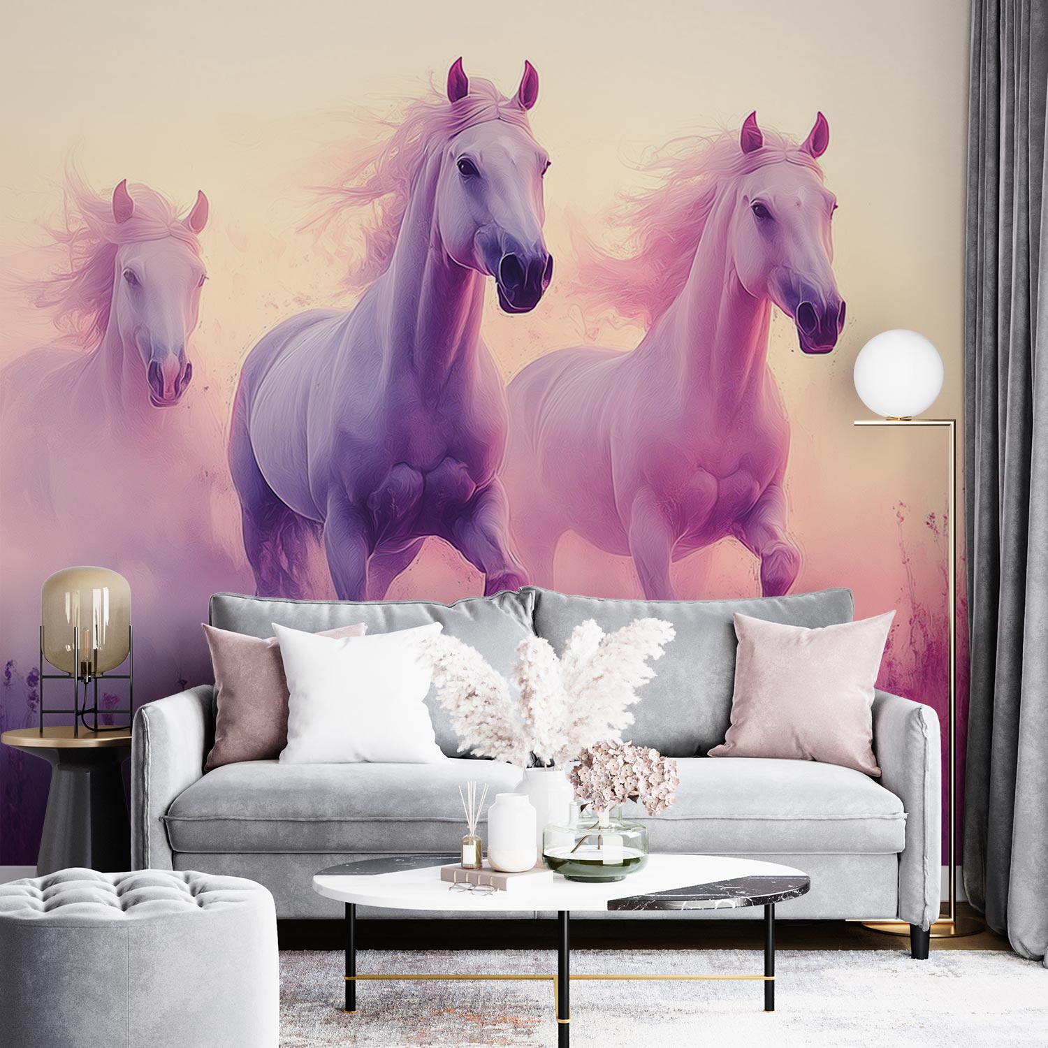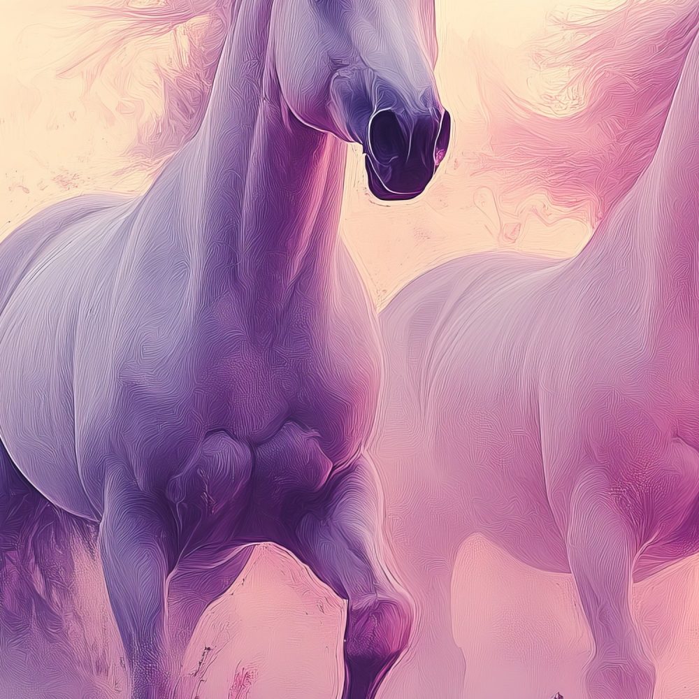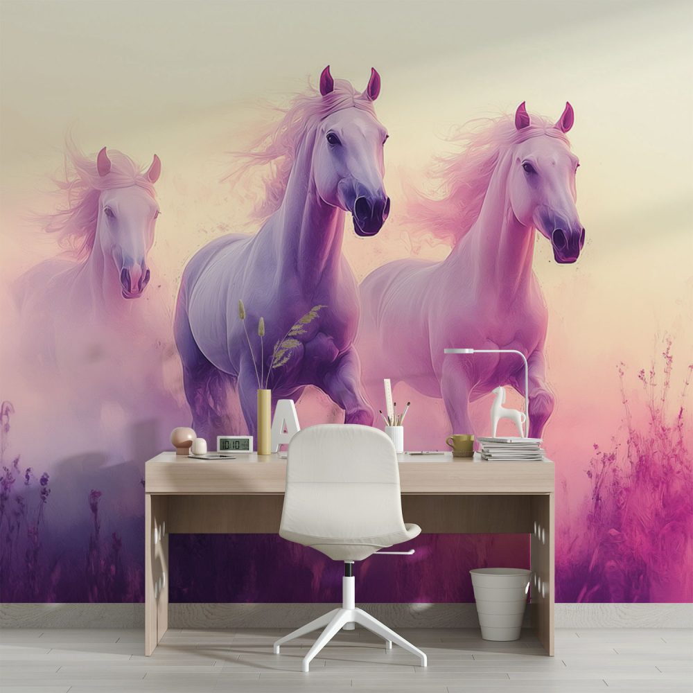 Witte paarden in paarse bloemen behang