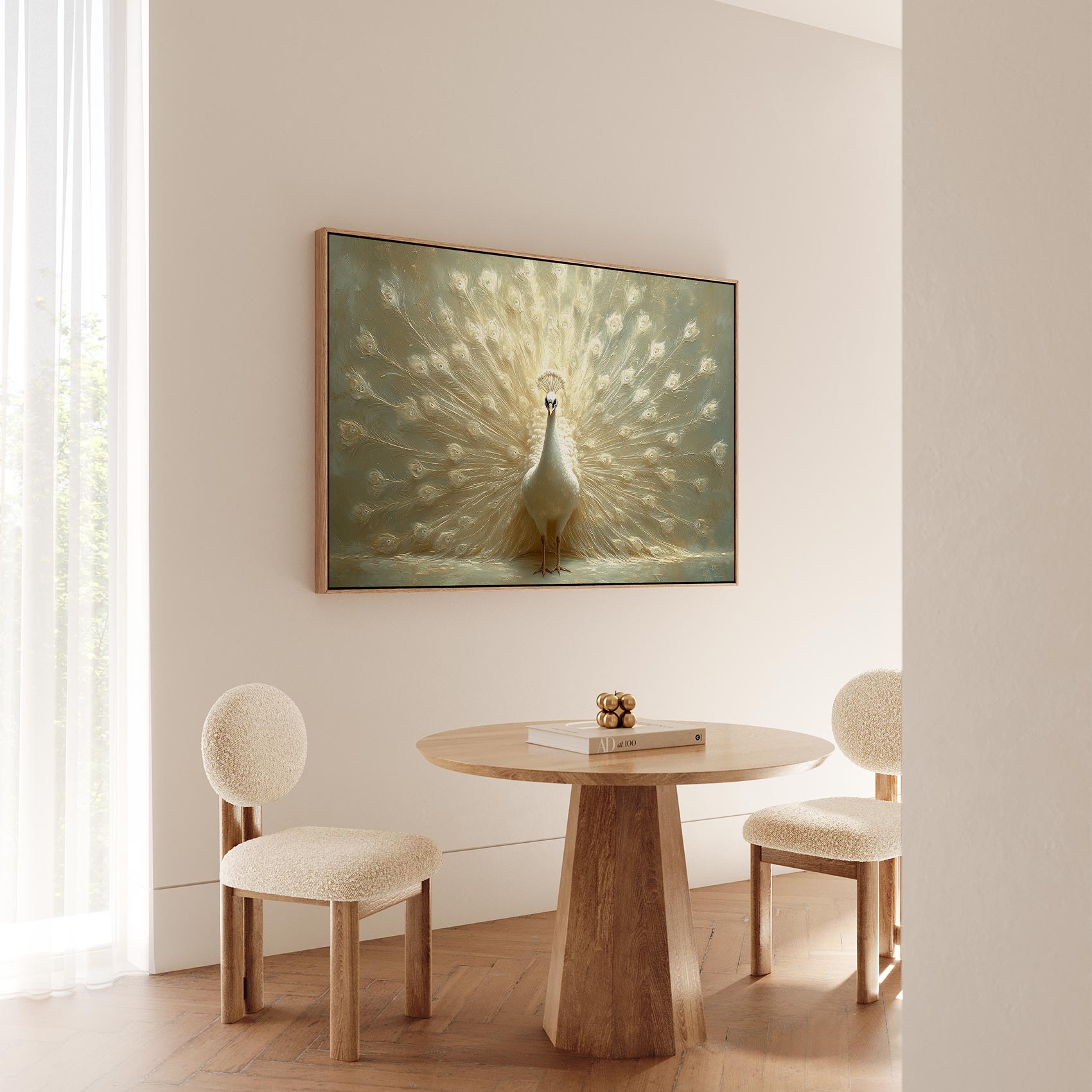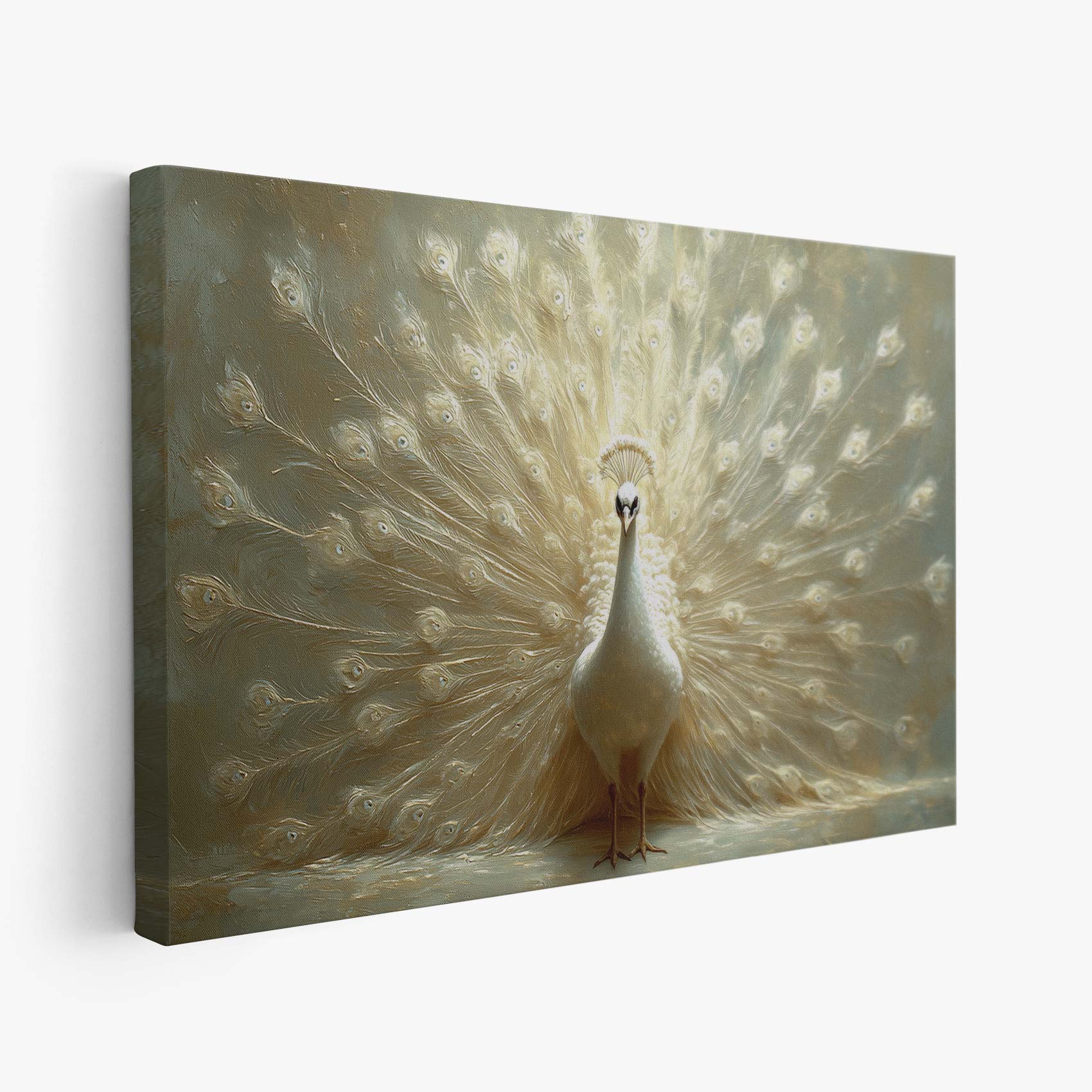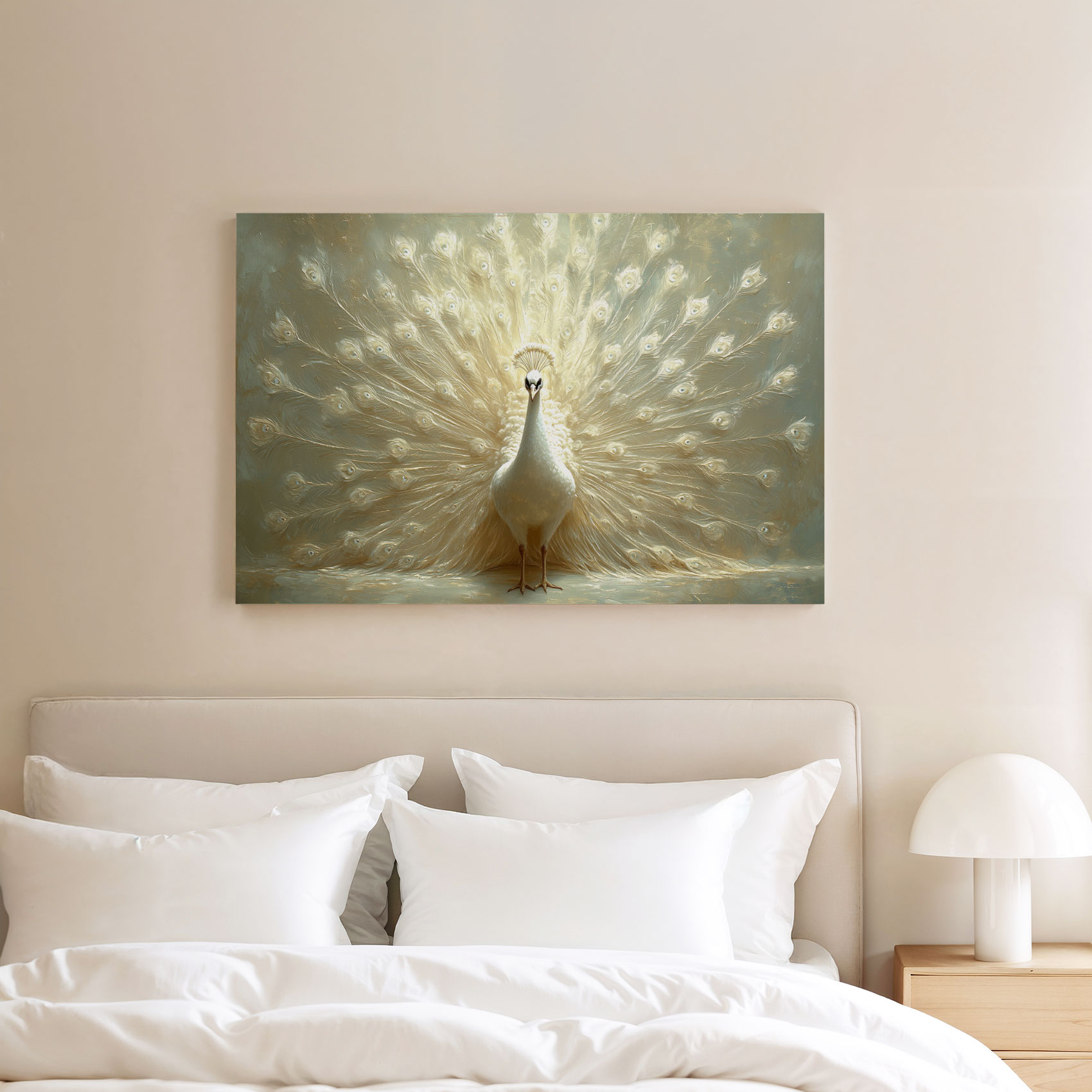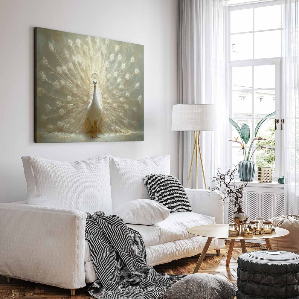 Terug naar collectie / Schilderijen / Dieren Schilderij / Witte pauw met prachtige veren